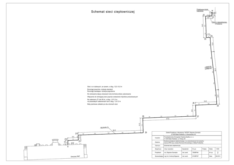 Projektowane trójniki DN65/65/65 1,5 1,8 1,5 1,0 Z2 W 2.9 Schemat sieci ciepłowniczej 5.8 Z1 p z 5,3 12,0 19.3 Zawory z odpowietrzeniem w studzience 3.5 Z4 1,5 12,0 12,0 13 .0 Z3 10,6 12,0 34 .6 z-DN65/160 p-DN65/140 Sieć z rur stalowych, ze szwem, o dług. 12,0 i 6,0 m 12,0 Do izolowania złączy stosować mufy termokurczliwe usieciowane Włączenie do istniejącej sieci poprzez wstawienie trójników preizolowanych Na załamaniu Z1 łuki 90 st. o dług. 1,0/1,5 m na pozostałych załamaniach łuki o dług. 1,0/1,0 m 13 .0 Rurociągi powrotne -izolacja standard Rurociągi zasilające -izolacja pogrubiona 19.0 Z6 Maty piankowe układać po obu stronach sieci 12,0 5,0 Z8 12,0 12,0 9,8 7,9 9.9 Z5 12,0 Z7 13.3 11,3 47.8 wg rysunku 1b 58.5 12,0 12,0 Z9 Zakład Projektowo -Montażowy "INTER" Zbigniew Szenejko 21-500 Biała Podlaska ul. Warszawska 4/5 Inwestor: Przedsiębiorstwo Energetyki Cieplnej Spółka z o. o. 21-500 Biała Podlaska ul. Pokoju 26 Z11 Zadanie: Budowa przyłącza ciepłowniczego z rur preizolowanych do budynku dworca PKP przy rondzie Romana Dmowskiego w Białej Podlaskiej Tytuł rys.: Schemat sieci ciepłowniczej Zespół aut.: Imię i nazwisko: Specjalność: Nr upr. Projektant: inż. Zbigniew Szenejko inst. sanit. inst. sanit. 7,5 2,9 3.9 8,5 12,0 4.5 9.5 Z12 2,5 Z10 12,0 B Dworzec PKP Sprawdzający: mgr inż. Andrzej Migasiuk Podpis: Skala: 1:500 769/BP/94 Nr rys. 2 810/BP/97 Data: 06.2013