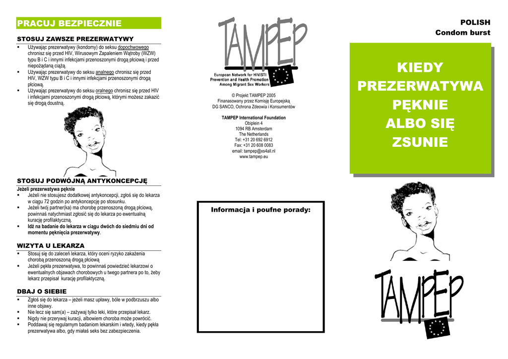 POLISH Condom burst PRACUJ BEZPIECZNIE STOSUJ ZAWSZE PREZERWATYWY Używając prezerwatywy (kondomy) do seksu dopochwowego chronisz się przed HIV, Wirusowym Zapaleniem Wątroby (WZW) typu B i C i innymi infekcjami przenoszonymi drogą płciową i przed niepożądaną ciążą. Używając prezerwatywy do seksu analnego chronisz się przed HIV, WZW typu B i C i innymi infekcjami przenoszonymi drogą płciową. Używając prezerwatywy do seksu oralnego chronisz się przed HIV i infekcjami przenoszonymi drogą płciową, którymi możesz zakazić się drogą doustną. © Projekt TAMPEP 2005 Finanasowany przez Komisję Europejską DG SANCO, Ochrona Zdeowia i Konsumentów TAMPEP International Foundation Obiplein 4 1094 RB Amsterdam The Netherlands Tel: +31 20 692 6912 Fax: +31 20 608 0083 email: [email protected] www.tampep.eu STOSUJ PODWÓJNĄ ANTYKONCEPCJĘ Jeżeli prezerwatywa pęknie Jeżeli nie stosujesz dodatkowej antykoncepcji, zgłoś się do lekarza w ciągu 72 godzin po antykoncepcję po stosunku. Jeżeli twój partner(ka) ma chorobę przenoszoną drogą płciową, powinnaś natychmiast zgłosić się do lekarza po ewentualną kurację profilaktyczną. Idź na badanie do lekarza w ciągu dwóch do siedmiu dni od momentu pęknięcia prezerwatywy. WIZYTA U LEKARZA Stosuj się do zaleceń lekarza, który oceni ryzyko zakażenia chorobą przenoszoną drogą płciową Jeżeli pękła prezerwatywa, to powinnaś powiedzieć lekarzowi o ewentualnych objawach chorobowych u twego partnera po to, żeby lekarz przepisał kurację profilaktyczną. DBAJ O SIEBIE Zgłoś się do lekarza – jeżeli masz upławy, bóle w podbrzuszu albo inne objawy. Nie lecz się sam(a) – zażywaj tylko leki, które przepisał lekarz. Nigdy nie przerywaj kuracji, albowiem choroba może powrócić. Poddawaj się regularnym badaniom lekarskim i wtedy, kiedy pękła prezerwatywa albo, gdy miałaś seks bez zabezpieczenia. Informacja i poufne porady: KIEDY PREZERWATYWA PĘKNIE ALBO SIĘ ZSUNIE KIEDY KONDOM ZAWIEDZIE Prezerwatywa może się zsunąć ponieważ: Nie jest rozwinięta aż do nasady członka. Jest za duża dla danego członka– możesz kupić prezerwatywy o małych rozmiarach. Członek nie jest w pełnym wzwodzie gdy nakładasz prezerwatywę. Kiedy zaczynasz uprawiać seks z klientem postaraj się, żeby członek byl maksymalnie twardy zanim nałożysz kondom i zanim nastąpi penetracja. Członek zwiotczał podczas stosunku. Stosunek trwa długo i jest za „ostry”. Członek jest grubszy u nasady niż na końcu. Klient ściągnął potajemnie prezerwatywę ponieważ chce mieć seks bez zabezpieczenia. Aby uniknąć tego, że prezerwatywa podejdzie do góry i się zsunie, albo że klient ją ściągnie potajemnie lub rozerwie, wiele prostytutek przytrzymuje kondom u nasady podczas stosunku – w ten sposób prezerwatywa nie może się zsunąć i pozostać w pochwie, ani klient nie ma do niej dostępu. Prezerwatywa może pęknąć ponieważ: Twoja pochwa jest sucha ponieważ nie używasz środka nawilżającego – stosuj zawsze żel nawilżający, który powoduje, że stosunek płciowy jest mniej bolesny i który zmniejsza ryzyko pęknięcia prezerwatywy. Stosujesz oliwkę dziecięcą, olejek do masażu, albo krem do rąk jako żel nawilżający – zawsze uzywaj żeli wyprodukowanych na bazie wody! Prezerwatywa jest stara – zawsze sprawdź datę ważności na opakowaniu! Prezerwatywa została zniszczona podczas otwierania przez twoje paznokcie, albo zęby – otwieraj opakowanie zawsze ostrożnie! Członek jest za duży na kondom, który stosujesz– możesz kupić prezerwatywy o dużych rozmiarach. Stosunek trwa długo albo jest za „ostry” – używaj zawsze dużo żelu nawilżającego, żeby uniknąć pęknięcia kondomu. Stosujesz dwie prezerwatywy nałożone jedna na drugą, sądząc, że w ten sposób będziesz lepiej zabezpieczona, lecz prezerwatywy mogą pęknąć na skutek pocierania jedna o drugą – używaj zawsze jedną prezerwatywę; jeżeli chcesz dodatkowego zabezpieczenia to stosuj prezerwatywę wzmocnioną. PRZERWIJ niezwłocznie stosunek, jeżeli czujesz, że prezerwatywa pękła albo się zsunęła! PRACUJ BEZPIECZNIE Jeżeli kondom się zsunął albo pękł i jeżeli klient miał wytrysk w twojej pochwie, to powinnaś: Zastosować antykoncepcję po stosunku jeżeli nie stosujesz żadnej dodatkowej antykoncepcji Pójść do lekarza na badanie w ciągu dwóch do siedmiu dni po stosunku ...jeżeli klient miał wytrysk w tobie SEKS DOPOCHWOWY Postaraj się usunąć spermę kucając i napinając mięśnie pochwy tak, żeby wydalić z siebie jak najwięcej nasienia. Podmyj się wodą o letniej temperaturze. NIE WYBIERAJ resztek spermy palcami ani czymś innym ponieważ możesz zranić ścianki pochwy i w ten sposób zwiększyć ryzyko infekcji. Zgłoś się do lekarza w ciągu dwóch do siedmiu dni od momentu pęknięcia prezerwatywy. SEKS DOODBYTNICZY Usiądź na sedesie i poprzez napinanie mięśni odbytu, staraj się wycisnąć nasienie ze swojej kiszki stolcowej. Umyj się wokół odbytu – NIGDY NIE PRZEPŁUKUJ KISZKI STOLCOWEJ – może to spowodować uszkodzenie delikatnej błony śluzowej, którą jest ona wyłożona i w ten sposób zwiększyć ryzyko infekcji. Jeżeli twój partner(ka) ma chorobę przenoszoną drogą płciową, powinnaś natychmiast zgłosić się do lekarza po kurację profilaktyczną. Zgłoś się do lekarza w ciągu dwóch do siedmiu dni od momentu pęknięcia prezerwatywy. SEKS ORALNY Wypluj spermę Wypłucz usta płynem do ust, albo roztworem soli. NIE MYJ zębów, ani NIE UŻYWAJ nitki dentystycznej przez przynajmniej godzinę. Zgłoś się do lekarza w ciągu dwóch do siedmiu dni od momentu pęknięcia prezerwatywy.