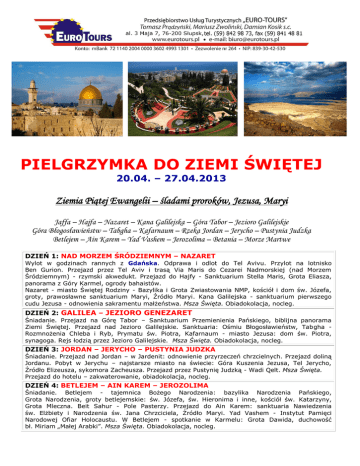 PIELGRZYMKA DO ZIEMI ŚWIĘTEJ 20.04. – 27.04.2013 Ziemia Piątej Ewangelii – śladami proroków, Jezusa, Maryi Jaffa – Hajfa – Nazaret – Kana Galilejska – Góra Tabor – Jezioro Galilejskie Góra Błogosławieństw – Tabgha – Kafarnaum – Rzeka Jordan – Jerycho – Pustynia Judzka Betlejem – Ain Karem – Yad Vashem – Jerozolima – Betania – Morze Martwe DZIEŃ 1: NAD MORZEM ŚRÓDZIEMNYM – NAZARET Wylot w godzinach rannych z Gdańska. Odprawa i odlot do Tel Avivu. Przylot na lotnisko Ben Gurion. Przejazd przez Tel Aviv i trasą Via Maris do Cezarei Nadmorskiej (nad Morzem Śródziemnym) - rzymski akwedukt. Przejazd do Hajfy - Sanktuarium Stella Maris, Grota Eliasza, panorama z Góry Karmel, ogrody bahaistów. Nazaret - miasto Świętej Rodziny - Bazylika i Grota Zwiastowania NMP, kościół i dom św. Józefa, groty, prawosławne sanktuarium Maryi, Źródło Maryi. Kana Galilejska - sanktuarium pierwszego cudu Jezusa - odnowienia sakramentu małżeństwa. Msza Święta. Obiadokolacja, nocleg. DZIEŃ 2: GALILEA – JEZIORO GENEZARET Śniadanie. Przejazd na Górę Tabor – Sanktuarium Przemienienia Pańskiego, biblijna panorama Ziemi Świętej. Przejazd nad Jezioro Galilejskie. Sanktuaria: Ośmiu Błogosławieństw, Tabgha Rozmnożenia Chleba i Ryb, Prymatu św. Piotra, Kafarnaum - miasto Jezusa: dom św. Piotra, synagoga. Rejs łodzią przez Jezioro Galilejskie. Msza Święta. Obiadokolacja, nocleg. DZIEŃ 3: JORDAN – JERYCHO – PUSTYNIA JUDZKA Śniadanie. Przejazd nad Jordan – w Jardenit: odnowienie przyrzeczeń chrzcielnych. Przejazd doliną Jordanu. Pobyt w Jerychu – najstarsze miasto na świecie: Góra Kuszenia Jezusa, Tel Jerycho, Źródło Elizeusza, sykomora Zacheusza. Przejazd przez Pustynię Judzką - Wadi Qelt. Msza Święta. Przejazd do hotelu – zakwaterowanie, obiadokolacja, nocleg. DZIEŃ 4: BETLEJEM – AIN KAREM – JEROZOLIMA Śniadanie. Betlejem - tajemnica Bożego Narodzenia: bazylika Narodzenia Pańskiego, Grota Narodzenia, groty betlejemskie: św. Józefa, św. Hieronima i inne, kościół św. Katarzyny, Grota Mleczna. Beit Sahur - Pole Pasterzy. Przejazd do Ain Karem: sanktuaria Nawiedzenia św. Elżbiety i Narodzenia św. Jana Chrzciciela, Źródło Maryi. Yad Vashem - Instytut Pamięci Narodowej Ofiar Holocaustu. W Betlejem - spotkanie w Karmelu: Grota Dawida, duchowość bł. Miriam „Małej Arabki”. Msza Święta. Obiadokolacja, nocleg. DZIEŃ 5: GÓRA OLIWNA – DROGA KRZYŻOWA Śniadanie. Kościół w Betfage - początek „procesji palmowej” Pana Jezusa. Na Górze Oliwnej miejsca święte i sanktuaria: Wniebowstąpienia Pana Jezusa, kościół Pater Noster („Ojcze nasz”), Panorama Jerozolimy, kaplica Dominus Flevit („Pan zapłakał”), cmentarz żydowski (najstarszy na świecie). Zejście do Getsemani - bazylika Agonii albo Wszystkich Narodów, Ogród Oliwny, Grota Zdrady, Grób NMP. Dolina Cedronu. Po południu - czas wolny. Następnie: Brama św. Szczepana, kościół św. Anny i sadzawka Betesda (Owcza). Droga Krzyżowa poprzez starą Jerozolimę – Via Crucis: od kościoła Flagellazio (Ubiczowania) do bazyliki Grobu Pańskiego (modlitwa na Kalwarii i w Grobie Świętym). Msza Święta. Powrót do hotelu, obiadokolacja, nocleg. DZIEŃ 6: BETANIA – MORZE MARTWE Śniadanie. Przejazd do Betanii – sanktuarium Wskrzeszenia Łazarza. Przejazd nad Morze Martwe, postój pod słynną twierdzą żydowską Masada. Odpoczynek nad Morzem Martwym - możliwość kąpieli i relaksu. Obiadokolacja, spotkanie z polskimi franciszkanami, nocleg. Msza Święta. DZIEŃ 7: JEROZOLIMA Śniadanie. Zwiedzanie Jerozolimy - Mur Płaczu, plac świątynny, dzielnice: Żydowska, Ormiańska i Chrześcijańska. Starożytne Cardo. Jerozolima epoki krzyżowców. Przejście na Syjon: Wieczernik miejsce Ostatniej Wieczerzy i Zesłania Ducha Św.: modlitwa do Ducha Świętego i za kapłanów, grób króla Dawida, bazylika i krypta Zaśnięcia NMP. Kościół św. Piotra in Gallicantu, makieta Jerozolimy, schody do sadzawki Siloe. Czas wolny. Msza Święta. Obiadokolacja, nocleg. DZIEŃ 8: POWRÓT DO POLSKI Śniadanie. Przejazd na lotnisko Ben Gurion, odprawa bagażowa i biletowa. Odlot do Gdańska Zakończenie pielgrzymki. TERMIN: 20.04. – 27.04.2013 CENA: 2.500 zł + 400 $ (+100 $ płatne u pilota) ŚWIADCZENIA: przelot samolotem: Gdańsk – Tel Aviv – Gdańsk; w Ziemi Świętej: przejazd autokarem klimatyzowanym; noclegi w hotelach *** w pokojach 2 - 3 os. z łazienkami; śniadania i obiadokolacje wg programu; każdego dnia będzie Msza Święta; zwiedzanie zgodnie z programem (kolejność może ulec zmianie); bilety wstępu wg programu, rejs statkiem przez Jezioro Galilejskie, taxi na Tabor; napiwki; ubezpieczenie NW i KL; opieka przewodnika. !!! UWAGA !!! Uczestnik musi posiadać paszport ważny min. 6 miesięcy od daty powrotu do Polski (BEZ PIECZĄTEK Z LIBANU, SYRII). ZAPISY