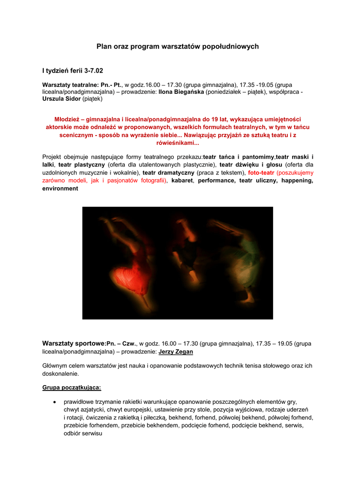 Plan oraz program warsztatów popołudniowych I tydzień ferii 3-7.02 Warsztaty teatralne: Pn.- Pt., w godz.16.00 – 17.30 (grupa gimnazjalna), 17.35 -19.05 (grupa licealna/ponadgimnazjalna) – prowadzenie: Ilona Biegańska (poniedziałek – piątek), współpraca Urszula Sidor (piątek) Młodzież – gimnazjalna i licealna/ponadgimnazjalna do 19 lat, wykazująca umiejętności aktorskie może odnaleźć w proponowanych, wszelkich formułach teatralnych, w tym w tańcu scenicznym - sposób na wyrażenie siebie... Nawiązując przyjaźń ze sztuką teatru i z rówieśnikami... Projekt obejmuje następujące formy teatralnego przekazu:teatr tańca i pantomimy,teatr maski i lalki, teatr plastyczny (oferta dla utalentowanych plastycznie), teatr dźwięku i głosu (oferta dla uzdolnionych muzycznie i wokalnie), teatr dramatyczny (praca z tekstem), foto-teatr (poszukujemy zarówno modeli, jak i pasjonatów fotografii), kabaret, performance, teatr uliczny, happening, environment Warsztaty sportowe:Pn. – Czw., w godz. 16.00 – 17.30 (grupa gimnazjalna), 17.35 – 19.05 (grupa licealna/ponadgimnazjalna) – prowadzenie: Jerzy Zegan Głównym celem warsztatów jest nauka i opanowanie podstawowych technik tenisa stołowego oraz ich doskonalenie. Grupa początkująca: prawidłowe trzymanie rakietki warunkujące opanowanie poszczególnych elementów gry, chwyt azjatycki, chwyt europejski, ustawienie przy stole, pozycja wyjściowa, rodzaje uderzeń i rotacji, ćwiczenia z rakietką i piłeczką, bekhend, forhend, półwolej bekhend, półwolej forhend, przebicie forhendem, przebicie bekhendem, podcięcie forhend, podcięcie bekhend, serwis, odbiór serwisu Grupa średniozaawansowana topspin forhendowy, topspin bekhendowy, blokowanie piłek topspinowych, uderzenie kończące z forhendu, bekhendu, obrona lobami z forhendu, bekhendu, sposoby rozgrywania akcji Równolegle uczestnikom zajęć proponujemy gry świetlicowe: bilard, dart, stolik piłkarski. Uczniowie, którzy ukończyli 14 lat mogą skorzystać z siłowni. Zajęcia odbywają się pod opieką nauczyciela i są dostosowane do indywidualnych możliwości uczestnika. II tydzień ferii 10 -14.02 Warsztaty teatralne: Pn.-Pt. prowadzenie:Ilona Biegańska (poniedziałek-piątek), Urszula Sidor (wtorek-piątek).Godziny oraz program jak w pierwszym tygodniu ferii. Warsztaty teatralne: Czw.- Pt., w godz. 16.00 – 17.30 (grupa gimnazjalna), 17.35 – 19.05(grupalicealna/ponadgimnazjalna) - prowadzenie:Dorota Sobierańska Program: Teatr słowa - czytanie scenariusza - praca nad dykcją - ćwiczenia aktorskie - budowanie -sztuki teatralnej. Warsztaty sportowe: Pn.- Pt., w godz. 17.30 – 19.00 ( grupa łączona–gimnazjalna, licealna /ponadgimnazjalna) – prowadzenie:Andrzej Seifert Program: Tenis stołowy:doskonalenie poznanych elementów technicznych - Wewnętrzny Turniej Tenisa Stołowego. Siłownia: ćwiczenia ogólnorozwojowe wzmacniające wszystkie partie mięśniowe. Warsztaty dziennikarskie: Śr. w godz. 16.00-17.30 (grupa gimnazjalna), 17.35-19.05 ( grupa licealna/ponadgimnazjalna) Czw. w godz. 16.00 – 19.05(grupa licealna/ponadgimnazjalna) prowadzenie: Marlena Kompowska łączona – gimnazjalna, Środa: Grupa I- Jakie cechy powinien mieć dobry dziennikarz (konkurs z nagrodami). Jak umówić się na wywiad ze znanym politykiem (nauka poprzez zabawę – dramy). Grupa II - Jakie cechy powinien mieć dobry dziennikarz (konkurs z nagrodami). Sesja Maestro metoda przygotowująca do zrobienia dobrego materiału prasowego np. napisania artykułu o kwestiach dot. młodzieży Czwartek: Grupa łączona I i II: - Jak przygotować się do robienia wywiadu z tak zwanym ciekawym człowiekiem (np. znana aktorka lub muzyk rockowy) i jak przeprowadzić ten wywiad. Nauka poprzez zabawę dramy. W przerwie zabawy ruchowe połączone z konkursem dotyczącym znajomości kultury masowej.