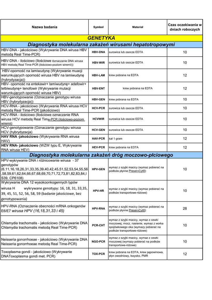 Nazwa badania Materiał Symbol Czas oczekiwania w dniach roboczych GENETYKA Diagnostyka molekularna zakażeń wirusami hepatotropowymi HBV-DNA - jakościowo (Wykrywanie DNA wirusa HBV metodą Real Time-PCR) HBV-DNA - ilościowo (Ilościowe oznaczanie DNA wirusa HBV metodą Real Time-PCR (ilościowo-poziom wiremii)) HBV-oporność na lamiwudynę (Wykrywanie muacji warunkujących oporność wirusa HBV na lamiwudynę (hybrydyzacja)) HBV- oporność na entekawir+ lamiwudynę+ adefowir+ telbiwudynę+ tenofowir (Wykrywanie mutacji warunkujących oporność wirusa HBV) HBV-genotypowanie (Oznaczanie genotypu wirusa HBV (hybrydyzacja)) HCV-RNA - jakościowo (Wykrywanie RNA wirusa HCV metodą Real Time-PCR (jakościowo) HCV-RNA - ilościowo (Ilościowe oznaczanie RNA wirusa HCV metodą Real Time-PCR (ilościowo-poziom HBV-DNA surowica lub osocze EDTA 10 HBV-WIR surowica lub osocze EDTA 10 HBV-LAM krew pobrana na EDTA 12 krew pobrana na EDTA HBV-ENT 12 HBV-GEN krew pobrana na EDTA 10 HCV-PCR surowica lub osocze EDTA 10 HCVWIR surowica lub osocze EDTA 10 HCV-GEN surowica lub osocze EDTA 10 HAV-PCR kał 1 gram 12 HEV-PCR krew pobrana na EDTA 12 wiremii) HCV-genotypowanie (Oznaczanie genotypu wirusa HCV (hybrydyzacja) HAV RNA -jakościowo (Wykrywanie RNA wirusa HAV) HEV RNA- jakościowo (WZW typu E, Wykrywanie RNA wirusa HEV) Diagnostyka molekularna zakażeń dróg moczowo-płciowego HPV-wykrywanie DNA i różnicowanie wirusa - 37 genotypów (6,11,16,18,26,31,33,35,39,40,42,45,51,52,53,54,55,56 ,58,59,61,62,64,66,67,68,69,70,71,72,73,81,82,83,84,I S39, CP6108) Wykrywanie DNA 12 wysokoonkogennych typów HPV-GEN wymaz z szyjki macicy (wymaz pobierać na podłoże płynne PreservCyt®) 10 HPV-HR wymaz z szyjki macicy (wymaz pobierać na podłoże transportowe-różowe) 10 HPV-RNA wymaz z szyjki macicy (wymaz pobierać na podłoże płynne PreservCyt®) 28 Chlamydia trachomatis - jakościowo (Wykrywanie DNA Chlamydia trachomatis metodą Real Time-PCR) PCR-CHT wymaz z szyjki macicy, wymaz z cewki moczowej, mocz, nasienie, wymaz z worka spojówkowego oka (wymazy pobierać na podłoże transportowe-różowe) 10 Neisseria gonorrhoeae - jakościowo (Wykrywanie DNA Neisseria gonorrhoeae metodą Real Time-PCR) NGO-PCR wymaz z szyjki macicy, wymaz z cewki moczowej (wymazy pobierać na podłoże transportowe-różowe) 10 Toxoplasma gondi - jakościowo (Wykrywanie DNAToxoplasma gondi met. PCR) TOX-PCR krew pobrana na EDTA, krew pępowinowa, płyn owodniowy, łozysko, PMR 12 wirusa HPV, wykrywane genotypy: 16, 18, 31, 33,35, 39, 45, 51, 52, 56, 58, 59 (badanie jakościowe, bez genotypowania) HPV-RNA (Oznaczenie obecności mRNA onkogenów E6/E7 wirusa HPV (16,18,31,33 i 45) Chlamydia trachomatis/ Mycoplasma genitalium/ Mycoplasma hominis/ Ureaplasma sp. - jakościowo (Wykrywanie DNA Chlamydia trachomatis/ Mycoplasma genitalium/ Mycoplasma hominis/ Ureaplasma sp. metodą Real Time-PCR) MCU-MLX wymaz z szyjki macicy, wymaz z cewki moczowej, mocz, nasienie (wymazy pobierać na podłoże transportowe-różowe) 10 Pakiet MCU-HPV: HPV-HR/Chlamydia trachomatis/ Mycoplasma genitalium/ Mycoplasma hominis/ Ureaplasma sp. - jakościowo (Wykrywanie DNA Chlamydia trachomatis/ Mycoplasma genitalium/ Mycoplasma hominis/ Ureaplasma sp. metodą Real Time-PCR oraz wykrywanie DN MCU-HPV wymaz z szyjki macicy (wymazy pobierać na podłoże transportowe-różowe) 10 Pakiet MCU-HSV: HSV typ 1 oraz 2/Chlamydia trachomatis/ Mycoplasma genitalium/ Mycoplasma hominis/ Ureaplasma sp. - jakościowo (Wykrywanie DNA HSV typ 1 oraz 2/Chlamydia trachomatis/ Mycoplasma genitalium/ Mycoplasma hominis/ Ureaplasma sp. metodą Real Ti MCU-HSV wymaz szyjki macicy (wymazy pobierać na podłoże transportowe-różowe) 10 Parwowirus B19 - Wykrywanie DNA Parwowirusa B19 PAR-PCR osocze EDTA 10 Diagnostyka molekularna zakażeń układu oddechowego Chlamydophila pneumoniae/ Mycoplasma pneumoniae jakościowo (Wykrywanie DNA Chlamydophila pneumoniae Grypy A i B oraz A/H1N1 -RNA - jakościowo (Wykrywanie RNA i różnicowanie wirusa grypy A i B podtypowanie wirusa w kierunku A/H1N1 metodą Real Time-PCR) oraz CHP-MLX AH1N1 popłuczyny pęcherzykowo-oskrzelikowe, wymaz z gardła i z nosa, plwocina wymaz z gardła i z nosa 10 4 Pneumocystis jiroveci-DNA - jakościowo (Wykrywanie DNA Pneumocystis jiroveci metodą Real Time-PCR) PNE-DNA popłuczyny pęcherzykowo-oskrzelikowe, wymaz z gardła i z nosa, plwocina 10 Bordetella pertussis-DNA- jakościowo (Wykrywanie DNA Bordetella pertusis (krztusiec) met. PCR) KRZ-PCR wymaz z nosa z głebokiego pobrania 12 TBC-GEN materiał właściwy dla miejsca zakażenia 12 LEG-PCR plwocina, BAL 12 Mycobacterium tuberculosis complex - diagnostyka gruźlicy - wykrywanie DNA M. tuberculosis complex Legionella pneumophila - test genetyczny Diagnostyka molekularna zakażeń ogólnoustrojowych HSV-typ 1 i 2 - DNA- jakościowo (Wykrywanie DNA oraz różnicowanie typów 1 i 2 wirusa HSV metodą Real Time-PCR) HSV-PCR płyn mózgowo-rdzeniowy, wymaz z miejsc chorobowo zmienionych (różowe podłoże transportowe), płyn owodniowy 10 CMV- DNA-jakościowo (Wykrywanie DNA wirusa CMV metodą Real Time-PCR (jakościowo) CMV-PCR krew EDTA, osocze, surowica, płyn mózgowo rdzeniowy, płyn owodniowy, mocz 10 CMV-DNA- ilosciowo (Ilościowe oznaczanie DNA wirusa CMV metodą Real Time-PCR) CMV-WIR krew EDTA, osocze, surowica, płyn mózgowo-rdzeniowy 10 EBV-DNA - jakościowo (Wykrywanie DNA wirusa EBV metodą Real Time-PCR (jakościowo) EBVPCRJ krew EDTA, osocze, surowica, płyn mózgowo-rdzeniowy 10 EBV-DNA - ilościowo (Ilościowe oznaczanie DNA wirusa EBV metodą Real Time-PCR) HIV RNA - ilościowo (poziom wiremii) HIV weryfikacja met.PCR (jakościowo) EBVPCRI krew EDTA, osocze, surowica, płyn mózgowo-rdzeniowy HIV-WIR krew EDTA HIV-PCR krew EDTA 12 12 Wirus BK (poliomawirus) met. PCR BK-WIRU krew EDTA, płyn mózgowo-rdzeniowy, mocz (2 ml) 12 Wirus JC (poliomavirus) met. PCR JC-WIRU krew EDTA, płyn mózgowo-rdzeniowy (2 ml) 12 CAN-PCR krew EDTA l