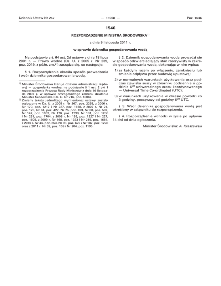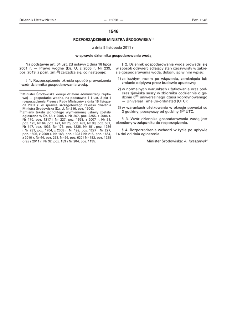 Dziennik Ustaw Nr 257 — 15098 — Poz. 1546 1546 ROZPORZĄDZENIE MINISTRA ŚRODOWISKA1) z dnia 9 listopada 2011 r. w sprawie dziennika gospodarowania wodą Na podstawie art. 64 ust. 2d ustawy z dnia 18 lipca 2001 r. — Prawo wodne (Dz. U. z 2005 r. Nr 239, poz. 2019, z późn. zm.2)) zarządza się, co następuje: § 2. Dziennik gospodarowania wodą prowadzi się w sposób odzwierciedlający stan rzeczywisty w zakresie gospodarowania wodą, dokonując w nim wpisu: § 1. Rozporządzenie określa sposób prowadzenia i wzór dziennika gospodarowania wodą. 1) za każdym razem po włączeniu, zamknięciu lub zmianie odpływu przez budowlę upustową; 1) Minister Środowiska kieruje działem administracji rządowej — gospodarka wodna, na podstawie § 1 ust. 2 pkt 1 rozporządzenia Prezesa Rady Ministrów z dnia 16 listopada 2007 r. w sprawie szczegółowego zakresu działania Ministra Środowiska (Dz. U. Nr 216, poz. 1606). 2) Zmiany tekstu jednolitego wymienionej ustawy zostały ogłoszone w Dz. U. z 2005 r. Nr 267, poz. 2255, z 2006 r. Nr 170, poz. 1217 i Nr 227, poz. 1658, z 2007 r. Nr 21, poz. 125, Nr 64, poz. 427, Nr 75, poz. 493, Nr 88, poz. 587, Nr 147, poz. 1033, Nr 176, poz. 1238, Nr 181, poz. 1286 i Nr 231, poz. 1704, z 2008 r. Nr 199, poz. 1227 i Nr 227, poz. 1505, z 2009 r. Nr 168, poz. 1323 i Nr 215, poz. 1664, z 2010 r. Nr 44, poz. 253, Nr 96, poz. 620 i Nr 182, poz. 1228 oraz z 2011 r. Nr 32, poz. 159 i Nr 204, poz. 1195. 2) w normalnych warunkach użytkowania oraz podczas zjawiska suszy w zbiorniku codziennie o godzinie 600 uniwersalnego czasu koordynowanego — Universal Time Co-ordinated (UTC); 3) w warunkach użytkowania w okresie powodzi co 3 godziny, począwszy od godziny 600 UTC. § 3. Wzór dziennika gospodarowania wodą jest określony w załączniku do rozporządzenia. § 4. Rozporządzenie wchodzi w życie po upływie 14 dni od dnia ogłoszenia. Minister Środowiska: A. Kraszewski WZÓR Załącznik do rozporządzenia Ministra Środowiska z dnia 9 listopada 2011 r. (poz. 1546) Dziennik Ustaw Nr 257 — 15099 — Poz. 1546 O b j a śn ie n ia : 1) W dzienniku gospodarowania wodą dane i informacje umieszczone nad tabelą dziennika zamieszcza się na stronie pierwszej dziennika. 2) Przepływ nienaruszalny. 3) Przepływ gwarantowany. 4) Przepływ dozwolony. 5) Minimalny poziom piętrzenia. 6) Normalny poziom piętrzenia. 7) Maksymalny poziom piętrzenia. 8) Nadzwyczajny poziom piętrzenia. 9) Pojemność martwa zbiornika. 10) Pojemność użytkowa. 11) Pojemność powodziowa stała. 12) Pojemność powodziowa forsowana. 13) Wielkość wykorzystania charakterystycznych dla gospodarowania wodą pojemności określonych na podstawie pomiaru. 14) Wielkość dopływu w czasie pomiaru w punktach kontrolnych lub obliczona z bilansu. 15) Wielkość odpływu w czasie pomiaru przez każde urządzenie upustowe. 16) Wielkość średnich dobowych odpływów do odbiorników oraz wielkość średnich dobowych poborów wody przez poszczególne zakłady, liczona za okres od godz. 6.00 UTC do godz. 6.00 UTC następnego dnia. 17) W kolumnie „Uwagi” zamieszcza się dane dotyczące warunków istotnych dla gospodarowania wodą na urządzeniu piętrzącym, na przykład zjawiska lodowe, tworzenie przepływem dozwolonym dodatkowej pojemności powodziowej. 18) Rzędna stanu wody górnej. 19) Rzędna stanu wody dolnej. 20) Suma wykorzystanych pojemności określonych na podstawie pomiarów (suma pojemności wyrażonej w kolumnach 5—8). 21) Pojemność pozostała w dyspozycji, pozwalająca na redukowanie fali powodziowej, stanowiąca różnicę pomiędzy pojemnością przy Nad PP a pojemnością wykorzystaną. Dziennik Ustaw Nr 257 — 15100 — Poz. 1546