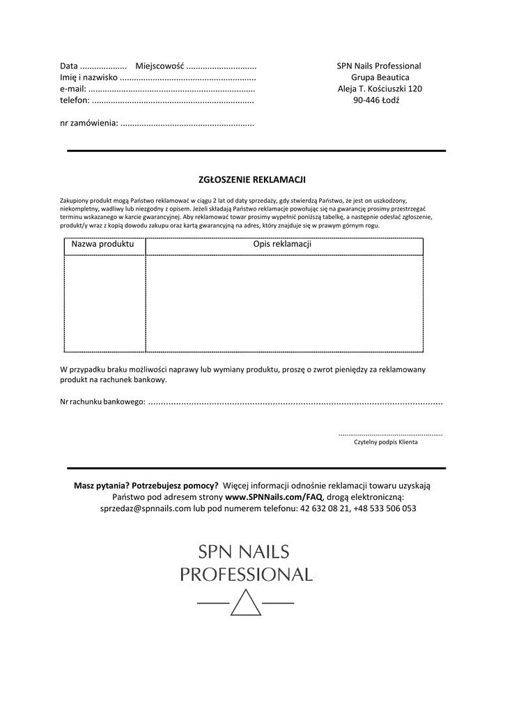 Data .................... Miejscowość .............................. Imię i nazwisko .......................................................... e-mail: ....................................................................... telefon: ..................................................................... SPN Nails Professional Grupa Beautica Aleja T. Kościuszki 120 90-446 Łodź nr zamówienia: ......................................................... ZGŁOSZENIE REKLAMACJI Zakupiony produkt mogą Państwo reklamować w ciągu 2 lat od daty sprzedaży, gdy stwierdzą Państwo, że jest on uszkodzony, niekompletny, wadliwy lub niezgodny z opisem. Jeżeli składają Państwo reklamacje powołując się na gwarancję prosimy przestrzegać terminu wskazanego w karcie gwarancyjnej. Aby reklamować towar prosimy wypełnić poniższą tabelkę, a następnie odesłać zgłoszenie, produkt/y wraz z kopią dowodu zakupu oraz kartą gwarancyjną na adres, który znajduje się w prawym górnym rogu. Nazwa produktu Opis reklamacji W przypadku braku możliwości naprawy lub wymiany produktu, proszę o zwrot pieniędzy za reklamowany produkt na rachunek bankowy. Nr rachunku bankowego: .................................................................................................................... ...................................................... Czytelny podpis Klienta Masz pytania? Potrzebujesz pomocy? Więcej informacji odnośnie reklamacji towaru uzyskają Państwo pod adresem strony www.SPNNails.com/FAQ, drogą elektroniczną: [email protected] lub pod numerem telefonu: 42 632 08 21, +48 533 506 053