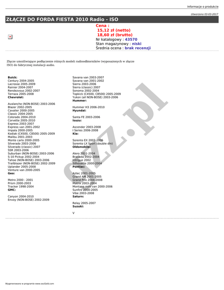 Informacje o produkcie Utworzono 03-03-2017 ZŁĄCZE DO FORDA FIESTA 2010 Radio - ISO Cena : 15,12 zł (netto) 18,60 zł (brutto) Nr katalogowy : 43570 Stan magazynowy : niski Średnia ocena : brak recenzji Złącze umożliwiające podłączenie różnych modeli radioodbiorników (wyposażonych w złącze ISO) do fabrycznej instalacji audio. Hummer H3 2006-2010 Hyundai: Santa FE 2003-2006 Isuzu: Ascender 2003-2008 I Series 2006-2008 Kia: Sorento EX 2003-2006 Sorento LX Sport (double din) Oldsmobile: gz z Avalanche (NON-BOSE) 2003-2006 Blazer 2002-2005 Cavalier 2000-2005 Classic 2004-2005 Colorado 2004-2010 Corvette 2005-2010 Express 2003-2007 Express van 2001-2002 Impala 2000-2005 Kodiak (C4500, C8500) 2005-2009 Malibu 2001-2003 Monte carlo 2000-2005 Silverado 2003-2006 Silverado (classic) 2007 SSR 2003-2006 Suburban (NON-BOSE) 2003-2006 S-10 Pickup 2002-2004 Tahoe (NON-BOSE) 2003-2006 Trailblazer (NON-BOSE) 2002-2009 Uplander 2005-2008 Venture van 2000-2005 Geo: Savana van 2003-2007 Savana van 2001-2002 Sierra 2003-2006 Sierra (classic) 2007 Sonoma 2002-2004 Topkick (C4500, C8500) 2005-2009 Yukon (all NON-BOSE) 2003-2006 Hummer: .p l Buick: Century 2004-2005 Lacrosse 2005-2009 Rainier 2004-2007 Rendezvous 2002-2007 Terraza 2005-2008 Chevrolet: Metro 2000 - 2001 Prism 2000-2003 Tracker 1998-2004 GMC: Canyon 2004-2010 Envoy (NON-BOSE) 2002-2009 Alero 2001-2004 Bravada 2002-2004 Intrigue 2002 Silhouette 2000-2004 Pontiac: Aztec 2001-2005 Grand AM 2001-2005 Grand Prix 2004-2008 Matrix 2003-2004 Montana mini van 2000-2006 Sunfire 2000-2005 Vibe 2003-2008 Saturn: Relay 2005-2007 Suzuki: V Wygenerowano w programie www.oscGold.com