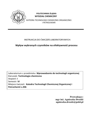 POLITECHNIKA ŚLĄSKA WYDZIAŁ CHEMICZNY KATEDRA TECHNOLOGII CHEMICZNEJ ORGANICZNEJ I PETROCHEMII INSTRUKCJA DO ĆWICZEŃ LABORATORYJNYCH: Wpływ wybranych czynników na efektywność procesu Laboratorium z przedmiotu: Wprowadzenie do technologii organicznej Kierunek: Technologia chemiczna Stopień: I Semestr: VI Miejsce ćwiczeń: Katedra Technologii Chemicznej Organicznej i Petrochemii s.206 Prowadzący: mgr inż. Agnieszka Drożdż [email protected] 1. Wprowadzenie 1.1. Zasady technologiczne Można wyróżnić 5 zasad technologicznych: a) Najlepszego wykorzystania różnic potencjałów, b) Najlepszego wykorzystania surowców, c) Najlepszego wykorzystania energii, d) Najlepszego wykorzystania aparatury, e) Umiaru technologicznego. Ad. a) Zasada najlepszego wykorzystania różnic potencjałów: Zasada ta polega na jak najlepszym wykorzystaniu siły napędowej, gwarantującej szybki przebieg procesu. Siłę napędową stanowi różnica potencjałów charakteryzująca oddalenie układu od stanu równowagi np. różnica stężeń reagentów, różnica temperatury. Ad. b) Najlepszego wykorzystania surowców: Zasada ta polega na doborze odpowiedniego surowca, z którego można z jak najwyższą selektywnością i wydajnością, przy najmniejszym zużyciu energii otrzymać końcowy produkt. Najlepszy surowiec to taki, który jest tani, łatwo dostępny, nie jest uciążliwy dla środowiska i nie prowadzi do powstawania produktów ubocznych, odpadowych chyba, że można je w racjonalny sposób zagospodarować. Ad. c) Najlepszego wykorzystania energii: Zasada ta polega na jak najlepszym wykorzystaniu energii w całym procesie, aby zwiększyć efektywność energetyczną tego procesu. Na przykład, jeżeli w procesie zachodzi reakcja egzotermiczna to jej ciepło wykorzystuje się np. do wstępnego ogrzewania surowców lub do produkcji pary wodnej. Innym przykładem obniżenia zużycia energii jest zastosowanie destylacji katalitycznej (reakcyjnej), która polega na prowadzeniu w jednym aparacie reakcji oraz destylacji jej produktu. Ad. d) Najlepszego wykorzystania aparatury: Zasada ta polega na zwiększeniu do maksimum wydajności produktu uzyskiwanego z jednostki objętości aparatury. Przykładem może być zapewnienie jak najlepszego transportu masy i ciepła poprzez zwiększenie kontaktu faz (głównie dla procesów, których szybkość kontrolowana jest przez opory masy i ciepła). Inny przykład to prowadzenie procesu w sposób ciągły, w których osiąga się najlepsze wykorzystanie aparatury w porównaniu z procesami prowadzonymi w sposób okresowy. Ad e) Umiaru technologicznego: Zasada ta polega na stosowaniu optymalnych parametrów dla danego procesu, które są zawsze kompromisem pomiędzy czynnikami wybranymi w pozostałych wyżej wymienionych zasadach. Nie ma koncepcji chemicznej i technologicznej bezwzględnie najlepszej, lecz jedynie najlepsze dla uwarunkowań występujących w określonym miejscu i czasie. 1.2. Kinetyka chemiczna Jeżeli reakcja chemiczna przebiega w układzie zamkniętym, w stałej objętości, w sposób nieodwracalny i ilościowy wg równania stechiometrycznego: a1A1 + a2A2 + .... b1B1 + b2B2 + .... to szybkość reakcji r jest miarą zmiany stężenia substratów lub produktów w zależności od czasu: r d[ A i ] d[Bi ] a i dt b i dt gdzie: ai, bi – współczynniki stechiometryczne reagentów, Ai – substraty, Bi – produkty, [Ai], [Bi] – stężenia reagentów. Równanie kinetyczne opisujące zależność szybkości reakcji od stężeń reagentów można zapisać w postaci: r = k[A1]x[A2]y[A3]z... gdzie: x, y, z... – wykładniki potęgowe, niewielkie liczby całkowite, Rząd reakcji definiuje się jako sumę liczb x, y, z... Każdy wykładnik potęgowy x, y, z... określa rząd reakcji względem tego składnika, przy stężeniu którego występuje. k – stała szybkości reakcji - jest ona równa szybkości reakcji r wtedy, gdy wszystkie czynniki występujące w równaniu szybkości mają stężenia jednostkowe. Nie zależy ona od stężeń reagujących substancji, ale zależy od rodzaju reakcji, temperatury, katalizatorów. Wymiar stałej szybkości zależy od rzędu reakcji. Kinetyka chemiczna zajmuje się przebiegiem reakcji chemicznych w czasie oraz badaniem wpływu parametrów na szybkość reakcji. Na szybkość reakcji może mieć wpływ wiele parametrów. Należą do nich przede wszystkim stężenia lub ciśnienia cząstkowe reagentów, ale także m. in. temperatura, rozpuszczalnik, obecność soli, katalizatory, kształt naczynia, szybkość mieszania, struktura reagentów. Wpływy tych parametrów wyznacza się doświadczalnie. Wpływ temperatury: Wpływ temperatury na szybkość reakcji określa równianie Arrheniusa: ln k ln A k Ae EA RT EA RT k – stała szybkości w temperaturze bezwzględnej T, R – uniwersalna stała gazowa, EA – energia aktywacji Arrheniusa, A – współczynnik częstotliwości lub czynnik przedwykłaniczy (przedekspotencjalny). Wpływ rozpuszczalnika: Wiele reakcji organicznych przebiega w fazie ciekłej, gdzie reagenty rozpuszczone są w rozpuszczalniku. W fazie ciekłej cząsteczki reagentów i rozpuszczalników znajdują się w ścisłym kontakcie i między nimi działają siły wzajemnego oddziaływania. Oddziaływania między te mogą często w istotny sposób wpływać na przebieg reakcji chemicznej. Natura tych sił jest bardzo różnorodna i często trudna do określenia. 1.3. Procesy heterogeniczne Procesem heterogenicznym nazywa się proces, w którym reagenty występują w różnych fazach. W procesie heterogenicznym reakcja chemiczna zachodzi na powierzchni zetknięcia się faz, w których znajdują się reagenty. W związku z tym na ogólną szybkość procesu heterogenicznego będą miały wpływ zarówno parametry wpływające na transport masy, jak i reakcję chemiczną. Szybkość ogólna heterogenicznego procesu będzie określana względnymi szybkościami poszczególnych stadiów i jest ogra