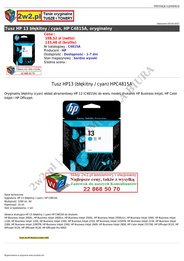 Informacje o produkcie Utworzono 03-03-2017 Tusz HP 13 błękitny / cyan, HP C4815A, oryginalny Cena : 108,52 zł (netto) 133,48 zł (brutto) IU R A Nr katalogowy : C4815A Producent : HP Dostępność : Dostępność - 1-7 dni Stan magazynowy : bardzo wysoki Średnia ocena : B Tusz HP13 (błękitny / cyan) HPC4815A 2w 2. pl | D LA D O M U iD LA Oryginalny błękitny (cyan) wkład atramentowy HP 13 (C4815A) do wielu modeli drukarek HP Business Inkjet, HP Color InkJet i HP Officejet. Dane techniczne: Sygnatura: HP 13 (błękitny / cyan) / HP C4815A Wydajność: 1200 str. A4 Pojemność: 14 ml Ilość w opakowaniu: 1 szt. Głowica drukująca HP 13 (błękitny / cyan) HP C4815A do drukarki: HP Business Inkjet 2000c, HP Business Inkjet 2000cn, HP Business Inkjet 2500c, HP Business Inkjet 2500c/cn, HP Business Inkjet 1000, HP Business Inkjet 1100, HP Business Inkjet 1200, HP Business InkJet 2200, HP Business Inkjet 2250, HP Business Inkjet 2250TN, HP Business InkJet 2230, HP Business Inkjet 2280, HP Business Inkjet 2280TN, HP Business InkJet 2300, HP Business Inkjet 2600, HP Business Inkjet 2800, HP Color InkJet CP1700, HP Officejet 9110, HP Officejet 9120, HP Officejet 9130, HP OfficeJet Pro K850 Tusze do HP Business Inkjet 1000 Wygenerowano w programie www.oscGold.com