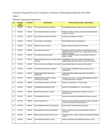 Narodowy Program Rozwoju Czytelnictwa, Priorytet 2 Infrastruktura bibliotek 2016-2020 Nabór 1 Wnioski rozpatrzone negatywnie Lp. Nr wniosku 1. Nr miejsca (liczba punktów) 35(70.60) Wnioskodawca Temat/nazwa/opis wniosku (czego dotyczy) 00061/16 Gminna Biblioteka Publiczna w Staninie Budowa Biblioteki Głównej w miejscowości Kosuty Gmina Stanin 2. 36(70.59) 00050/16 Gminna Biblioteka Publiczna w Szczańcu Przebudowa obiektu na potrzeby nowej siedziby Gminnej Biblioteki Publicznej w Szczańcu 3. 37(70.55) 00074/16 Gminna Biblioteka Publiczna w Serokomli Budowa budynku Biblioteki w Serokomli 4. 38(70.54) 00051/16 Centrum Kultury w Głuchołazach Budowa Biblioteki Gminnej w Głuchołazach 5. 38(70.54) 00056/16 Biblioteka Publiczna w Kórniku Budowa filii Biblioteki Publicznej w Kórniku/Bninie. 6. 39(70.52) 00059/16 Knyszyński Ośrodek Kultury 7. 40(70.51) 00040/16 Gminna Biblioteka Publiczna Borki Przebudowa z rozbudową budynku na potrzeby Miejsko- Gminnej Biblioteki Publicznej w Knyszynie wraz z zagospodarowaniem terenu i zakupem wyposażenia. Budowa i wyposażenie budynku Gminnej Biblioteki Publicznej w Borkach - Multiteki. 8. 40(70.51) 00072/16 Biblioteka Publiczna Gminy Ełk z siedzibą w Nowej MODERNIZACJA BUDYNKU I ZAKUP WYPOSAŻENIA DO Wsi Ełckiej GMINNEJ BIBLIOTEKI PUBLICZNEJ W NOWEJ WSI EŁCKIEJ 9. 41(70.50) 00054/16 Gminne Centrum Kultury i Bibliotek w Iwanowicach Budowa biblioteki głównej w Iwanowicach Włościańskich 10. 42(70.48) 00140/16 Gminna Biblioteka Publiczna w Wilkasach Budowa budynku Filii Biblioteki Publicznej w Bystrym wraz z wyposażeniem. 11. 43(70.47) 00070/16 GMINNA BIBLIOTEKA PUBLICZNA W MIETKOWIE BUDOWA SIEDZIBY GMINNEJ BIBLIOTEKI PUBLICZNEJ W MIETKOWIE 12. 43(70.47) 00093/16 Miejska Biblioteka Publiczna im. Stefana Michalskiego w Chodzieży Wyczekane serce kultury - rozbudowa Miejskiej Biblioteki Publicznej im. Stefana Michalskiego w Chodzieży 13. 44(70.46) 00069/16 Gminna Biblioteka Publiczna w Urszulinie Rozbudowa i przebudowa fili w Starym Załuczu. 14. 44(70.46) 00092/16 CZARNEŃSKIE CENTRUM KULTURY BUDOWA I WYPOSAŻENIE FILII W WYCZECHACH 15. 45(70.44) 00095/16 Biblioteka Publiczna Gminy Tuchomie Przebudowa budynku byłej świetlicy wiejskiej w Tuchomiu na bibliotekę główną 16. 46(70.42) 00067/16 Gminna Biblioteka Publiczna Budowa nowej siedziby Gminnej Biblioteki Publicznej w Łopusznie 17. 47(70.39) 00045/16 Gminny Ośrodek Kultury Rozbudowa Gminnej Biblioteki Publicznej w Kłoczewie - nowoczesna przestrzeń dla edukacji i aktywizacji społecznej 18. 47(70.39) 00065/16 Gminna Biblioteka Publiczna w Zbrosławicach Budowa budynku filii bibliotecznej w Ziemięcicach 19. 47(70.39) 00089/16 Gminna Biblioteka Publiczna w Świekatowie Budowa i wyposażenie budynku Gminnej Biblioteki Publicznej w Świekatowie. 20. 48(70.38) 00055/16 Biblioteka Publiczna Miasta i Gminy w Krobi Rewitalizacja Krobi – budowa i wyposażenie wielofunkcyjnej biblioteki w Krobi 21. 50(70.34) 00058/16 Gminna Biblioteka Publiczna w Łysych Budowa i wyposażenie Gminnej Biblioteki Publicznej w Łysych 22. 51(70.33) 00041/16 Miejska Biblioteka Publiczna im. Zofii Nałkowskiej w Przasnyszu Przebudowa budynku po starym kinie na potrzeby MBP w Przasnyszu 23. 51(70.33) 00106/16 Gminna Biblioteka Publiczna Płużnica Budowa biblioteki publicznej w miejscowości Płużnica. 24. 53(70.29) 00037/16 Gminna Biblioteka Publiczna w Orli Budowa siedziby Gminnej Biblioteki Publicznej jako zintegrowanego, innowacyjnego Gminnego Centrum Kultury w Orli 25. 54(70.28) 00046/16 Miejska i Gminna Biblioteka Publiczna w Brzegu Dolnym Budowa i wyposażenie budynku Miejskiej i Gminnej Biblioteki Publicznej w Brzegu Dolnym 26. 55(70.27) 00083/16 Gminny Ośrodek Upowszechniania Kultury w Nurcu-Stacji Adaptacja zabytkowego budynku dworca kolejowego na potrzeby gminnej biblioteki publicznej w Nurcu-Stacji. 27. 57(70.24) 00080/16 Miejska Biblioteka Publiczna w Rumi Przebudowa i modernizacja oraz aranżacja wnętrz na potrzeby Filii nr 2 Miejskiej Biblioteki Publicznej w Rumi. 28. 58(70.20) 00087/16 Gminna Biblioteka Publiczna w Pokrzywnicy 29. 62(67.06) 00075/16 Miejska Biblioteka Publiczna w Cieszanowie Adaptacja, rozbudowa i wyposażenie istniejącego budynku przemysłowego na potrzeby utworzenia nowej siedziby Gminnej Biblioteki Publicznej w Pokrzywnicy. Biblioteka - mechanik rzeczywistości. 30. 79(63.15) 00077/16 Miejska Biblioteka Publiczna Szprotawa Remont budynku Miejskiej Biblioteki Publicznej w Szprotawie wraz z jego dostosowaniem dla potrzeb osób niepełnosprawnych. 31. 85(62.33) 00109/16 Gminne Centrum Kultury Czytelnictwa i Sportu w Bochni 32. 86(62.22) 00110/16 Oleska Biblioteka Publiczna im. J. A. Pieloka 1. Modernizacja biblioteki głównej w Łapczycy oraz modernizacja filii w 2. Majkowicach, 3.Siedlcu, 4.Brzeźnicy, 5.Buczynie, 6.Woli Nieszkowskiej. Modernizacja biblioteki głównej w Oleśnie wraz z filią dla dzieci oraz zakup niezbędnego wyposażenia 33. 90(62.05) 00096/16 Gminny Ośrodek Kultury w Lasecznie Remont Gminnej Biblioteki Publicznej w Rudzienicach - filia wraz z jej wyposażeniem 34. 91(61.70) 00068/16 Krośnieńska Biblioteka Publiczna Modernizacja i doposażenie Krośnieńskiej Biblioteki Publicznej 35. 92(61.69) 00107/16 Biblioteka Publiczna w Miliczu Nowoczesna Biblioteka Publiczna w Miliczu 36. 93(61.63) 00148/16 Gminna Biblioteka Publiczna w Obrytem Modernizacja Gminnej Biblioteki Publicznej w Obrytem. 37. 95(61.60) 00073/16 Gminna Biblioteka Publiczna im. Kazimierza Zielińskiego w Modliborzycach Wyposażenie biblioteki głównej w Modliborzycach. 38. 95(61.60) 00100/16 Miejska Biblioteka Publiczna im. Stefana Flukowskiego Świnoujście Podniesienie standardu budynku MBP w Świnoujściu 39. 96(61.59) 00150/16 Miejska Biblioteka Publiczna Giżycko 40. 98(61.57) 00101/16 Powiatowa i Miejska Biblioteka Publiczna w Miechowie Termoizolacja budynku biblioteki, instalacja windy zewnętrznej oraz remont i aranżacja czytelni dla dorosłych w ramach projektu Narodowego p
