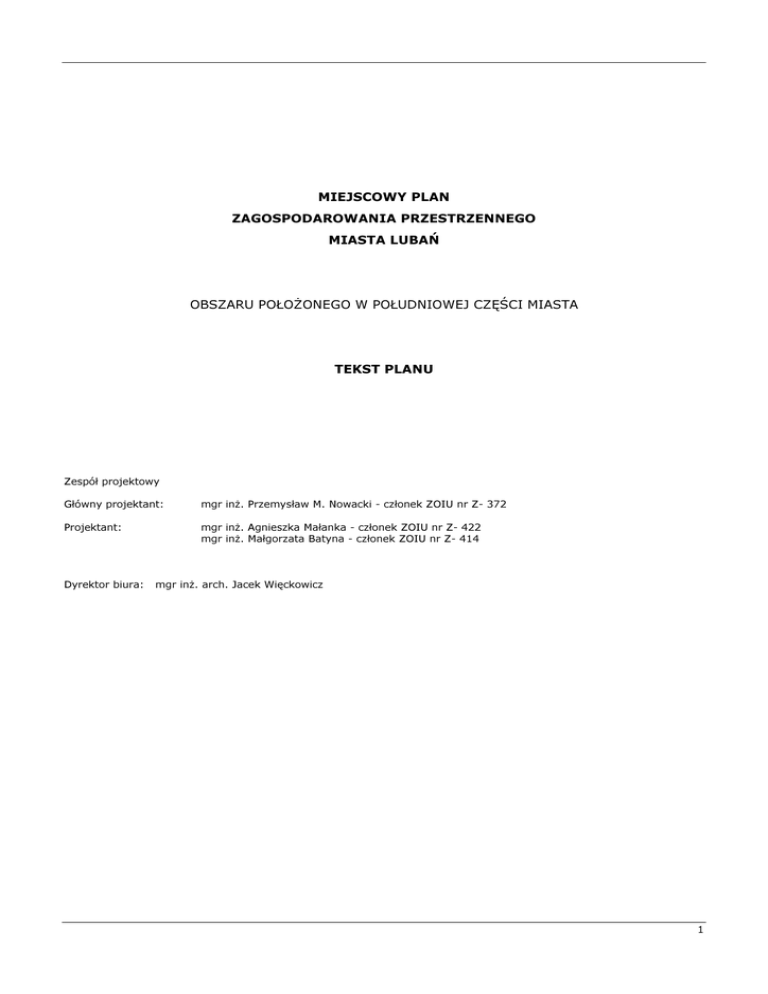 MIEJSCOWY PLAN ZAGOSPODAROWANIA PRZESTRZENNEGO MIASTA LUBAŃ OBSZARU POŁOŻONEGO W POŁUDNIOWEJ CZĘŚCI MIASTA TEKST PLANU Zespół projektowy Główny projektant: mgr inż. Przemysław M. Nowacki - członek ZOIU nr Z- 372 Projektant: mgr inż. Agnieszka Małanka - członek ZOIU nr Z- 422 mgr inż. Małgorzata Batyna - członek ZOIU nr Z- 414 Dyrektor biura: mgr inż. arch. Jacek Więckowicz 1 UCHWAŁA NR XLVI/351/2006 RADY MIASTA LUBAŃ Z DNIA 30 maja 2006 w s p r a w i e miejscowego planu zagospodarowania przestrzennego obszaru położonego w południowej części miasta Lubań. Na podstawie art. 18. ust. 2 pkt 5 ustawy z dnia 8 marca 1990 roku o samorządzie gminnym (Dz. U. z 2001 r. Nr 142 poz. 1591 ze zm.), art. 20 ust.1 ustawy z dnia 27 marca 2003r. o planowaniu i zagospodarowaniu przestrzennym (Dz. U. Nr 80 poz. 717 ze zm.), oraz w związku z uchwałą Nr XXXV/266/2005 Rady Miasta Lubań z dnia 26 kwietnia 2005 roku Rada Miasta Lubań, po stwierdzeniu zgodności planu miejscowego z ustaleniami Studium uwarunkowań i kierunków zagospodarowania przestrzennego miasta Lubań, uchwala co następuje: Rozdział 1 Przepisy ogólne 1. 2. § 1. Uchwala się miejscowy plan zagospodarowania przestrzennego obszaru położonego w południowej części miasta Lubań. Załącznikami do uchwały są: 1) rysunek planu w skali 1 : 1 000, stanowiący załącznik nr 1, 2) rozstrzygnięcie o sposobie realizacji, zapisanych w planie, inwestycji w zakresie infrastruktury technicznej należącej do zadań własnych gminy oraz zasadach ich finansowania, stanowiący załącznik nr 2, 3) rozstrzygnięcie o sposobie rozpatrzenia uwag, stanowiący załącznik nr 3. § 2. Ilekroć w dalszych przepisach niniejszej uchwały jest mowa o: 1) uchwale – rozumie się przez to niniejszą uchwałę, 2) planie – rozumie się przez to miejscowy plan zagospodarowania przestrzennego, o którym mowa w § 1 niniejszej uchwały, 3) przepisach szczególnych – rozumie się przez to przepisy ustaw wraz z aktami wykonawczymi oraz ograniczenia w dysponowaniu terenem, wynikające z prawomocnych decyzji administracyjnych, 4) rysunku planu – rozumie się przez to graficzny zapis planu, będący załącznikiem graficznym do niniejszej uchwały, przedstawiony na mapie ewidencyjnej z elementami sytuacyjno-wysokościowymi w skali 1 : 1 000, 5) zadania celu publicznego – rozumie się przez to inwestycje o znaczeniu lokalnym (gminnym) i ponadlokalnym (powiatowym, wojewódzkim i krajowym), stanowiące realizację w obszarach przestrzeni publicznej – obszarach o szczególnym znaczeniu dla zaspokajania potrzeb mieszkańców, poprawy jakości ich życia i sprzyjający nawiązywaniu kontaktów społecznych ze względu na jego położenie oraz cechy funkcjonalno-przestrzenne, 6) terenie – rozumie się przez to obszar wyznaczony na rysunku planu liniami rozgraniczającymi, w którego każdym punkcie obowiązują te same ustalenia, 7) funkcji podstawowej terenu – rozumie się przez to funkcję wyznaczoną do lokalizacji w danym terenie, która w ramach realizacji planu winna stać się przeważającą (dominującą) formą wykorzystania, a wprowadzenie innych niż podstawowa funkcji jest dopuszczalne wyłącznie pod warunkiem spełnienia ustaleń szczegółowych niniejszej uchwały, 8) nieprzekraczalnych liniach zabudowy – rozumie się przez to linię ograniczającą obszar, na którym dopuszcza się wznoszenie obiektów budowlanych, 9) działce budowlanej – rozumie się przez to nieruchomość gruntową lub działkę gruntu, której wielkość, cechy geometryczne, dostęp do drogi publicznej oraz wyposażenie w urządzenia infrastruktury technicznej spełniają wymogi realizacji obiektów budowlanych wynikające z odrębnych przepisów, 10) dostępie do drogi publicznej – rozumie się przez to bezpośredni dostęp do tej drogi albo dostęp przez drogę wewnętrzną, 11) wysokość budynku – – rozumie się przez to wysokość budynku liczoną od poziomu terenu przy budynku do najwyższego punktu jego konstrukcji, 12) poziomie terenu – rozumie się przez to rzędną terenu nad poziomem morza przed wejściem głównym do budynku, bądź jego samodzielnej części, nie będącym wyłącznie wejściem do pomieszczeń gospodarczych lub technicznych, 13) kondygnacji – rozumie się przez to poziomą, nadziemną lub podziemną część budynku, zawartą między podłogą na stropie lub warstwą wyrównawczą na gruncie, a górną powierzchnią podłogi bądź warstwy osłaniającej izolację cieplną stropu, znajdującego się nad tą częścią; za kondygnację uważa się także poddasze z pomieszczeniami przeznaczonymi na stały pobyt ludzi oraz poziomą część budynku stanowiącą przestrzeń na urządzenia techniczne, mającą wysokość w świetle większą niż 1,9 m, 14) kondygnacji naziemnej – rozumie się przez to kondygnację, której nie mniej niż połowa wysokości w świetle co najmniej z jednej strony budynku znajduje się powyżej poziomu terenu, a także każdą usytuowaną nad nią kondygnację, 2 15) intensywności zabudowy – rozumie się przez to stosunek sumy powierzchni ogólnej zabudowy do powierzchni działki budowlanej, 16) powierzchni ogólnej zabudowy - rozumie się przez to powierzchnię obiektu budowlanego mierzoną po obrysie zewnętrznym pomnożoną przez liczbę kondygnacji naziemnych, 17) powierzchni terenu biologicznie czynnej – rozumie się przez to grunt rodzimy pokryty roślinnością oraz wodę powierzchniową na działce budowlanej, a także 50% sumy nawierzchni tarasów i stropodachów, urządzonych jako stałe trawniki lub kwietniki na podłożu zapewniającym ich naturalną wegetację, o powierzchni nie mniejszej niż 10m2, 18) urządzeniach towarzyszących – rozumie się przez to wszelkie urządzenia infrastruktury technicznej, komunikacji kołowej i pieszej niezbędne do obsługi danego terenu , 19) urządzeniach infrastruktury technicznej – rozumie się przez to siec