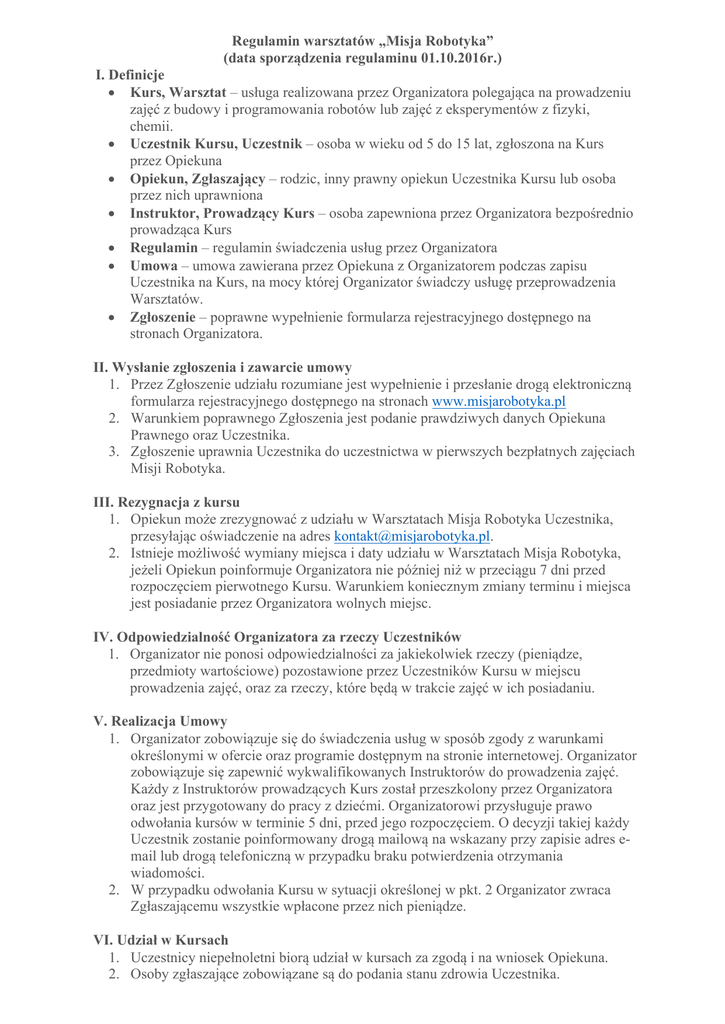 Regulamin warsztatów „Misja Robotyka” (data sporządzenia regulaminu 01.10.2016r.) I. Definicje • Kurs, Warsztat – usługa realizowana przez Organizatora polegająca na prowadzeniu zajęć z budowy i programowania robotów lub zajęć z eksperymentów z fizyki, chemii. • Uczestnik Kursu, Uczestnik – osoba w wieku od 5 do 15 lat, zgłoszona na Kurs przez Opiekuna • Opiekun, Zgłaszający – rodzic, inny prawny opiekun Uczestnika Kursu lub osoba przez nich uprawniona • Instruktor, Prowadzący Kurs – osoba zapewniona przez Organizatora bezpośrednio prowadząca Kurs • Regulamin – regulamin świadczenia usług przez Organizatora • Umowa – umowa zawierana przez Opiekuna z Organizatorem podczas zapisu Uczestnika na Kurs, na mocy której Organizator świadczy usługę przeprowadzenia Warsztatów. • Zgłoszenie – poprawne wypełnienie formularza rejestracyjnego dostępnego na stronach Organizatora. II. Wysłanie zgłoszenia i zawarcie umowy 1. Przez Zgłoszenie udziału rozumiane jest wypełnienie i przesłanie drogą elektroniczną formularza rejestracyjnego dostępnego na stronach www.misjarobotyka.pl 2. Warunkiem poprawnego Zgłoszenia jest podanie prawdziwych danych Opiekuna Prawnego oraz Uczestnika. 3. Zgłoszenie uprawnia Uczestnika do uczestnictwa w pierwszych bezpłatnych zajęciach Misji Robotyka. III. Rezygnacja z kursu 1. Opiekun może zrezygnować z udziału w Warsztatach Misja Robotyka Uczestnika, przesyłając oświadczenie na adres [email protected]. 2. Istnieje możliwość wymiany miejsca i daty udziału w Warsztatach Misja Robotyka, jeżeli Opiekun poinformuje Organizatora nie później niż w przeciągu 7 dni przed rozpoczęciem pierwotnego Kursu. Warunkiem koniecznym zmiany terminu i miejsca jest posiadanie przez Organizatora wolnych miejsc. IV. Odpowiedzialność Organizatora za rzeczy Uczestników 1. Organizator nie ponosi odpowiedzialności za jakiekolwiek rzeczy (pieniądze, przedmioty wartościowe) pozostawione przez Uczestników Kursu w miejscu prowadzenia zajęć, oraz za rzeczy, które będą w trakcie zajęć w ich posiadaniu. V. Realizacja Umowy 1. Organizator zobowiązuje się do świadczenia usług w sposób zgody z warunkami określonymi w ofercie oraz programie dostępnym na stronie internetowej. Organizator zobowiązuje się zapewnić wykwalifikowanych Instruktorów do prowadzenia zajęć. Każdy z Instruktorów prowadzących Kurs został przeszkolony przez Organizatora oraz jest przygotowany do pracy z dziećmi. Organizatorowi przysługuje prawo odwołania kursów w terminie 5 dni, przed jego rozpoczęciem. O decyzji takiej każdy Uczestnik zostanie poinformowany drogą mailową na wskazany przy zapisie adres email lub drogą telefoniczną w przypadku braku potwierdzenia otrzymania wiadomości. 2. W przypadku odwołania Kursu w sytuacji określonej w pkt. 2 Organizator zwraca Zgłaszającemu wszystkie wpłacone przez nich pieniądze. VI. Udział w Kursach 1. Uczestnicy niepełnoletni biorą udział w kursach za zgodą i na wniosek Opiekuna. 2. Osoby zgłaszające zobowiązane są do podania stanu zdrowia Uczestnika. 3. Osoby zgłaszające zobowiązane są do podania osób uprawnionych do odbioru Uczestnika z Kursu. Istnieje możliwość samodzielnego opuszczenia miejsca zajęć przez Uczestnika. W takim przypadku Opiekun zobowiązany jest do złożenia stosownego oświadczenia pisemnego i przekazania go Prowadzącemu Kurs. 4. Opiekun odpowiedzialny jest materialnie za szkody wyrządzone przez Uczestnika i z tego powodu przyjmują na siebie pełną odpowiedzialność cywilnoprawną 5. Uczestnicy są zobowiązani stosować się do poleceń osób prowadzących Kurs. 6. Uczestnik drastycznie naruszający regulamin uczestnictwa (załącznik do niniejszego regulaminu) może zostać usunięty z Kursu. W powyższym wypadku Organizator nie zwraca należności za pozostałą część Kursu. VII. Co zapewnia Organizator? • • • • • Uczestnicy zajęć pracują w parach dobieranych według wieku, umiejętności Na każdą parę przypada zestaw materiałów dydaktycznych Opiekę wykwalifikowanych Instruktorów Uczestników na zajęcia można przyprowadzać 15 minut wcześniej i 5 minut po zakończeniu zajęć odbierać Na zakończenie zajęć dzieci otrzymują dyplom oraz upominek Misji Robotyka (jeśli było to określone w programie danego kursu) VIII. Miejsce prowadzenia kursu 1. Kurs prowadzony jest w miejscu wskazanym przez Organizatora. X. Wizerunek 1. Opiekun wyraża zgodę, aby w trakcie Kursu Prowadzący Zajęcia, czy też inna osoba wskazana przez Organizatora wykonywał zdjęcia Uczestnikom Zajęć celem umieszczenia ich na swojej stronie internetowej (www.misjarobotyka.pl, profil Facebook). 2. W przypadku braku zgody Opiekun zobowiązany jest złożyć stosowne oświadczenie w formie pisemnej przed rozpoczęciem Zajęć jednemu z obecnych na Kursie Instruktorów IX. Postanowienia końcowe 1. Przystąpienie przez Uczestnika do Kursu Misja Robotyka jest równoznaczne z akceptacją niniejszego regulaminu, w tym zgodą na przetwarzanie danych osobowych Uczestników przez Organizatora w celu wysyłania newslettera z nowościami oraz ofert. 2. Regulamin, wraz z ewentualnymi zmianami, obowiązuje od momentu zamieszczenia ich na stronie internetowej Organizatora 3. Zmiany w regulaminie obowiązują tylko w stosunku do nowo zawieranych Umów. 4. W sprawach nieuregulowanych w Regulaminie stosuje się przepisy Kodeksu Cywilnego 5. Wszelkie spory związane z Umowami rozwiązywane będą przez sąd właściwy dla Organizatora. 6. "Wyrażam zgodę na przetwarzanie moich danych osobowych zawartych w karcie informacyjnej dla potrzeb niezbędnych do realizacji warsztatów Misja Robotyka (zgodnie z Ustawą z dnia 29.08.1997 roku o Ochronie Danych Osobowych”
