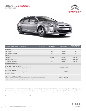 CITROËN C5 TOURER ROK PRODUKCJI 2015 SELECTION EXCLUSIVE CROSSTOURER EXCLUSIVE 1.6 THP 155 — 113 500 — 1.6 THP 155 Automat — 120 500 — CENy POSzCzEGÓLNyCH WERSJI PLN brutto bENzyNA DIESEL 2.0 HDi 160 117 600 123 500 127 500 2.0 HDi 160 Automat — 130 500 134 500 2.2 HDi 200 Automat — 140 900 144 900 CENNIK KONTRAKTÓW KONTRAKT ESSENTIALDRIVE (Naprawa i bezpłatna wymiana części wadliwych + Assistance) cena już od 730 KONTRAKT REALDRIVE (Naprawa i bezpłatna wymiana części wadliwych + Assistance + przeglądy okresowe) cena już od 1460 KONTRAKT FREEDRIVE PLUS (Naprawa i bezpłatna wymiana części wadliwych + Assistance Rozszerzone + przeglądy okresowe + pojazd zastępczy + wymiana części ulegających zużyciu + mycie) cena już od 2180 Citroën zastrzega sobie prawo wprowadzania bez uprzedzenia zmian parametrów technicznych i wyposażenia pojazdów oferowanych na rynku polskim. Podane w cenniku informacje nie są ofertą handlową w rozumieniu art. 66 Kodeksu Cywilnego. W wypadku sprzedaży konsumenckiej zawarte w tym cenniku informacje nie stanowią zapewnienia w rozumieniu art. 4 ust. 3 ustawy o szczególnych warunkach sprzedaży konsumenckiej i nie stanowią opisu towaru w rozumieniu art. 4 ust. 2 ustawy o sprzedaży konsumenckiej. Indywidualne uzgodnienia właściwości pojazdu następują w umowie jego sprzedaży. Cena cennikowa staje się elementem umowy z konsumentem w chwili indywidualnego ustalania treści tej umowy. UWAGA: niektóre elementy wyposażenia opcjonalnego mogą się wykluczać lub być ze sobą powiązane. Pełna lista wyposażenia seryjnego oraz opcjonalnego dostępna w autoryzowanych punktach sprzedaży. CENNIK Pieczątka Autoryzowanego Dystrybutora 1/6 MAJ 2015 CITROËN C5 WAŻNIEJSzE ELEMENTy WyPOSAŻENIA SELECTION EXCLUSIVE CROSSTOURER EXCLUSIVE Alarm niezamierzonego przekroczenia linii (AFIL) 2 — 2 2500 2 2500 Automatyczne włączanie świateł przednich 2 2 2 Automatyczne wycieraczki przednie 2 2 2 blokada elektryczna zabezpieczająca otwarcie drzwi tylnych i szyb przez dzieci 2 2 Citroën Connect box 2 — 2 2 Czujnik ciśnienia w ogumieniu 2 2 2 Elektryczny hamulec postojowy + wspomaganie ruszania na wzniesieniu 2 2 2 ESP + ASR + Inteligentny System Kontroli Trakcji (oprócz skrzyni bVA) Lusterka boczne elektrochromatyczne 2 — 2 650 2 650 Lusterko wsteczne elektrochromatyczne 2 2 2 Mocowania Isofix (boczne fotele w drugim rzędzie) Pakiet bezpieczeństwo (Alarm z ryglowaniem zamków, Poduszki powietrzne boczne z tyłu) 2 — 2 2200 2 2200 Pakiet Parkowanie (Wspomaganie parkowania (czujniki przód) z pomiarem miejsca parkingowego, Lusterka boczne elektrochromatyczne) — 1550 — Pakiet Parkowanie 2 (Wspomaganie parkowania (czujniki przód) z pomiarem miejsca parkingowego, Lusterka boczne elektrochromatyczne, Reflektory biksenonowe kierunkowe) — 5000 — Poduszka kolanowa kierowcy 2 2 2 Poduszki powietrzne boczne z przodu 2 2 2 Poduszki powietrzne kurtynowe z przodu i z tyłu 2 2 2 2 4000 2 4000 2 4000 Reflektory przeciwmgłowe 2 2 2 Reflektory przednie z funkcją statycznego doświetlania zakrętów do 75° (AFS) 2 2 2 Reflektory wyposażone w funkcję "Follow Me Home" 2 2 2 Reflektory wyposażone w światła do jazdy dziennej 2 2 2 Regulator i ogranicznik prędkości 2 2 2 Światła LED przy reflektorach przednich 2 2 2 Trzecie światło STOP diodowe 2 2 2 Wskaźnik niezapiętych pasów dla wszystkich siedzeń 2 Wspomaganie parkowania (czujniki tył i przód) z pomiarem miejsca parkingowego 2 900 Wspomaganie parkowania (czujniki tył) 2 — 2 900 2 2 zagłówki przednie dwuczęściowe — 2 2 Dodatkowe oświetlenie w podsufitce — 2 2 Drugi pilot zamka centralnego — 2 2 Dywaniki przednie i tylne — 2 2 Filtr cząstek stałych (tylko HDi) 2 2 2 Filtr przeciwpyłkowy / przeciwzapachowy 2 2 Fotel kierowcy z funkcją masażu 2 — 2 2 Fotel kierowcy z funkcją ułatwiania wejścia (automatyczne odsuwanie) — 2 2 Fotel kierowcy regulowany elektrycznie (z funkcją zapamiętywania ustawień), z funkcją masażu i regulacją odcinka lędźwiowego — — 2 Fotel pasażera z regulacją wzdłużną, prostopadłą (oparcia) i na wysokość. — — 2 Fotele przednie ogrzewane — 2 2 Fotele przednie sterowane elektrycznie (regulacja pozioma, pochylenia oparcia, wysokości i kąta nachylenia siedziska, lędźwiowa oraz kąta nachylenia górnej część oparcia) — 2 — Fotele przednie typu CARACTERE (mocniej wyprofilowane) 2 — 2 2 Funkcja zapamiętywania ustawienia fotela kierowcy 2 2 Funkcja "black Panel" sterowana z kierownicy 2 2 2 Gniazdko 12V w drugim rzędzie 2 2 2 Gniazdko 12V po prawej stronie w bagażniku 2 2 2 POzIOM PLN brutto bEzPIECzEŃSTWO AbS + bAS + EbD Poduszki powietrzne przednie kierowcy i pasażera (z możliwością odłączenia) Reflektory biksenonowe kierunkowe KOMFORT 2/6 2 - Standard — - Nie występuje 200 - Cena opcji CITROËN C5 WAŻNIEJSzE ELEMENTy WyPOSAŻENIA SELECTION EXCLUSIVE CROSSTOURER EXCLUSIVE Kanapa tylna składana 60/40 2 2 2 Kierownica regulowana w dwóch płaszczyznach 2 2 2 Kierownica z nieruchomym centralnym panelem przełączników 2-ej generacji 2 2 2 Kieszenie w oparciach foteli przednich 2 — 2 2 2 2 2 — 2 2 Kolorowe wyświetlacze w zestawie zegarów 2 2 Koło kierownicy pokryte skórą 2 2 2 Komputer pokładowy 2 2 2 Lampka w bagażniku dwufunkcyjna (oświetlenie bagażnika / latarka) 2 — 2 2 2 2 — 2 — 2 — 2 3700 2 3700 2 3700 Nawigacja kolorowa eMyWay + Wspomaganie parkowania (czujniki przód i tył) + kamera cofania — 6400 6400 Podłokietnik centralny przedni z zamykanym schowkiem i uchwytem na puszkę 2 2 2 Podłokietnik centralny z tyłu zawierający schowek, dwa uchwyty na puszki i otwór na narty 2 2 2 Podświetlane lusterka w osłonach przeciwsłonecznych 2 2 Podświetlenie klamek wewnętrznych przednich i tylnych 2 — 2 2 Podświetlenie konsoli przedniej sufitowej (dwie diody pomarańczowe) 2 2 2 Podświetlenie progów drzwi przednich 2 — 2 — 2 Przedłużone
