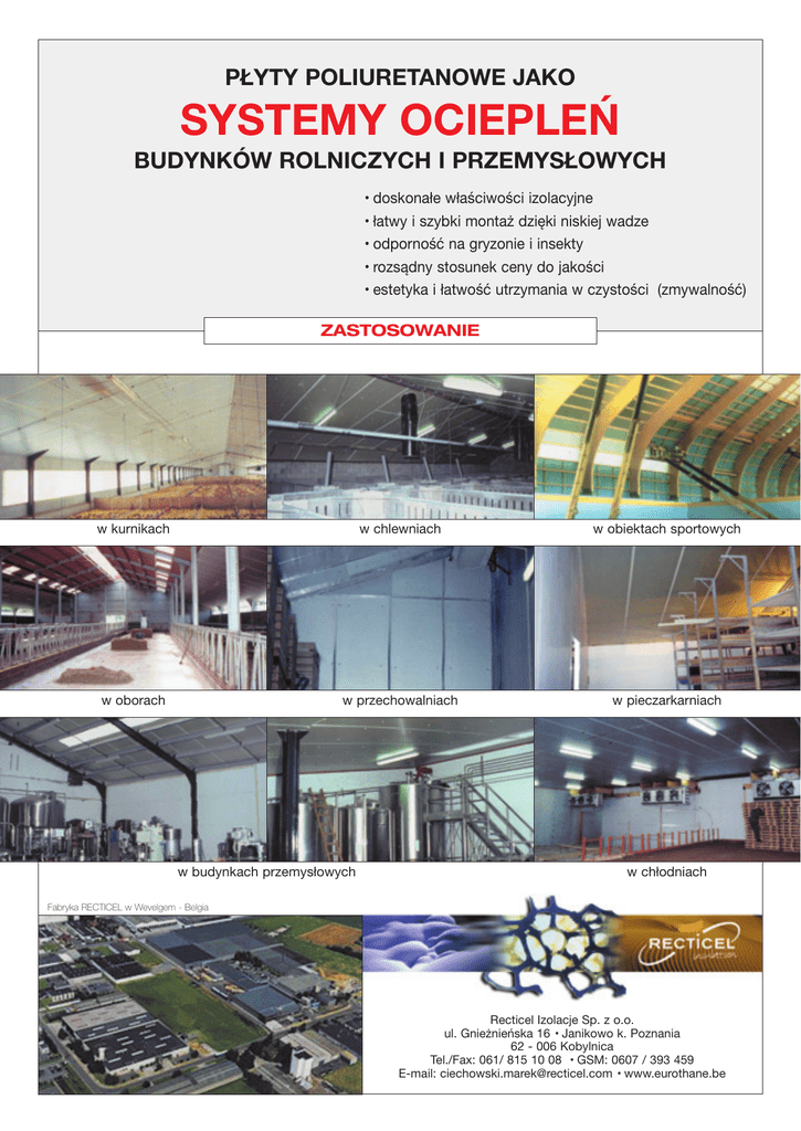 PŁYTY POLIURETANOWE JAKO SYSTEMY OCIEPLEŃ BUDYNKÓW ROLNICZYCH I PRZEMYSŁOWYCH • doskonałe właściwości izolacyjne • łatwy i szybki montaż dzięki niskiej wadze • odporność na gryzonie i insekty • rozsądny stosunek ceny do jakości • estetyka i łatwość utrzymania w czystości (zmywalność) ZASTOSOWANIE w kurnikach w chlewniach w obiektach sportowych w oborach w przechowalniach w pieczarkarniach w budynkach przemysłowych w chłodniach Fabryka RECTICEL w Wevelgem - Belgia Recticel Izolacje Sp. z o.o. ul. Gnieżnieńska 16 • Janikowo k. Poznania 62 - 006 Kobylnica Tel./Fax: 061/ 815 10 08 • GSM: 0607 / 393 459 E-mail: [email protected] • www.eurothane.be PODSTAWOWE INFORMACJE EUROTHANE i POWERLINE Są płytami z twardej pianki poliuretanowej z okładziną aluminiową (w przypadku POWERLINE) lub z laminatu (w przypadku EUROTHANE). Okładziną z aluminium lub z laminatu zabezpieczone są także dłuższe, zaokrąglone krawędzie płyt: tak zwany system QUATTRO - który oznacza, że pianka zabezpieczona jest ze wszystkich stron przed oddziaływaniem czynników zewnętrznych co w znaczny sposób ogranicza również w przypadku zmywania pod ciśnieniem możliwość odklejania się laminatu lub aluminium od powierzchni płyty. WYMIARY • Standardowa szerokość to 1200 mm lub 1227 mm STANDARD NAJCZE,ŚCIEJ STOSOWANYCH GRUBOŚCI • W przypadku płyty POWERLINE proponujemy ze względu na ryzyko uszkodzenia/zagięcia powłoki aluminiowej standardową długość równą 5 metrów, inne długości wykonujemy na wyrażne życzenie klienta Obory • W przypadku płyty EUROTHANE oferujemy długości do 12 metrów. Na zamówienie również dłuższe (maksymalnie do 13,00 metrów) płyty Kurniki Przechowalnie • Oferowane grubości to dla płyty POWERLINE 30, 40, 50, 60 mm. Płyta EUROTHANE produkowana jest w grubościach od 20 mm do 120 mm Chlewnia Chłodnie 30 mm - 40 mm - 50 mm (najczęściej 40 mm) 50 mm - 60 mm (zależnie od wieku świnek) 60 mm (zwykle 60 mm) 60 mm - 80 mm - 100 mm (zależnie od rodzaju przechowywanych warzyw) 100 mm i więcej (zależnie od temperatury) by Recticel POWERLINE EUROTHANE S (AL QUATTRO) SYSTEM QUATTRO Profil H służący do montażu płyty QUATTRO Zawieszka metalowa podtrzymująca profil przytwierdzona do szyny konstrukcji roboczej DANE TECHNICZINE ZALETY SYSTEMU QUATTRO PłYTA POWERLINE • λD = 0,024 W/mK • Kolor okładziny: aluminium / aluminium lakierowane na biało (efekt młotkowy) • Gęstość: 30 kg/m3 (+/- 2 kg) • Płyty pokryte grubą folią aluminiową lub laminatem gwarantują estetyczny wygląd oraz łatwość utrzymania w czystości • Dzięki pokryciu z folii lub laminatu płyty zmywać moźna aparatem ciśnieniowym • Wieloletnia obecność wyrobu na rynku w Europie Zachodniej i Polsce potwierdza jego żywotność • Oporność na gryzonie i insekty • Długość płyty dobrana moźe zostać indywidualnie do kaźdego budynku co w znaczny sposób ogranicza koszty elementów montażowych oraz eliminuje ilość odpadów • Raz zamontowana izolacja służyć będzie Państwu przez wiele lat nie tylko jako izolacja, lecz również jako nowoczesne i estetyczne wykończenie budynku w kompleksowym systemie montażowym QUATTRO • Decyzja o jego zastosowaniu będzie Państwu procentowała przez wiele lat PłYTA EUROTHANE • λD = 0,027 W/ mK - przy grubości < 70 mm • λD = 0,025 W/ mK - przy grubości ≥ 70 mm • Kolor okładziny: złotawo zielonkawy (gładka) • Gęstość: 30 kg/m3 (+/- 2 kg) PRODUKCJA NINIEJSZYCH PŁYT ODBYWA SIE, ZGODNIE Z NORMĄ: NBM-EN-ISO 9001:2000 Chcesz wiedzieć więcej? Zadzwoń do: RECTICEL IZOLACJE Sp. z o.o. Tel./Fax: 061 815 10 08 • GSM: 0607 393 459 E-mail: [email protected] www.eurothane.be Przedstawiciel
