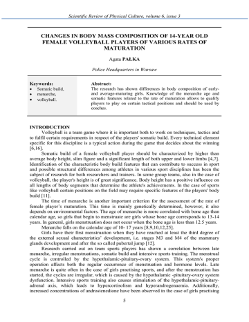 Scientific Review of Physical Culture, volume 6, issue 3 CHANGES IN BODY MASS COMPOSITION OF 14-YEAR OLD FEMALE VOLLEYBALL PLAYERS OF VARIOUS RATES OF MATURATION Agata PAŁKA Police Headquarters in Warsaw Keywords: Somatic build, menarche, volleyball. Abstract: The research has shown differences in body composition of earlyand average-maturing girls. Knowledge of the menarche age and somatic features related to the rate of maturation allows to qualify players to play on certain tactical positions and should be used by coaches. INTRODUCTION Volleyball is a team game where it is important both to work on techniques, tactics and to fulfil certain requirements in respect of the players' somatic build. Every technical element specific for this discipline is a typical action during the game that decides about the winning [6,16]. Somatic build of a female volleyball player should be characterized by higher than average body height, slim figure and a significant length of both upper and lower limbs [4,7]. Identification of the characteristic body build features that can contribute to success in sport and possible structural differences among athletes in various sport disciplines has been the subject of research for both researchers and trainers. In some group teams, also in the case of volleyball, the player's height is of great significance. Body height has a positive influence on all lengths of body segments that determine the athlete's achievements. In the case of sports like volleyball certain positions on the field may require specific features of the players' body build [11]. The time of menarche is another important criterion for the assessment of the rate of female player’s maturation. This time is mainly genetically determined, however, it also depends on environmental factors. The age of menarche is more correlated with bone age than calendar age, so girls that begin to menstruate are girls whose bone age corresponds to 13-14 years. In general, girls menstruation does not occur when the bone age is less than 12.5 years. Menarche falls on the calendar age of 10- 17 years [8,9,10,12,25]. Girls have their first menstruation when they have reached at least the third degree of the external sexual characteristics’ development, i.e. stages M3 and M4 of the mammary glands development and after the so called pubertal jump [12]. Research carried out on team sports players has shown a correlation between late menarche, irregular menstruations, somatic build and intensive sports training. The menstrual cycle is controlled by the hypothalamic-pituitary-ovary system. This system's proper operation affects both the regular occurrence of menstruation and hormone levels. Late menarche is quite often in the case of girls practising sports, and after the menstruation has started, the cycles are irregular, which is caused by the hypothalamic -pituitary-ovary system dysfunction. Intensive sports training also causes stimulation of the hypothalamic-pituitaryadrenal axis, which leads to hypercortisolism and hyperandrogenaemia. Additionally, increased concentrations of androstenedione have been observed in the case of girls practising 5 Scientific Review of Physical Culture, volume 6, issue 3 sports. Androstenedione is a precursor of testosterone and estrone, and even a small increase in androgens concentration can result in menstrual cycle disorders. Hypoestrogenism may contribute to the occurrence of osteopenia, i.e. low bone mass, which in turn can lead to increased risk of fatigue fractures [20,21]. During puberty, each somatic feature exhibits intense growing, and changes in length and width characteristics take place in a specific order [13]. Maturation is also the time of a significant body weight gain. Checking of the body height and weight as well as information on the menarche age in sports training are very important [18]. PURPOSE OF THE STUDY The purpose of this thesis was to determine the changes in body build and composition in young female volleyball players in subsequent calendar age ranges depending on the menarche age. MATERIAL AND METHODS The research was carried out on 25 girls - players of MOSM Tychy Sports Club, attending a junior-high school class with extended curriculum in physical education focusing on volleyball. The players were examined 3 times at intervals of six months. During the first examination, the girls' calendar age was 14.32 ± 0.23 years, whereas the length of training was 2.12 ± 1.28 years. The girls train 5 times a week, 1.5 hours daily. An antropometer was used to measure the girls' body height, whereas "Tanita” TBF-410 scale was used to determine the body weight, body mass index (BMI), fat content (FAT%) and fat-free mass (FFM kg). What is more, the test of difference significance was used for two medians of somatic variables in the group of players with early and normal menarches. The menarche age was determined using a retrospective method. The girls with their menarche before the age of twelve were considered to belong to the group with early menstruation. The classification into early- and averagely- menstruating girls was based on results of research carried out, among others, by Piechaczek et al. [1996], Rodziewicz-Gruhn [2002], Radochońska et al. [2006], Burdukiewicz [2009], and Wilczewski [2012]. Research of the aforementioned authors showed that the average age of menarche ranged from 12.60 to 13.16 years. Therefore, a scale has been adopted in this paper according to which earlymenstruating girls are girls whose menarche occurred before the age of 12 years, whereas average-maturing girls are players who started menstruating after the age of 12 years [2,14,15,17,24]. RESULTS The examined group consisted of 17 players with early menarche (11.71±0.57 years) and 8 players with menarche corresponding to the population standard (13.43±0.67 years). Girls whose menstruation started earlier were characterized by greater height and body weight as well as b
