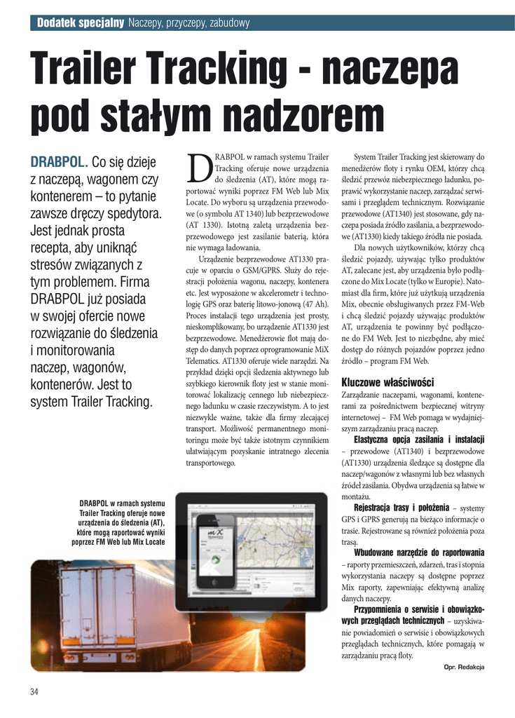 Dodatek specjalny Naczepy, przyczepy, zabudowy Trailer Tracking - naczepa pod stałym nadzorem DRABPOL. Co się dzieje z naczepą, wagonem czy kontenerem – to pytanie zawsze dręczy spedytora. Jest jednak prosta recepta, aby uniknąć stresów związanych z tym problemem. Firma DRABPOL już posiada w swojej ofercie nowe rozwiązanie do śledzenia i monitorowania naczep, wagonów, kontenerów. Jest to system Trailer Tracking. DRABPOL w ramach systemu Trailer Tracking oferuje nowe urządzenia do śledzenia (AT), które mogą raportować wyniki poprzez FM Web lub Mix Locate D RABPOL w ramach systemu Trailer Tracking oferuje nowe urządzenia do śledzenia (AT), które mogą raportować wyniki poprzez FM Web lub Mix Locate. Do wyboru są urządzenia przewodowe (o symbolu AT 1340) lub bezprzewodowe (AT 1330). Istotną zaletą urządzenia bezprzewodowego jest zasilanie baterią, która nie wymaga ładowania. Urządzenie bezprzewodowe AT1330 pracuje w oparciu o GSM/GPRS. Służy do rejestracji położenia wagonu, naczepy, kontenera etc. Jest wyposażone w akcelerometr i technologię GPS oraz baterię litowo-jonową (47 Ah). Proces instalacji tego urządzenia jest prosty, nieskomplikowany, bo urządzenie AT1330 jest bezprzewodowe. Menedżerowie flot mają dostęp do danych poprzez oprogramowanie MiX Telematics. AT1330 oferuje wiele narzędzi. Na przykład dzięki opcji śledzenia aktywnego lub szybkiego kierownik floty jest w stanie monitorować lokalizację cennego lub niebezpiecznego ładunku w czasie rzeczywistym. A to jest niezwykle ważne, także dla firmy zlecającej transport. Możliwość permanentnego monitoringu może być także istotnym czynnikiem ułatwiającym pozyskanie intratnego zlecenia transportowego. System Trailer Tracking jest skierowany do menedżerów floty i rynku OEM, którzy chcą śledzić przewóz niebezpiecznego ładunku, poprawić wykorzystanie naczep, zarządzać serwisami i przeglądem technicznym. Rozwiązanie przewodowe (AT1340) jest stosowane, gdy naczepa posiada źródło zasilania, a bezprzewodowe (AT1330) kiedy takiego źródła nie posiada. Dla nowych użytkowników, którzy chcą śledzić pojazdy, używając tylko produktów AT, zalecane jest, aby urządzenia było podłączone do Mix Locate (tylko w Europie). Natomiast dla firm, które już użytkują urządzenia Mix, obecnie obsługiwanych przez FM-Web i chcą śledzić pojazdy używając produktów AT, urządzenia te powinny być podłączone do FM Web. Jest to niezbędne, aby mieć dostęp do różnych pojazdów poprzez jedno źródło – program FM Web. Kluczowe właściwości Zarządzanie naczepami, wagonami, kontenerami za pośrednictwem bezpiecznej witryny internetowej – FM Web pomaga w wydajniejszym zarządzaniu pracą naczep. Elastyczna opcja zasilania i instalacji – przewodowe (AT1340) i bezprzewodowe (AT1330) urządzenia śledzące są dostępne dla naczep/wagonów z własnymi lub bez własnych źródeł zasilania. Obydwa urządzenia są łatwe w montażu. Rejestracja trasy i położenia – systemy GPS i GPRS generują na bieżąco informacje o trasie. Rejestrowane są również położenia poza trasą. Wbudowane narzędzie do raportowania – raporty przemieszczeń, zdarzeń, tras i stopnia wykorzystania naczepy są dostępne poprzez Mix raporty, zapewniając efektywną analizę danych naczepy. Przypomnienia o serwisie i obowiązkowych przeglądach technicznych – uzyskiwanie powiadomień o serwisie i obowiązkowych przeglądach technicznych, które pomagają w zarządzaniu pracą floty. Opr. Redakcja 34