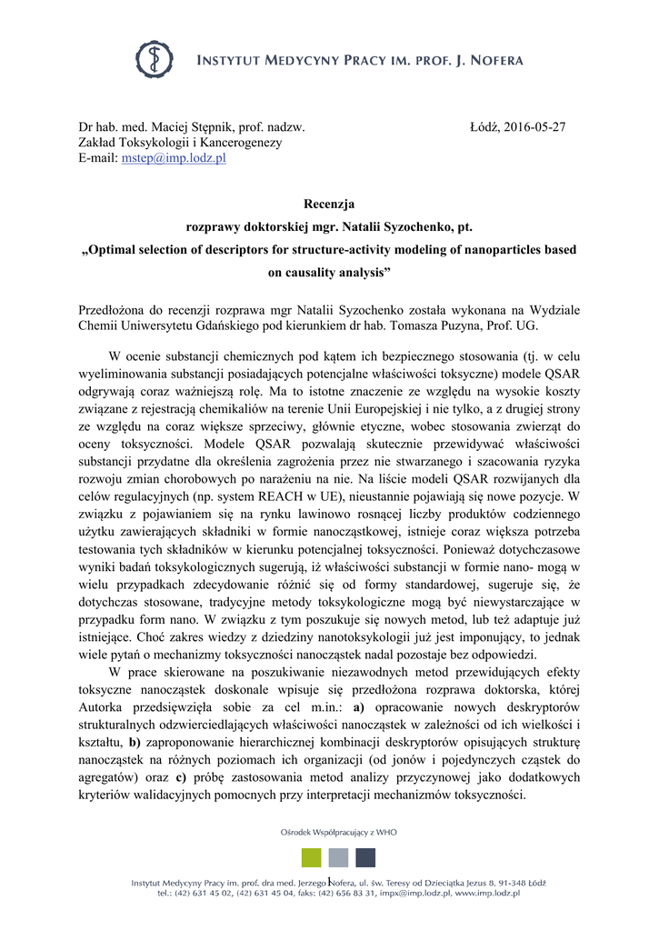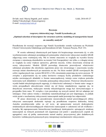 Dr hab. med. Maciej Stępnik, prof. nadzw. Zakład Toksykologii i Kancerogenezy E-mail: [email protected] Łódź, 2016-05-27 Recenzja rozprawy doktorskiej mgr. Natalii Syzochenko, pt. „Optimal selection of descriptors for structure-activity modeling of nanoparticles based on causality analysis” Przedłożona do recenzji rozprawa mgr Natalii Syzochenko została wykonana na Wydziale Chemii Uniwersytetu Gdańskiego pod kierunkiem dr hab. Tomasza Puzyna, Prof. UG. W ocenie substancji chemicznych pod kątem ich bezpiecznego stosowania (tj. w celu wyeliminowania substancji posiadających potencjalne właściwości toksyczne) modele QSAR odgrywają coraz ważniejszą rolę. Ma to istotne znaczenie ze względu na wysokie koszty związane z rejestracją chemikaliów na terenie Unii Europejskiej i nie tylko, a z drugiej strony ze względu na coraz większe sprzeciwy, głównie etyczne, wobec stosowania zwierząt do oceny toksyczności. Modele QSAR pozwalają skutecznie przewidywać właściwości substancji przydatne dla określenia zagrożenia przez nie stwarzanego i szacowania ryzyka rozwoju zmian chorobowych po narażeniu na nie. Na liście modeli QSAR rozwijanych dla celów regulacyjnych (np. system REACH w UE), nieustannie pojawiają się nowe pozycje. W związku z pojawianiem się na rynku lawinowo rosnącej liczby produktów codziennego użytku zawierających składniki w formie nanocząstkowej, istnieje coraz większa potrzeba testowania tych składników w kierunku potencjalnej toksyczności. Ponieważ dotychczasowe wyniki badań toksykologicznych sugerują, iż właściwości substancji w formie nano- mogą w wielu przypadkach zdecydowanie różnić się od formy standardowej, sugeruje się, że dotychczas stosowane, tradycyjne metody toksykologiczne mogą być niewystarczające w przypadku form nano. W związku z tym poszukuje się nowych metod, lub też adaptuje już istniejące. Choć zakres wiedzy z dziedziny nanotoksykologii już jest imponujący, to jednak wiele pytań o mechanizmy toksyczności nanocząstek nadal pozostaje bez odpowiedzi. W prace skierowane na poszukiwanie niezawodnych metod przewidujących efekty toksyczne nanocząstek doskonale wpisuje się przedłożona rozprawa doktorska, której Autorka przedsięwzięła sobie za cel m.in.: a) opracowanie nowych deskryptorów strukturalnych odzwierciedlających właściwości nanocząstek w zależności od ich wielkości i kształtu, b) zaproponowanie hierarchicznej kombinacji deskryptorów opisujących strukturę nanocząstek na różnych poziomach ich organizacji (od jonów i pojedynczych cząstek do agregatów) oraz c) próbę zastosowania metod analizy przyczynowej jako dodatkowych kryteriów walidacyjnych pomocnych przy interpretacji mechanizmów toksyczności. 1 Rozprawa doktorska mgr Syzochenko to maszynopis napisany w języku angielskim liczący 64 strony, 126 pozycji piśmiennictwa, z dołączonymi 4 pracami oryginalnymi (łącznie 38 stron), stanowiącymi podstawę przygotowanej rozprawy wraz ze stosownymi deklaracjami autorki oraz promotora, jak również oświadczeniami współautorów (łącznie 15 stron). Sumaryczny współczynnik oddziaływania (IF) 4 prac badawczych związanych z rozprawą doktorską jest wysoki i wynosi 23.4, przy sumarycznej punktacji MNiSW równej 150. Układ pracy odbiega od standardowego, niemniej jednak należy podkreślić, iż całość rozprawy ma układ przejrzysty i logiczny, zaś styl językowy nie budzi zastrzeżeń. We wstępnym rozdziale podsumowującym przeprowadzone badania Autorka przedstawia problematykę związaną z różnicami we właściwościach fizyko-chemicznych i biologicznych pomiędzy formami nano i standardową substancji, i związanych z tym nowych strategiach testowania i szacowania ryzyka dla form nano. W podrozdziale poświęconym metodologiom modelowania QSAR, opisane zostały m.in. rodzaje stosowanych deskryptorów molekularnych, kryteria ich selekcji, systemy samouczące się do opisu zależności pomiędzy właściwościami substancji a ich strukturą, jak również metody walidacji i interpretacji modeli QSAR. Szczególną uwagę Autorka zwraca na wyzwania i perspektywy badań nad deskryptorami nano-QSAR, opisane w rozprawie w podrozdziale opartym na opublikowanej pracy przeglądowej w J. Nanotoxicology Nanomedicine w 2016 roku. Podrozdział ten zręcznie wprowadza czytelnika w następujący po nim opis problemów badawczych, które Autorka zdecydowała się rozwiązać w swej rozprawie oraz przyświecające temu główne hipotezy badawcze. Po tych informacjach wstępnych Autorka przedstawia w kolejnych rozdziałach swe znakomite osiągnięcia badawcze, w formie osobnego, zwięzłego podsumowania każdej z 4 prac oryginalnych. Wśród tych osiągnięć należy wymienić: - opracowanie nowych, teoretycznych deskryptorów strukturalnych do modelowania nano-QSAR i ich udane zastosowanie do przewidywania przewodnictwa cieplnego nanopłynów (J. Phys. Chem. C 2015, 119: 25542-25547). Zastosowany model wykorzystywał teoretyczne deskryptory modelu „ciekłej kropli” (LDM) oraz deskryptory wyprowadzone doświadczalnie. Niewątpliwą zaletą opracowanych deskryptorów jest to, że nie wymagają złożonych lub długotrwałych obliczeń, i mają uzasadnienie we współczesnych teoriach przewodnictwa cieplnego nanopłynów; - nowatorskie opracowanie panelu deskryptorów doświadczalnych (wielkość pojedynczej nanocząstki, po agregacji, oraz punkt zerowy potencjału zeta) oraz teoretycznych (opartych na modelu LDM, podejściu SiRMS, i charakterystyce jonowej z zastosowaniem teorii wiązań metal-ligand) opisujących strukturę nanocząstek na różnych poziomach organizacji, do przewidywania cytotoksyczności nanocząstek tlenków metali. Modele te z powodzeniem zastosowano do analizy porównawczej cytotoksyczności na komórki bakteryjne E. coli oraz keratynocyty człowieka HaCaT (Nanoscale 2014, 6: 13986-13993), jak również na komórki linii wyprowadzo