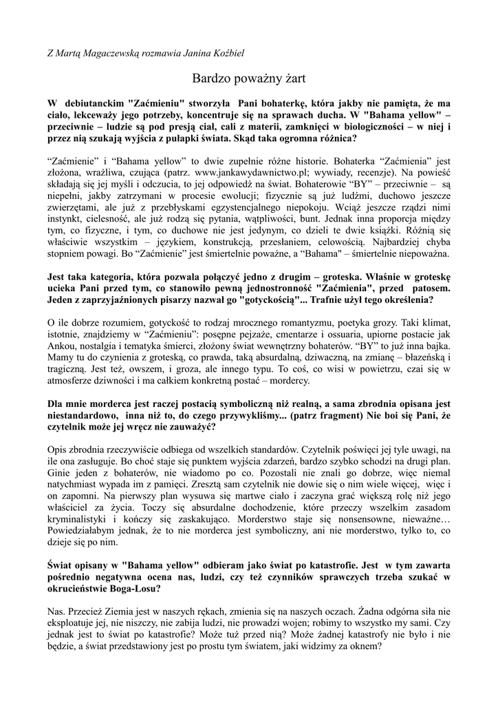 Z Martą Magaczewską rozmawia Janina Koźbiel Bardzo poważny żart W debiutanckim "Zaćmieniu" stworzyła Pani bohaterkę, która jakby nie pamięta, że ma ciało, lekceważy jego potrzeby, koncentruje się na sprawach ducha. W "Bahama yellow" – przeciwnie – ludzie są pod presją ciał, cali z materii, zamknięci w biologiczności – w niej i przez nią szukają wyjścia z pułapki świata. Skąd taka ogromna różnica? “Zaćmienie” i “Bahama yellow” to dwie zupełnie różne historie. Bohaterka “Zaćmienia” jest złożona, wrażliwa, czująca (patrz. www.jankawydawnictwo.pl; wywiady, recenzje). Na powieść składają się jej myśli i odczucia, to jej odpowiedź na świat. Bohaterowie “BY” – przeciwnie – są niepełni, jakby zatrzymani w procesie ewolucji; fizycznie są już ludźmi, duchowo jeszcze zwierzętami, ale już z przebłyskami egzystencjalnego niepokoju. Wciąż jeszcze rządzi nimi instynkt, cielesność, ale już rodzą się pytania, wątpliwości, bunt. Jednak inna proporcja między tym, co fizyczne, i tym, co duchowe nie jest jedynym, co dzieli te dwie książki. Różnią się właściwie wszystkim – językiem, konstrukcją, przesłaniem, celowością. Najbardziej chyba stopniem powagi. Bo “Zaćmienie” jest śmiertelnie poważne, a “Bahama" – śmiertelnie niepoważna. Jest taka kategoria, która pozwala połączyć jedno z drugim – groteska. Właśnie w groteskę ucieka Pani przed tym, co stanowiło pewną jednostronność "Zaćmienia", przed patosem. Jeden z zaprzyjaźnionych pisarzy nazwał go "gotyckością"... Trafnie użył tego określenia? O ile dobrze rozumiem, gotyckość to rodzaj mrocznego romantyzmu, poetyka grozy. Taki klimat, istotnie, znajdziemy w “Zaćmieniu”: posępne pejzaże, cmentarze i ossuaria, upiorne postacie jak Ankou, nostalgia i tematyka śmierci, złożony świat wewnętrzny bohaterów. “BY” to już inna bajka. Mamy tu do czynienia z groteską, co prawda, taką absurdalną, dziwaczną, na zmianę – błazeńską i tragiczną. Jest też, owszem, i groza, ale innego typu. To coś, co wisi w powietrzu, czai się w atmosferze dziwności i ma całkiem konkretną postać – mordercy. Dla mnie morderca jest raczej postacią symboliczną niż realną, a sama zbrodnia opisana jest niestandardowo, inna niż to, do czego przywykliśmy... (patrz fragment) Nie boi się Pani, że czytelnik może jej wręcz nie zauważyć? Opis zbrodnia rzeczywiście odbiega od wszelkich standardów. Czytelnik poświęci jej tyle uwagi, na ile ona zasługuje. Bo choć staje się punktem wyjścia zdarzeń, bardzo szybko schodzi na drugi plan. Ginie jeden z bohaterów, nie wiadomo po co. Pozostali nie znali go dobrze, więc niemal natychmiast wypada im z pamięci. Zresztą sam czytelnik nie dowie się o nim wiele więcej, więc i on zapomni. Na pierwszy plan wysuwa się martwe ciało i zaczyna grać większą rolę niż jego właściciel za życia. Toczy się absurdalne dochodzenie, które przeczy wszelkim zasadom kryminalistyki i kończy się zaskakująco. Morderstwo staje się nonsensowne, nieważne… Powiedziałabym jednak, że to nie morderca jest symboliczny, ani nie morderstwo, tylko to, co dzieje się po nim. Świat opisany w "Bahama yellow" odbieram jako świat po katastrofie. Jest w tym zawarta pośrednio negatywna ocena nas, ludzi, czy też czynników sprawczych trzeba szukać w okrucieństwie Boga-Losu? Nas. Przecież Ziemia jest w naszych rękach, zmienia się na naszych oczach. Żadna odgórna siła nie eksploatuje jej, nie niszczy, nie zabija ludzi, nie prowadzi wojen; robimy to wszystko my sami. Czy jednak jest to świat po katastrofie? Może tuż przed nią? Może żadnej katastrofy nie było i nie będzie, a świat przedstawiony jest po prostu tym światem, jaki widzimy za oknem? Błąd przemienił człowieka w zwierzę, mówi Zajc. Co to może znaczyć? To parafraza Nietzschego. Błąd uczynił zwierzę człowiekiem; czyżby prawda miała zrobić z człowieka zwierzę? Zajc użył tego cytatu w sposób dosłowny. Wierzę w czytelników. Jaka prawda? Przecież zabił nie ten, kto został oskarżony? Nie? Mnóstwo paradoksów w tej książce… Zajc mówi to w momencie, gdy zaczyna się śledztwo, wtedy jeszcze nikt nie wie, kto zostanie oskarżony... Rozsypała Pani trochę tropów, które każą szukać inspiracji w kabale. Czym dla Pani jest ten system, jeśli to nie tajemnica? Można dostrzec pewną zbieżność. W tym zakresie, w jakim kabała mówi o dążeniu do zrozumienia istnienia, o pracy nad świadomością, by móc ujrzeć prawdziwy obraz świata, nie tylko jego pozory. Mnie jednak bardziej ciekawi, jak to się zaczęło, to znaczy, w jaki sposób odbywała się przemiana zwierzęcia w istotę, która się nad światem zastanawia. Wyobrażam to sobie jako powolne narastanie niepokoju wokół tego, czym jest świat, po co, przez co. To jeden z wątków książki; bohaterowie to “niegotowi” ludzie, półczłowiecze istoty, które paradoksalnie jeszcze nawet nie rozumieją, kim są, ale już pragną uchwycić sens, poznać prawdę. To ciekawe. Sądziłam, że będzie Pani broniła swego prawa do oskarżania współczesności – o materializację, o zanik ambicji i redukcję potrzeb, by powiedzieć językiem Witkacego: o zbydlęcenie; tymczasem Pani wzywa do wejrzenia w genesis... Bez dumy jednak z postępu, ale z szacunkiem? Czy ja wiem? Myślę, że współczesność nie jest dużo gorsza od przeszłości. Tylko rodzaj strachu się zmienił. Możliwości, pragnień i zagrożeń. No i tempo, w jakim posuwamy się naprzód. Dla postępu nie mam wielkiej sympatii, głównie dlatego, że nie daje nam czasu. Sprawia, że życie toczy się w pośpiechu i nawet się nie dziwię, że nasze potrzeby duchowe ubożeją. Mamy tyle potrzeb materialnych. Z całym szacunkiem dla osiągnięć ludzkiej myśli, mam wrażenie, że postęp ma teraz wymiar czysto konsumpcyjny. I od tej konsumpcji ciężko się ode
