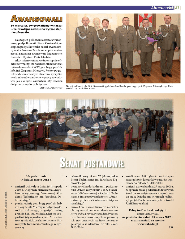 Aktualności 17 awaNsowali 30 marca br. świętowaliśmy w naszej uczelni kolejne awanse na wyższe stopnie oficerskie. Na stopień pułkownika został awansowany podpułkownik Piotr Kaniewski, na stopień podpułkownika został awansowany major Jarosław Bareła, na stopień majora zostali natomiast awansowani kapitanowie: Radosław Ryniec i Piotr Jakubik. Akty mianowań na wyższe stopnie oficerskie wręczył bohaterom uroczystości rektor-komendant WAT gen. bryg. prof. dr hab. inż. Zygmunt Mierczyk. Rektor pogratulował awansowanym oficerom, życzył im wielu sukcesów zarówno w pracy zawodowej, jak i w życiu osobistym. My również dołączamy się do tych życzeń. Elżbieta Dąbrowska Na zdj. od lewej: płk Piotr Kaniewski, ppłk Jarosław Bareła, gen. bryg. prof. Zygmunt Mierczyk, mjr Piotr Jakubik, mjr Radosław Ryniec SENAT POSTANOWIŁ Fot. Joanna Kulhawik, Grzegorz Rosiński Na posiedzeniu w dniu 29 marca 2012 r.: • uchwaliłnowy„StatutWojskowejAka demii Technicznej im. Jarosława Dąbrowskiego” • zmieniłuchwałęz dnia26 listopada • postanowiłnadaćz dniem1 paździer 2009 r. w sprawie uchwalenia „Regunika 2012 r. audytorium 315 w budynlaminu wyborczego Wojskowej Akaku nr 100 Wojskowej Akademii Techdemii Technicznej im. Jarosława Dąnicznej imię osoby zasłużonej: „Audybrowskiego” torium profesora Kazimierza Dzięcio• przyjąłopinięgen.bryg.prof.dr.hab. łowskiego” inż. Zygmunta Mierczyka dotyczącą do- • zwróciłsięz wnioskiemdoministra robku naukowego, osiągnięć i zasług obrony narodowej o ustalenie warunprof. dr. hab. inż. Michała Kleibera i poków i trybu przyjmowania kandydatów parł inicjatywę nadania prof. M. Kleibena żołnierzy zawodowych na pierwszy rowi tytułu doktora honoris causa Unirok stacjonarnych studiów pierwszewersytetu Kazimierza Wielkiego w Bydgo stopnia w Akademii w roku akad. goszczy 2013/2014 • ustaliłwarunkii trybrekrutacjidlapo szczególnych kierunków studiów wyższych na rok akad. 2013/2014 • zmieniłuchwałęz dnia27 marca2008 r. w sprawie zasad podziału dodatkowych środków na zwiększenie wynagrodzenia za pracę świadczoną w ramach realizacji projektów finansowanych ze źródeł Unii Europejskiej. Pełną treść uchwał podjętych przez Senat WAT na posiedzeniu w dniu 29 marca 2012 r. można znaleźć na stronie: www.wat.edu.pl E.D.