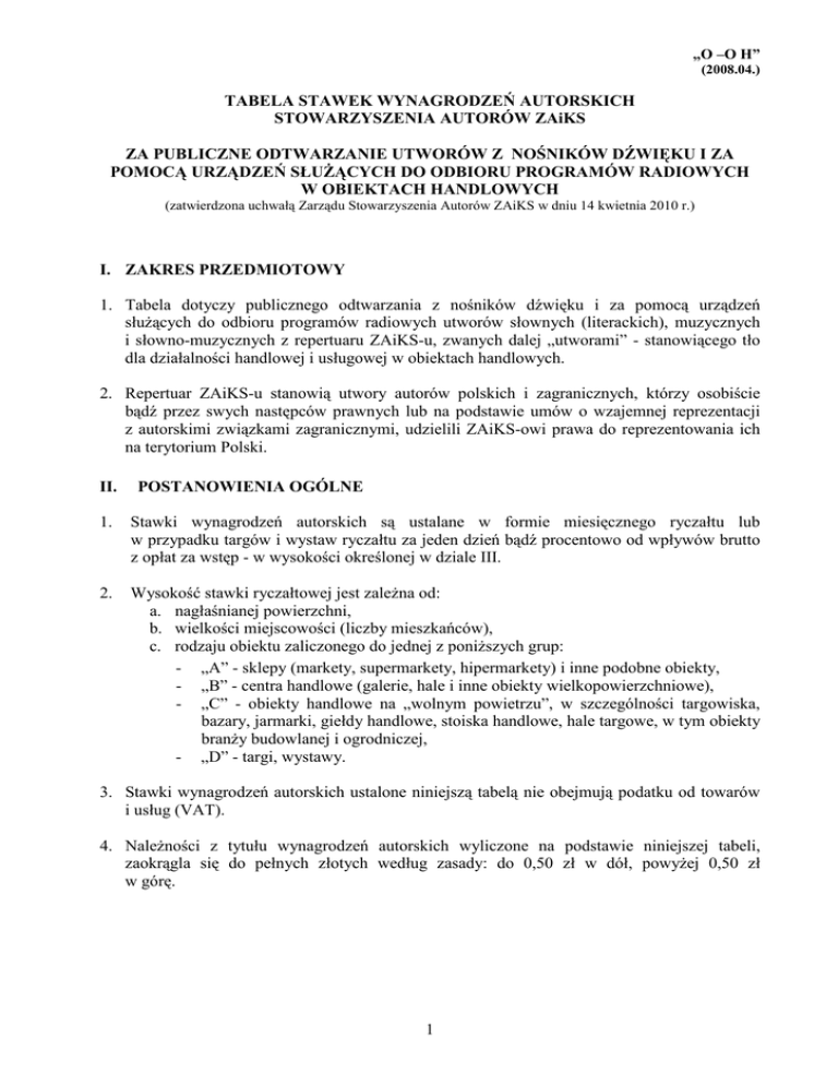 „O –O H” (2008.04.) TABELA STAWEK WYNAGRODZEŃ AUTORSKICH STOWARZYSZENIA AUTORÓW ZAiKS ZA PUBLICZNE ODTWARZANIE UTWORÓW Z NOŚNIKÓW DŹWIĘKU I ZA POMOCĄ URZĄDZEŃ SŁUśĄCYCH DO ODBIORU PROGRAMÓW RADIOWYCH W OBIEKTACH HANDLOWYCH (zatwierdzona uchwałą Zarządu Stowarzyszenia Autorów ZAiKS w dniu 14 kwietnia 2010 r.) I. ZAKRES PRZEDMIOTOWY 1. Tabela dotyczy publicznego odtwarzania z nośników dźwięku i za pomocą urządzeń słuŜących do odbioru programów radiowych utworów słownych (literackich), muzycznych i słowno-muzycznych z repertuaru ZAiKS-u, zwanych dalej „utworami” - stanowiącego tło dla działalności handlowej i usługowej w obiektach handlowych. 2. Repertuar ZAiKS-u stanowią utwory autorów polskich i zagranicznych, którzy osobiście bądź przez swych następców prawnych lub na podstawie umów o wzajemnej reprezentacji z autorskimi związkami zagranicznymi, udzielili ZAiKS-owi prawa do reprezentowania ich na terytorium Polski. II. POSTANOWIENIA OGÓLNE 1. Stawki wynagrodzeń autorskich są ustalane w formie miesięcznego ryczałtu lub w przypadku targów i wystaw ryczałtu za jeden dzień bądź procentowo od wpływów brutto z opłat za wstęp - w wysokości określonej w dziale III. 2. Wysokość stawki ryczałtowej jest zaleŜna od: a. nagłaśnianej powierzchni, b. wielkości miejscowości (liczby mieszkańców), c. rodzaju obiektu zaliczonego do jednej z poniŜszych grup: - „A” - sklepy (markety, supermarkety, hipermarkety) i inne podobne obiekty, - „B” - centra handlowe (galerie, hale i inne obiekty wielkopowierzchniowe), - „C” - obiekty handlowe na „wolnym powietrzu”, w szczególności targowiska, bazary, jarmarki, giełdy handlowe, stoiska handlowe, hale targowe, w tym obiekty branŜy budowlanej i ogrodniczej, - „D” - targi, wystawy. 3. Stawki wynagrodzeń autorskich ustalone niniejszą tabelą nie obejmują podatku od towarów i usług (VAT). 4. NaleŜności z tytułu wynagrodzeń autorskich wyliczone na podstawie niniejszej tabeli, zaokrągla się do pełnych złotych według zasady: do 0,50 zł w dół, powyŜej 0,50 zł w górę. 1 „O –O H” (2008.04.) III. STAWKI RYCZAŁTOWE 1. W obiektach grupy „A” a. powierzchni całkowitej do 2 500 m2 0 21 20 30 41,00 zł 43,56 zł 44,28 zł 47,05 zł 45,92 zł 48,79 zł 47,56 zł 50,53 zł Kraków Poznań Trójmiasto Wrocław Podregion Centralny Śląski Warszawa 49,20 zł 52,28 zł 31 40 46,13 zł 49,82 zł 51,66 zł 53,51 zł 55,35 zł 41 50 48,69 zł 52,58 zł 54,53 zł 56,48 zł 58,43 zł 51 60 51,25 zł 55,35 zł 57,40 zł 59,45 zł 61,50 zł 61 70 53,81 zł 58,12 zł 60,27 zł 62,42 zł 64,58 zł 71 80 56,38 zł 60,89 zł 63,14 zł 65,40 zł 67,65 zł 81 90 58,94 zł 63,65 zł 66,01 zł 68,37 zł 70,73 zł 91 100 61,50 zł 66,42 zł 68,88 zł 71,34 zł 73,80 zł 5,54 zł 5,74 zł 5,95 zł 6,15 zł 13,84 zł 14,35 zł 14,86 zł 15,38 zł Powierzchnia nagłaśniana obiektu handlowego w m2 od – do od 101 do 500 od 501 do 2 500 miejscowości o liczbie mieszkańców do 5 tys. kaŜde następne 5,13 zł rozpoczęte 20m2 kaŜde następne 12,81 zł rozpoczęte 100m2 od 5 tys. od 100 tys. powyŜej do 100 tys. do 200 tys. 200 tys Uwaga: w przypadku sieci obiektów handlowych liczących więcej niŜ 20 obiektów i o porównywalnych powierzchniach, moŜna wyznaczyć średnia stawkę zryczałtowaną za 1 obiekt b. powierzchni całkowitej powyŜej 2 500 m2 Powierzchnia nagłaśniana obiektu handlowego (w m2) od – do 2 501 3 000 488,93 zł od 3 001 do 10 000 kaŜde następne rozpoczęte 500m2 34,85 zł 10 001 11 000 1 014,75 zł powyŜej 11 000 kaŜde następne rozpoczęte 1 000m2 2 41,00 zł „O –O H” (2008.04.) 2. W obiektach grupy „B” za nagłośnioną powierzchnię ciągów komunikacyjnych wynosi: 17,94 zł za kaŜde rozpoczęte 100 m2 powierzchni. 3. W obiektach grupy „C” Powierzchnia nagłaśniana obiektu handlowego w m2 od-do Do 100 34,85 zł 101 500 90,20 zł 501 1 000 164,00 zł 1 001 2 000 210,13 zł 2 001 3 000 246,00 zł 3 001 4 000 280,85 zł 4 001 5 000 kaŜde następne rozpoczęte 1 000m2 315,70 zł 10 001 11 000 510,45 zł powyŜej 11 000 kaŜde następne rozpoczęte 1 000m2 20,50 zł od 5 001 do 10 000 34,85 zł 4. W obiektach grupy „D” 1% od wpływów /z wyłączeniem podatku VAT/ uzyskiwanych z opłat za wstęp, jednak nie mniej niŜ wynagrodzenie ryczałtowe określone poniŜej za jeden dzień: Nagłaśniana powierzchnia całkowita w pomieszczeniach zamkniętych zł/m² Nagłaśniana powierzchnia całkowita na „wolnym” powietrzu zł/m² 4,10 zł za kaŜde rozpoczęte 100 m² 2,05 zł za kaŜde rozpoczęte 100m² Za indywidualnie nagłaśniane stoiska, pawilony, ekspozycje w zaleŜności od powierzchni stoiska 15% stawki z działu III pkt 1 lit.a. 3 „O –O H” (2008.04.) IV PODWYśSZENIE STAWKI PodwyŜszenie stawki ryczałtowej do 50 % stawki podstawowej stosuje się w odniesieniu do obiektów grupy „D” dla imprez o zasięgu krajowym i międzynarodowym. V. UPUSTY 1. Upusty stosuje się wyłącznie na podstawie pisemnego wniosku podmiotu publicznie odtwarzającego utwory w następującej wysokości: a dla kontrahentów, którzy wystąpili do Stowarzyszenia Autorów ZAiKS z wnioskiem o zawarcie umowy przed rozpoczęciem publicznego odtwarzania utworów, bez uprzedniego podjęcia działań przez Stowarzyszenie – upust: - do 10% na okres 1 roku, b dla kontrahentów, którzy wpłacili wynagrodzenia autorskie z góry (bez moŜliwości zwrotu w przypadku wcześniejszego zakończenia publicznego odtwarzania utworów) – upusty: - do 15% - przy jednorazowej wpłacie za kwartał, - do 20% - przy jednorazowej wpłacie za pół roku, - do 25% - przy jednorazowej wpłacie za rok, c dla sieci obiektów handlowych, proporcjonalnie do liczby obiektów handlowych w sieci, upusty: - do 5% - przy liczbie od 3 do 9 obiektów w sieci, - do 10% - przy liczbie od 10 do 20 obiektów w sieci, - do 11% - przy liczbie od 21 do 40 obiektów w sieci