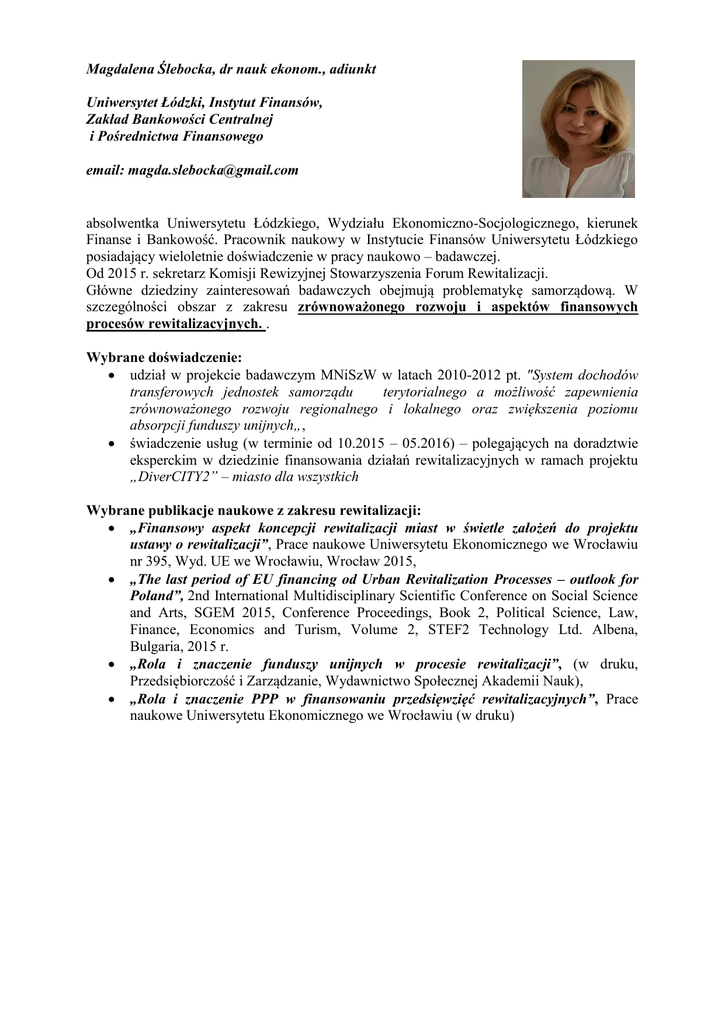 Magdalena Ślebocka, dr nauk ekonom., adiunkt Uniwersytet Łódzki, Instytut Finansów, Zakład Bankowości Centralnej i Pośrednictwa Finansowego email: [email protected] absolwentka Uniwersytetu Łódzkiego, Wydziału Ekonomiczno-Socjologicznego, kierunek Finanse i Bankowość. Pracownik naukowy w Instytucie Finansów Uniwersytetu Łódzkiego posiadający wieloletnie doświadczenie w pracy naukowo – badawczej. Od 2015 r. sekretarz Komisji Rewizyjnej Stowarzyszenia Forum Rewitalizacji. Główne dziedziny zainteresowań badawczych obejmują problematykę samorządową. W szczególności obszar z zakresu zrównoważonego rozwoju i aspektów finansowych procesów rewitalizacyjnych. . Wybrane doświadczenie: udział w projekcie badawczym MNiSzW w latach 2010-2012 pt. "System dochodów transferowych jednostek samorządu terytorialnego a możliwość zapewnienia zrównoważonego rozwoju regionalnego i lokalnego oraz zwiększenia poziomu absorpcji funduszy unijnych„, świadczenie usług (w terminie od 10.2015 – 05.2016) – polegających na doradztwie eksperckim w dziedzinie finansowania działań rewitalizacyjnych w ramach projektu „DiverCITY2” – miasto dla wszystkich Wybrane publikacje naukowe z zakresu rewitalizacji: „Finansowy aspekt koncepcji rewitalizacji miast w świetle założeń do projektu ustawy o rewitalizacji”, Prace naukowe Uniwersytetu Ekonomicznego we Wrocławiu nr 395, Wyd. UE we Wrocławiu, Wrocław 2015, „The last period of EU financing od Urban Revitalization Processes – outlook for Poland”, 2nd International Multidisciplinary Scientific Conference on Social Science and Arts, SGEM 2015, Conference Proceedings, Book 2, Political Science, Law, Finance, Economics and Turism, Volume 2, STEF2 Technology Ltd. Albena, Bulgaria, 2015 r. „Rola i znaczenie funduszy unijnych w procesie rewitalizacji”, (w druku, Przedsiębiorczość i Zarządzanie, Wydawnictwo Społecznej Akademii Nauk), „Rola i znaczenie PPP w finansowaniu przedsięwzięć rewitalizacyjnych”, Prace naukowe Uniwersytetu Ekonomicznego we Wrocławiu (w druku)