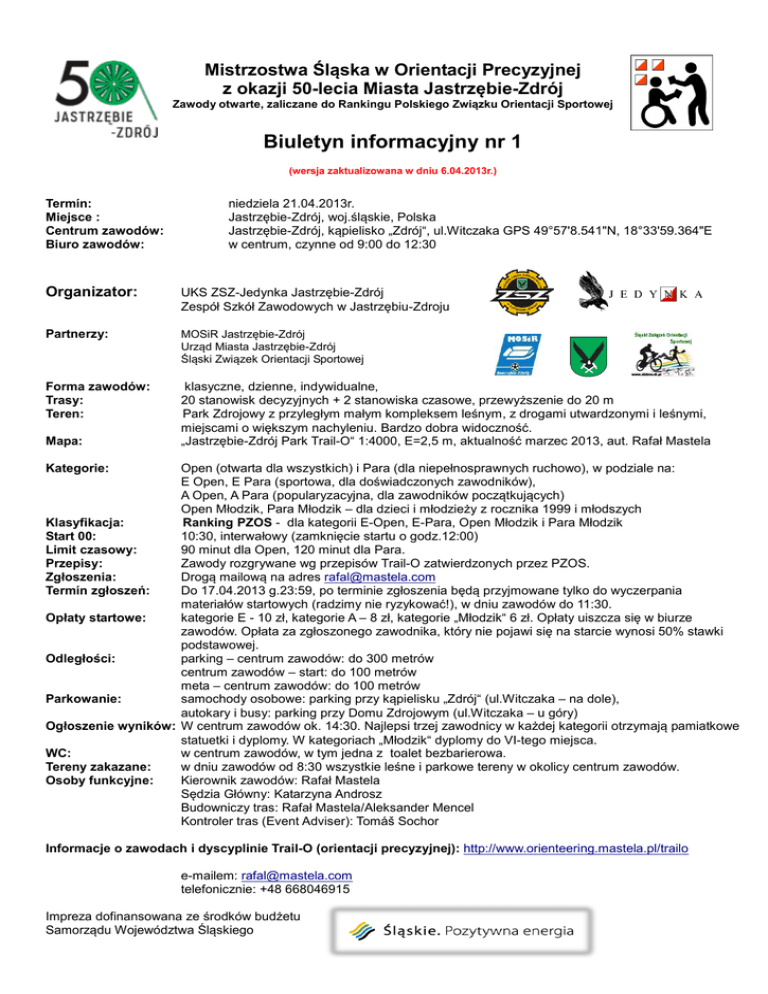 Mistrzostwa Śląska w Orientacji Precyzyjnej z okazji 50-lecia Miasta Jastrzębie-Zdrój Zawody otwarte, zaliczane do Rankingu Polskiego Związku Orientacji Sportowej Biuletyn informacyjny nr 1 (wersja zaktualizowana w dniu 6.04.2013r.) Termín: Miejsce : Centrum zawodów: Biuro zawodów: niedziela 21.04.2013r. Jastrzębie-Zdrój, woj.śląskie, Polska Jastrzębie-Zdrój, kąpielisko „Zdrój“, ul.Witczaka GPS 49°57'8.541"N, 18°33'59.364"E w centrum, czynne od 9:00 do 12:30 Organizator: UKS ZSZ-Jedynka Jastrzębie-Zdrój Zespół Szkół Zawodowych w Jastrzębiu-Zdroju Partnerzy: MOSiR Jastrzębie-Zdrój Urząd Miasta Jastrzębie-Zdrój Śląski Związek Orientacji Sportowej Forma zawodów: Trasy: Teren: klasyczne, dzienne, indywidualne, 20 stanowisk decyzyjnych + 2 stanowiska czasowe, przewyższenie do 20 m Park Zdrojowy z przyległym małym kompleksem leśnym, z drogami utwardzonymi i leśnymi, miejscami o większym nachyleniu. Bardzo dobra widoczność. „Jastrzębie-Zdrój Park Trail-O“ 1:4000, E=2,5 m, aktualność marzec 2013, aut. Rafał Mastela Mapa: Open (otwarta dla wszystkich) i Para (dla niepełnosprawnych ruchowo), w podziale na: E Open, E Para (sportowa, dla doświadczonych zawodników), A Open, A Para (popularyzacyjna, dla zawodników początkujących) Open Młodzik, Para Młodzik – dla dzieci i młodzieży z rocznika 1999 i młodszych Klasyfikacja: Ranking PZOS - dla kategorii E-Open, E-Para, Open Młodzik i Para Młodzik Start 00: 10:30, interwałowy (zamknięcie startu o godz.12:00) Limit czasowy: 90 minut dla Open, 120 minut dla Para. Przepisy: Zawody rozgrywane wg przepisów Trail-O zatwierdzonych przez PZOS. Zgłoszenia: Drogą mailową na adres [email protected] Termín zgłoszeń: Do 17.04.2013 g.23:59, po terminie zgłoszenia będą przyjmowane tylko do wyczerpania materiałów startowych (radzimy nie ryzykować!), w dniu zawodów do 11:30. Opłaty startowe: kategorie E - 10 zł, kategorie A – 8 zł, kategorie „Młodzik“ 6 zł. Opłaty uiszcza się w biurze zawodów. Opłata za zgłoszonego zawodnika, który nie pojawi się na starcie wynosi 50% stawki podstawowej. Odległości: parking – centrum zawodów: do 300 metrów centrum zawodów – start: do 100 metrów meta – centrum zawodów: do 100 metrów Parkowanie: samochody osobowe: parking przy kąpielisku „Zdrój“ (ul.Witczaka – na dole), autokary i busy: parking przy Domu Zdrojowym (ul.Witczaka – u góry) Ogłoszenie wyników: W centrum zawodów ok. 14:30. Najlepsi trzej zawodnicy w każdej kategorii otrzymają pamiatkowe statuetki i dyplomy. W kategoriach „Młodzik“ dyplomy do VI-tego miejsca. WC: w centrum zawodów, w tym jedna z toalet bezbarierowa. Tereny zakazane: w dniu zawodów od 8:30 wszystkie leśne i parkowe tereny w okolicy centrum zawodów. Osoby funkcyjne: Kierownik zawodów: Rafał Mastela Sędzia Główny: Katarzyna Androsz Budowniczy tras: Rafał Mastela/Aleksander Mencel Kontroler tras (Event Adviser): Tomáš Sochor Kategorie: Informacje o zawodach i dyscyplinie Trail-O (orientacji precyzyjnej): http://www.orienteering.mastela.pl/trailo e-mailem: [email protected] telefonicznie: +48 668046915 Impreza dofinansowana ze środków budżetu Samorządu Województwa Śląskiego