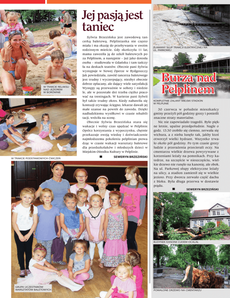 Jej pasją jest taniec w trakcie relaksu naD jeziorem w borównie w trakcie PoDstawowych ćwiczeń Sylwia Brzezińska jest zawodową tancerką baletową. Pelplinianka nie często miała i ma okazję do przebywania w swoim rodzinnym mieście. Gdy skończyła 11 lat, mama zawoziła ją do szkół baletowych poza Pelplinem, a następnie – już jako dorosła osoba – studiowała w Gdańsku i tam tańczyła na deskach teatrów. Obecnie pani Sylwia występuje w Nowej Operze w Bydgoszczy. Jak powiedziała, zawód tancerza baletowego jest trudny i wyczerpujący, niezbyt obecnie dobrze opłacany, ale dający wiele satysfakcji. Występy są przeważnie w soboty i niedziele, ale w pozostałe dni trzeba ciężko pracować na treningach. W karierze pani Sylwii był także trudny okres. Kiedy nabawiła się kontuzji zrywając ścięgno, lekarze dawali jej małe szanse na powrót do zawodu. Dzięki nadludzkiemu wysiłkowi w czasie rehabilitacji, wróciła na scenę. Obecnie Sylwia Brzezińska stara się wakacje i wolny czas spędzać w Pelplinie. Oprócz korzystania z wypoczynku, chętnie przekazuje swoją wiedzę i doświadczenie najmłodszemu pokoleniu pelplinian prowadząc w czasie wakacji warsztaty baletowe dla przedszkolaków i młodszych dzieci w Miejskim Ośrodku Kultury w Pelplinie. SeWeRyn BRzezińSki złamany słuP trakcji elektrycznej na ul. Parkowej Burza nad Pelplinem komPletnie zalany miejski staDion w PelPlinie 30 czerwca w południe mieszkańcy gminy przeżyli pół godziny grozy i ponieśli znaczne straty materialne. Nic nie zapowiadało tragedii. Było piękne letnie, upalne przedpołudnie. Nagle o godz. 13.30 zrobiło się ciemno, zerwała się wichura, a z nieba lunęło tak, jakby ktoś otworzył wielki hydrant. Wszystko trwało około pół godziny. Po tym czasie grozy ludzie z przerażenia przecierali oczy. Na cmentarzu wielkie drzewa powyrywane z korzeniami leżały na pomnikach. Przy katedrze, na szczęście w nieszczęściu, wielkie drzewo nie runęło na kanonię, ale obok. Na ul. Parkowej słupy elektryczne leżały na ulicy, a stadion zamienił się w wielkie jezioro. Przy dworcu zerwało część dachu z bloku. Była długa przerwa w dostawie prądu. SeWeRyn BRzezińSki buDynek kanonii cuDem ocalał uczestników 22 GruPa INFORMATOR PELPLIŃSKI warsztatów baletowych Powalone Drzewo na cmentarzu