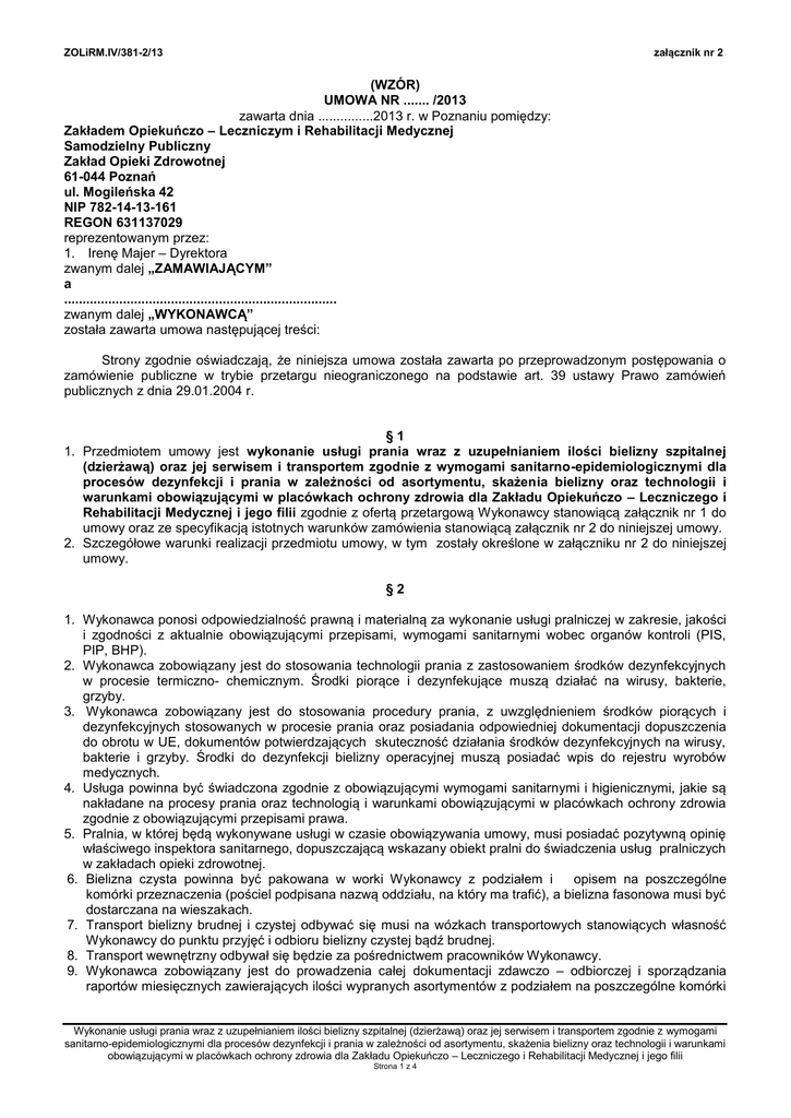 załącznik nr 2 ZOLiRM.IV/381-2/13 (WZÓR) UMOWA NR ....... /2013 zawarta dnia ...............2013 r. w Poznaniu pomiędzy: Zakładem Opiekuńczo – Leczniczym i Rehabilitacji Medycznej Samodzielny Publiczny Zakład Opieki Zdrowotnej 61-044 Poznań ul. Mogileńska 42 NIP 782-14-13-161 REGON 631137029 reprezentowanym przez: 1. Irenę Majer – Dyrektora zwanym dalej „ZAMAWIAJĄCYM” a .......................................................................... zwanym dalej „WYKONAWCĄ” została zawarta umowa następującej treści: Strony zgodnie oświadczają, że niniejsza umowa została zawarta po przeprowadzonym postępowania o zamówienie publiczne w trybie przetargu nieograniczonego na podstawie art. 39 ustawy Prawo zamówień publicznych z dnia 29.01.2004 r. §1 1. Przedmiotem umowy jest wykonanie usługi prania wraz z uzupełnianiem ilości bielizny szpitalnej (dzierżawą) oraz jej serwisem i transportem zgodnie z wymogami sanitarno-epidemiologicznymi dla procesów dezynfekcji i prania w zależności od asortymentu, skażenia bielizny oraz technologii i warunkami obowiązującymi w placówkach ochrony zdrowia dla Zakładu Opiekuńczo – Leczniczego i Rehabilitacji Medycznej i jego filii zgodnie z ofertą przetargową Wykonawcy stanowiącą załącznik nr 1 do umowy oraz ze specyfikacją istotnych warunków zamówienia stanowiącą załącznik nr 2 do niniejszej umowy. 2. Szczegółowe warunki realizacji przedmiotu umowy, w tym zostały określone w załączniku nr 2 do niniejszej umowy. §2 1. Wykonawca ponosi odpowiedzialność prawną i materialną za wykonanie usługi pralniczej w zakresie, jakości i zgodności z aktualnie obowiązującymi przepisami, wymogami sanitarnymi wobec organów kontroli (PIS, PIP, BHP). 2. Wykonawca zobowiązany jest do stosowania technologii prania z zastosowaniem środków dezynfekcyjnych w procesie termiczno- chemicznym. Środki piorące i dezynfekujące muszą działać na wirusy, bakterie, grzyby. 3. Wykonawca zobowiązany jest do stosowania procedury prania, z uwzględnieniem środków piorących i dezynfekcyjnych stosowanych w procesie prania oraz posiadania odpowiedniej dokumentacji dopuszczenia do obrotu w UE, dokumentów potwierdzających skuteczność działania środków dezynfekcyjnych na wirusy, bakterie i grzyby. Środki do dezynfekcji bielizny operacyjnej muszą posiadać wpis do rejestru wyrobów medycznych. 4. Usługa powinna być świadczona zgodnie z obowiązującymi wymogami sanitarnymi i higienicznymi, jakie są nakładane na procesy prania oraz technologią i warunkami obowiązującymi w placówkach ochrony zdrowia zgodnie z obowiązującymi przepisami prawa. 5. Pralnia, w której będą wykonywane usługi w czasie obowiązywania umowy, musi posiadać pozytywną opinię właściwego inspektora sanitarnego, dopuszczającą wskazany obiekt pralni do świadczenia usług pralniczych w zakładach opieki zdrowotnej. 6. Bielizna czysta powinna być pakowana w worki Wykonawcy z podziałem i opisem na poszczególne komórki przeznaczenia (pościel podpisana nazwą oddziału, na który ma trafić), a bielizna fasonowa musi być dostarczana na wieszakach. 7. Transport bielizny brudnej i czystej odbywać się musi na wózkach transportowych stanowiących własność Wykonawcy do punktu przyjęć i odbioru bielizny czystej bądź brudnej. 8. Transport wewnętrzny odbywał się będzie za pośrednictwem pracowników Wykonawcy. 9. Wykonawca zobowiązany jest do prowadzenia całej dokumentacji zdawczo – odbiorczej i sporządzania raportów miesięcznych zawierających ilości wypranych asortymentów z podziałem na poszczególne komórki Wykonanie usługi prania wraz z uzupełnianiem ilości bielizny szpitalnej (dzierżawą) oraz jej serwisem i transportem zgodnie z wymogami sanitarno-epidemiologicznymi dla procesów dezynfekcji i prania w zależności od asortymentu, skażenia bielizny oraz technologii i warunkami obowiązującymi w placówkach ochrony zdrowia dla Zakładu Opiekuńczo – Leczniczego i Rehabilitacji Medycznej i jego filii Strona 1 z 4 załącznik nr 2 ZOLiRM.IV/381-2/13 organizacyjne. Raporty należy dołączyć do faktury. 10. Wykonawca zobowiązany jest tego, aby środki transportu posiadły pozytywną opinię właściwego Powiatowego Inspektora Sanitarnego potwierdzającą spełnienie warunków sanitarnych i dopuszczenie ich do transportu bielizny szpitalnej zgodnie z rozporządzeniem Ministra Zdrowia z dnia 2 lutego 2011 w sprawie wymagań, jakimi powinny odpowiadać pod względem fachowym i sanitarnym pomieszczenia i urządzenia zakładu opieki zdrowotnej (Dz. U. z 2011r Nr 31, poz. 158). 11. Harmonogram odbioru i zwrotu bielizny od Zamawiającego jest szczegółowo określony w załączniku nr 2 do niniejszej umowy. 12. W przypadku wystąpienia dni ustawowo wolnych od pracy Wykonawca zabezpieczy Zamawiającemu czystą bieliznę na okres dni wolnych (szczegółowy zakres będzie uzgadniany z 1 dniowym wyprzedzeniem). W przypadku dwóch dni wolnych od pracy (np. 25 i 26 grudnia) Wykonawca zobowiązany jest do odbioru i dostarczenia całej bielizny, w dniu poprzedzającym (tj. 24 grudnia). 13. Wykonawca przyjmie bieliznę uszkodzoną i niezwłocznie dokona jej naprawy bądź wymiany. 14. Wykonawca zobowiązany jest do bezwzględnego dostarczania bielizny nieuszkodzonej, niezmienionej (przebarwienia np. w wyniku pofarbowania, inne plamy), a w przypadku stwierdzenia przez Zamawiającego wad, Zamawiający nie będzie obciążony kosztami ich usunięcia. 15. W przypadku niedoprania bielizny, usługa zostanie wykonana powtórnie na koszt Wykonawcy nie później niż w ciągu dwóch dni od momentu stwierdzenia w/w defektu. §3 1. Usługi, o których mowa w §1, będą wykonywane przez Wykonawcę własnymi siłami i środkami (w tym własnym personelem, sprzętem, materiałami i urządzeniami oraz środkami transportu) oraz na własny koszt i ryzyko, jak również z najwyższą starannością. 2. Powierzenie wykonywania
