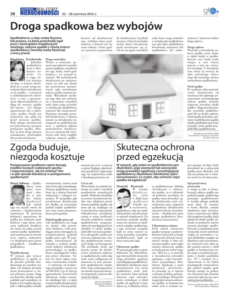 Gazeta Finansowa 20 22 – 28 czerwca 2012 r. Droga spadkowa bez wybojów Spadkobierca, a więc osoba fizyczna lub prawna, na którą przechodzi ogół praw i obowiązków majątkowych zmarłego, nabywa spadek z chwilą śmierci spadkodawcy (zmarłej osoby fizycznej) z mocy prawa. Magdalena Trzaskowska – Jednakże spadkobierca może w określonym terminie (tj. w ciągu sześciu miesięcy od dnia, w którym dowiedział się o tytule swego powołania) złożyć oświadczenie co do spadku – o przyjęciu (z dobrodziejstwem inwentarza, a więc z ograniczeniem odpowiedzialności za długi do wartości spadku lub wprost – bez takiego ograniczenia) lub o odrzuceniu spadku (wtedy jest traktowany tak, jakby nie dożył otwarcia spadku). Brak takiego oświadczenia jest jednoznaczny z prostym przyjęciem spadku. Możliwe są dwie drogi złożenia oświadczenia – przed sądem lub przed notariuszem. bierców od dziedziczenia (np.: nieślubne dzieci spadkodawcy, o których nie wie reszta rodziny, a które zgodnie z prawem są uprawnione do dziedziczenia). Są jednak sytuacje, w których nie będzie można złożyć oświadczenia przed notariuszem, np. jeżeli nie ma zgody wszystkich osób, które mogą wchodzić w rachubę jako spadkobiercy (np. gdy jeden spadkobierca kwestionuje testament) lub spadkodawca był cudzo- Droga notarialna Wizyta u notariusza pomoże nam załatwić wszystkie sprawy spadkowe, niezależnie od tego, kiedy zmarł spadkodawca i czy zostawił testament. Akt poświadczenia dziedziczenia po zarejestrowaniu ma taki sam skutek jak prawomocne postanowienie sądu stwierdzające nabycie spadku (opisane poniżej). Warunkiem uzyskania tego aktu jest stawienie się u notariusza wszystkich osób, które mogą wchodzić w rachubę jako spadkobiercy ustawowi lub testamentowi. Notariusz sporządza protokół dziedziczenia, w którym zawarte są oświadczenia stawiających się spadkobierców m.in. o zgodnym żądaniu poświadczenia dziedziczenia czy o istnieniu lub nieistnieniu osób, które mogłyby wyłączać znanych spadko- ziemcem i konieczna będzie droga sądowa. Droga sądowa Wniosek o stwierdzenie nabycia spadku może złożyć w sądzie każdy ze spadkobierców oraz każda osoba mająca w tym interes prawny, a więc np. wierzyciel zmarłego. Z wnioskiem tym należy się zwrócić do sądu rejonowego właściwego dla ostatniego miejsca zamieszkania spadkodawcy. Dział spadku Po uzyskaniu aktu poświadczenia dziedziczenia od notariusza lub sądowego postanowienia stwierdzającego nabycie spadku, możemy rozpocząć procedurę działu spadku – drogą umowną miedzy wszystkim spadkobiercami lub na drodze sądowej. Dział spadku powoduje zniesienie współwłasności spadku między spadkobiercami, która powstała, jeżeli spadek przypadł kilku spadkobiercom. Autorka jest prawnikiem Działu Nieruchomości i Inwestycji w kancelarii Tomczak i Partnerzy Zgoda buduje, niezgoda kosztuje Skuteczna ochrona przed egzekucją Postępowania spadkowe często bywają źródłem licznych rodzinnych sporów i nieporozumień. Jak ich uniknąć? Kto i w jaki sposób dziedziczy w postępowaniu spadkowym? mowana jest m.in. w oparciu o opinię biegłego odpowiedniej specjalności, legitymującego się znajomością rynku i aktualnego poziomu cen. W sytuacji, gdy jeden ze spadkobierców jest dłużnikiem, jego wierzyciel lub wierzyciele mogą prowadzić egzekucję z przysługującej spadkobiercy-dłużnikowi ułamkowej części nieruchomości. Co zrobić, aby ochronić część spadku od egzekucji? Maciej Sobieraj – Spadkodawca może spisać testament i określić w nim, kto będzie dziedziczył. Jeśli jednak tego nie uczynił, mamy do czynienia z dziedziczeniem ustawowym. W pierwszej kolejności uprawniony do spadku jest małżonek spadkodawcy i jego dzieci, przy czym małżonek dziedziczy nie mniej niż jedną czwartą wartości spadku. Spadkobiercami ustawowymi są również m.in. rodzice, rodzeństwo i w określonych przez prawo przypadkach - dziadkowie spadkodawcy. Coś za coś Warto dodać, że podziału dokonuje się wobec wszystkich przedmiotów stanowiących spadek. Budynek mieszkalny na terenie nieruchomości będzie więc odrębnym przedmiotem podziału spadku, tak samo jak np. znajdujące się w nim elementy wyposażenia. Odziedziczone przedmioty zostają w miarę możliwości fizycznie podzielone między spadkobierców, proporcjonalnie do przysługujących im udziałów w całości spadku. Jeżeli dóbr nie można podzielić w taki sposób, możliwe jest wówczas dokonywanie między spadkobiercami stosownych dopłat wyrównujących. Dla przykładu, kiedy sąd przyzna prawo do dziedziczenia mieszkania jednemu ze spadkobierców, osoba taka może zostać zobligowana do uiszczenia na rzecz pozostałych spadkobierców dopłat, które maja zrekompensować im wartość utraconych korzyści związanych z prawem własności do lokalu. Wspólna decyzja W sytuacji, gdy wszyscy spadkobiercy są zgodni co do sposobu podziału dziedziczonego po zmarłym majątku, ich ustalenia powinny zostać potwierdzone w formie pisemnej umowy. Mogą oni dowolnie określać zasady podziału pod warunkiem, że będzie to ich wspólna decyzja. Jeśli w skład spadku wchodzi nieruchomość, umowa musi mieć formę aktu notarialnego. Niestety, spadkobiercy muszą liczyć się z dużymi kosztami związanymi z usługami notariusza. W przypadku, gdy przedmiotem dziedziczenia jest działka, jej ewentualny podział między spadkobierców musi zostać przeprowadzony przez geodetę. Podział spadku przez sąd Gdy spadkobiercy nie mogą się między sobą porozumieć, każdemu z nich przysługuje prawo domagania się przeprowadzenia podziału spadku przez sąd. W przypadku nieruchomości do wniosku o podział spadku trzeba dołączyć dokumenty potwierdzające, że spadkodawcy przysługiwało wobec niej prawo własności. Należy też uiścić opłatę związaną z wniesieniem wniosku – w zależności od konkretnego przy