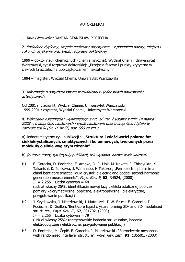 AUTOREFERAT 1. Imię i Nazwisko: DAMIAN STANISŁAW POCIECHA 2. Posiadane dyplomy, stopnie naukowe/ artystyczne – z podaniem nazwy, miejsca i roku ich uzyskania oraz tytułu rozprawy doktorskiej. 1999 – doktor nauk chemicznych (chemia fizyczna), Wydział Chemii, Uniwersytet Warszawski, tytuł rozprawy doktorskiej: „Przejścia fazowe i punkty krytyczne w ciekłych kryształach z uporządkowaniem heksatycznym” 1994 – magister, Wydział Chemii, Uniwersytet Warszawski 3. Informacje o dotychczasowym zatrudnieniu w jednostkach naukowych/ artystycznych. Od 2001 r. : adiunkt, Wydział Chemii, Uniwersytet Warszawski 1999-2001 : asystent, Wydział Chemii, Uniwersytet Warszawski 4. Wskazanie osiągnięcia* wynikającego z art. 16 ust. 2 ustawy z dnia 14 marca 2003 r. o stopniach naukowych i tytule naukowym oraz o stopniach i tytule w zakresie sztuki (Dz. U. nr 65, poz. 595 ze zm.): a) Jednotematyczny cykl publikacji : „Struktura i właściwości polarne faz ciekłokrystalicznych, smektycznych i kolumnowych, tworzonych przez molekuły o silnie wygiętym rdzeniu” b) (autor/autorzy, tytuł/tytuły publikacji, rok wydania, nazwa wydawnictwa): H1. E. Gorecka, D. Pociecha, F. Araoka, D. R. Link, M. Nakata, J. Thisayukta, Y. Takanishi, K. Ishikawa, J. Watanabe, H.Takezoe, „Ferroelectric phase in a chiral bent-core smectic liquid crystal: dielectric and optical second-harmonic generation measurements”, Phys. Rev. E, 62, R4524, (2000) IF = 2.255 Liczba cytowań = 64 (udział własny 25%: identyfikacja nowej fazy ciekłokrystalicznej poprzez pomiary kalorymetryczne, optyczne, elektrooptyczne i dielektryczne, przygotowanie publikacji) H2. J. Szydlowska, J. Mieczkowski, J. Matraszek, D.W. Bruce, E. Gorecka, D. Pociecha, D. Guillon, ‘Bent-core liquid crystals forming 2D- and 3D- modulated structures’, Phys. Rev. E., 67, 031702, (2003) IF = 2.255 Liczba cytowań = 79 (udział własny 25%: rentgenowskie badania strukturalne, badania elektrooptyczne i elektryczne, przygotowanie publikacji) H3. D. Pociecha, M. Čepič, E. Gorecka, J. Mieczkowski , "Ferroelectric mesophase with randomized interlayer structure", Phys. Rev. Lett., 91, 185501, (2003) IF = 7.37 Liczba cytowań = 32 (udział własny 50%: zainicjowanie badań, identyfikacja faz, pomiary dielektryczne, optyczne, opracowanie modelu nowej fazy, przygotowanie publikacji) H4. E. Gorecka, N. Vaupotič, D. Pociecha, M. Čepič, J. Mieczkowski, 'Switching mechanism in polar columnar mesophases made of bent-core molecules', ChemPhysChem, 6, 1087, (2005) IF = 3.412 Liczba cytowań = 35 (udział własny 30%: badania rentgenowskie, dielektryczne, elektrooptyczne, przygotowanie publikacji) H5. V. Novotna, V. Hamplova, M. Kaspar, M. Glogarova, D. Pociecha, ‘Switching of chirality from racemic to homochiral state in new liquid crystalline monomers with bent-core molecules’, Liq. Cryst. 32, 1115, (2005) IF = 1.858 Liczba cytowań = 17 (udział własny 20%: pomiary rentgenowskie, interpretacja wyników, przygotowanie publikacji) H6. D. Pociecha, E. Gorecka, M. Čepič, N. Vaupotič, K. Gomola, J. Mieczkowski, ‘Paraelectric-antiferroelectric phase transition in achiral liquid crystals, Phys. Rev. E 72, 060701R, (2005) IF = 2.255 Liczba cytowań = 16 (udział własny 50%: zainicjowanie badań, pomiary kalorymetryczne, optyczne, dielektryczne, rentgenowskie, przygotowanie publikacji) H7. Y. Shimbo, Y. Takanishi, K. Ishikawa, E. Gorecka, D. Pociecha, J. Mieczkowski, K. Gomola and H. Takezoe, ‘Ideal liquid crystal display mode using achiral banana-shaped liquid lrystals’, Jpn. J. Appl. Phys., 45, L282–L284, (2006) IF = 1.058 Liczba cytowań = 38 (udział własny 20%: interpretacja wyników, przygotowanie publikacji) H8. D. Pociecha, E. Gorecka, M. Čepič, N. Vaupotič, W. Weissflog, „Polar order and tilt in achiral smectic phases”, Phys. Rev. E, 74, 021702, (2006) IF = 2.255 Liczba cytowań = 11 (udział własny 50%: zainicjowanie badań, badania optyczne, dielektryczne, rentgenowskie, przygotowanie publikacji) H9. Y. Shimbo, E. Gorecka, D. Pociecha, F. Araoka, M. Goto, Y. Takanishi, K. Ishikawa, J. Mieczkowski, K. Gomola and H. Takezoe, “Electric-field-induced polar biaxial order in a non-tilted smectic phase of an asymmetric bent-core liquid crystal”, Phys. Rev. Lett., 97, 113901 (2006) IF = 7.37 Liczba cytowań = 33 (udział własny 15%: interpretacja wyników, przygotowanie publikacji) H10. E. Gorecka, N. Vaupotic, D. Pociecha, „Electron Density Modulations in Columnar Banana Phases”, Chem. Mater., 19, 3027-3031, (2007) IF = 7.282 Liczba cytowań = 12 (udział własny 40%: zainicjowanie badań, rentgenowskie badania strukturalne, opracowanie metody analizy dyfraktogramów, przygotowanie publikacji) H11. D. Pociecha, N. Vaupotič, E. Gorecka, J. Mieczkowski, K. Gomola, „2-D Density modulated structures in asymmetric bent-core liquid crystals”, J. Mater. Chem., 18, 881, (2008) IF = 5.968 Liczba cytowań = 8 (udział własny 50%: zainicjowanie badań, rentgenowskie badania strukturalne, pomiary optyczne, przygotowanie publikacji ) H12. D. Pociecha, K. Ohta, A. Januszko, P. Kaszynski, Y. Endo, „Symmetric bentcore mesogens with m-carborane and adamantane as the central units”, J. Mater. Chem., 18, 2978-2982, (2008) IF = 5.968 Liczba cytowań = 2 (udział własny 25%: badania rentgenowskie i elektrooptyczne, identyfikacja faz) H13. E. Gorecka, D. Pociecha, N. Vaupotič, M. Čepič, K. Gomola, J. Mieczkowski, „Modulated general tilt structures in bent-core liquid crystals”, J. Mater. Chem., 18, 3044 – 3049, (2008) IF = 5.968 Liczba cytowań = 14 (udział własny 30%: identyfikacja faz, badania strukturalne, przygotowanie publikacji ) H14. N. Vaupotič, D. Pociecha M. Čepič, K. Gomola, J. Mieczkowski, E. Gorecka, ‘Evidence for general tilt columnar liquid crystalline phase’, Soft Matter, 5, 2281–2285, (2009) IF = 4.39 Liczba cytowań = 6 (udział własny 30%: identyfikacja faz, badania strukturalne, przygotowanie 