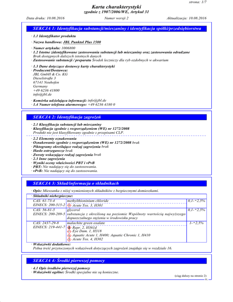 43.0 strona: 1/7 Karta charakterystyki zgodnie z 1907/2006/WE, Artykuł 31 Data druku: 10.08.2016 Numer wersji 2 Aktualizacja: 10.08.2016 SEKCJA 1: Identyfikacja substancji/mieszaniny i identyfikacja spółki/przedsiębiorstwa · 1.1 Identyfikator produktu · Nazwa handlowa: JBL Punktol Plus 1500 · Numer artykułu: 1006800 · 1.2 Istotne zidentyfikowane zastosowania substancji lub mieszaniny oraz zastosowania odradzane Brak dostępnych dalszych istotnych danych · Zastosowanie substancji / preparatu Środek leczniczy dla ryb ozdobnych w akwarium · 1.3 Dane dotyczące dostawcy karty charakterystyki · Producent/Dostawca: JBL GmbH & Co. KG Dieselstraße 3 67141 Neuhofen Germany +49 6236 41800 [email protected] · Komórka udzielająca informacji: [email protected] · 1.4 Numer telefonu alarmowego: +49 6236 4180 0 SEKCJA 2: Identyfikacja zagrożeń · 2.1 Klasyfikacja substancji lub mieszaniny · Klasyfikacja zgodnie z rozporządzeniem (WE) nr 1272/2008 Produkt nie jest klasyfikowany zgodnie z przepisami CLP. · 2.2 Elementy oznakowania · Oznakowanie zgodnie z rozporządzeniem (WE) nr 1272/2008 brak · Piktogramy określające rodzaj zagrożenia brak · Hasło ostrzegawcze brak · Zwroty wskazujące rodzaj zagrożenia brak · 2.3 Inne zagrożenia · Wyniki oceny właściwości PBT i vPvB · PBT: Nie nadający się do zastosowania. · vPvB: Nie nadający się do zastosowania. SEKCJA 3: Skład/informacja o składnikach · Opis: Mieszanka z niżej wymienionych składników z bezpiecznymi domieszkami. · Składniki niebezpieczne: CAS: 61-73-4 methylthioninium chloride 0,1-≤ 2,5% EINECS: 200-515-2 d Acute Tox. 3, H301 ~ CAS: 56-81-5 glycerol 0,1-≤ 2,5% EINECS: 200-289-5 substancja z określoną na poziomie Wspólnoty wartością najwyższego dopuszczalnego stężenia w środowisku pracy CAS: 2437-29-8 malachite green oxalate 1-≤ 2,5% EINECS: 219-441-7 d Repr. 2, H361d ~ Eye Dam. 1, H318 ~ d Aquatic Acute 1, H400; Aquatic Chronic 1, H410 ~ d Acute Tox. 4, H302 ~ d · Wskazówki dodatkowe: Pełna treść przytoczonych wskazówek dotyczących zagrożeń znajduje się w rozdziale 16. SEKCJA 4: Środki pierwszej pomocy · 4.1 Opis środków pierwszej pomocy · Wskazówki ogólne: Środki specjalne nie są konieczne. (ciąg dalszy na stronie 2) PL 43.0 strona: 2/7 Karta charakterystyki zgodnie z 1907/2006/WE, Artykuł 31 Data druku: 10.08.2016 Numer wersji 2 Aktualizacja: 10.08.2016 Nazwa handlowa: JBL Punktol Plus 1500 (ciąg dalszy od strony 1) · Po wdychaniu: Dostarczyć świeże powietrze, w razie dolegliwości wezwać lekarza. · Po styczności ze skórą: Ogólnie produkt nie działa drażniąco na skórę. · Po styczności z okiem: Płukać oczy z otwartą powieką przez kilka minut pod bieżącą wodą. · Po przełknięciu: Przy trwałych dolegliwościach porozumieć się z lekarzem. · 4.2 Najważniejsze ostre i opóźnione objawy oraz skutki narażenia Brak dostępnych dalszych istotnych danych · 4.3 Wskazania dotyczące wszelkiej natychmiastowej pomocy lekarskiej i szczególnego postępowania z poszkodowanym Brak dostępnych dalszych istotnych danych SEKCJA 5: Postępowanie w przypadku pożaru · 5.1 Środki gaśnicze · Przydatne środki gaśnicze: CO2, proszek gaśniczy lub strumień wody. Większy pożar zwalczać strumieniem wody lub pianą odporną na działanie alkoholu. · 5.2 Szczególne zagrożenia związane z substancją lub mieszaniną Brak dostępnych dalszych istotnych danych · 5.3 Informacje dla straży pożarnej · Specjalne wyposażenie ochronne: Środki specjalne nie są konieczne. SEKCJA 6: Postępowanie w przypadku niezamierzonego uwolnienia do środowiska · 6.1 Indywidualne środki ostrożności, sprzęt ochronny i procedury w sytuacjach awaryjnych Nie konieczne. · 6.2 Środki ostrożności w zakresie ochrony środowiska: Nie dopuścić do przedostania się do kanalizacji lub zbiorników wodnych. W przypadku przedostania się do zbiorników wodnych lub kanalizacji zawiadomić właściwe władze. · 6.3 Metody i materiały zapobiegające rozprzestrzenianiu się skażenia i służące do usuwania skażenia: Nie zmywać wodą ani wodnymi środkami myjącymi. · 6.4 Odniesienia do innych sekcji Informacje na temat bezpiecznej obsługi patrz rozdział 7. Informacje na temat osobistego wyposażenia ochronnego patrz rozdział 8. Informacje na temat utylizacji patrz rozdział 13. SEKCJA 7: Postępowanie z substancjami i mieszaninami oraz ich magazynowanie · 7.1 Środki ostrożności dotyczące bezpiecznego postępowania Środki specjalne nie są konieczne. · Wskazówki dla ochrony przeciwpożarowej i przeciwwybuchowej: Nie są potrzebne szczególne zabiegi. · 7.2 Warunki bezpiecznego magazynowania, w tym informacje dotyczące wszelkich wzajemnych niezgodności · Składowanie: · Wymagania w stosunku do pomieszczeń składowych i zbiorników: Brak szczególnych wymagań. · Wskazówki odnośnie wspólnego składowania: Nie konieczne. · Dalsze wskazówki odnośnie warunków składowania: Brak. · 7.3 Szczególne zastosowanie(-a) końcowe Brak dostępnych dalszych istotnych danych SEKCJA 8: Kontrola narażenia/środki ochrony indywidualnej · Dodatkowe wskazówki dla wykonania urządzeń technicznych: Brak dalszych danych, patrz punkt 7. · 8.1 Parametry dotyczące kontroli · Składniki wraz z kontrolowanymi wartościami granicznymi zależnymi od miejsca pracy: 56-81-5 glycerol NDS NDS: 10 mg/m3 frakcja wdychalna (ciąg dalszy na stronie 3) PL 43.0 strona: 3/7 Karta charakterystyki zgodnie z 1907/2006/WE, Artykuł 31 Data druku: 10.08.2016 Numer wersji 2 Aktualizacja: 10.08.2016 Nazwa handlowa: JBL Punktol Plus 1500 (ciąg dalszy od strony 2) · Wskazówki dodatkowe: Podstawą były aktualnie obowiązujące wykazy. · 8.2 Kontrola narażenia · Osobiste wyposażenie ochronne: · Ogólne środki ochrony i higieny: Należy przestrzegać zwyczajne środki ostrożności przy obchodzeniu się z chemikaliami. · Ochrona dróg oddechowych: Nie konieczne. · Ochrona r