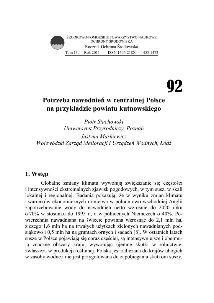 ŚRODKOWO-POMORSKIE TOWARZYSTWO NAUKOWE OCHRONY ŚRODOWISKA Rocznik Ochrona Środowiska Tom 13. Rok 2011 ISSN 1506-218X 1453-1472 92 Potrzeba nawodnień w centralnej Polsce na przykładzie powiatu kutnowskiego Piotr Stachowski Uniwersytet Przyrodniczy, Poznań Justyna Markiewicz Wojewódzki Zarząd Melioracji i Urządzeń Wodnych, Łódź 1. Wstęp Globalne zmiany klimatu wywołują zwiększanie się częstości i intensywności ekstremalnych zjawisk pogodowych, w tym susz, w skali lokalnej i regionalnej. Badania pokazują, że w wyniku zmian klimatu i warunków ekonomicznych rolnictwa w południowo-wschodniej Anglii zapotrzebowanie wody do nawodnień netto wzrośnie do 2020 roku o 70% w stosunku do 1995 r., a w północnych Niemczech o 40%. Powierzchnia nawadniana na świecie powinna wzrosnąć do 2,1 mln ha, z czego 1,6 mln ha na trwałych użytkach zielonych nawadnianych podsiąkowo i 0,5 mln ha na gruntach ornych i sadach [8]. W ostatnich latach susze w Polsce pojawiają się coraz częściej, są intensywniejsze i obejmują znaczne obszary kraju, wywołując ujemne skutki w rolnictwie, zwłaszcza w produkcji roślinnej. Polska jest zaliczana do krajów ubogich w zasoby wodne i nie jest przygotowana do zapobiegania skutkom suszy, 1454 Piotr Stachowski, Justyna Markiewicz ponieważ istnieje dysproporcja między suszami w rolnictwie a powierzchnią nawadnianą i ilością wody pobieraną do nawodnień. Nawet w latach przeciętnych i mokrych w środkowej części dorzecza Warty, w którym w okresie wegetacyjnym suma opadów wynosi od 240 do 290 mm, występują niedobory wody [10]. W latach suchych, w których opady w okresie wegetacyjnym są znacznie niższe (około 150 mm) niedobory wody dla uprawianych roślin są bardzo duże i mogą osiągnąć wartość nawet 250 mm. W chwili obecnej w Polsce nawodnienia odgrywają znikomą rolę zarówno w produkcji rolnej, jak i gospodarce wodnej. Są stosowane zaledwie na około 0,5% powierzchni użytków rolnych. W Polsce obszar wyposażony w urządzenia i systemy nawodnień w 2007 roku wynosił 415000 ha, z tego: 365000 ha systemy grawitacyjne, 49000 ha systemy ciśnieniowe. Powierzchnia nawadniana zmniejszyła się o 75% w stosunku do 1990 roku. Do prowadzenia nawodnień przystosowano zaledwie 440000 ha użytków rolnych głównie użytków zielonych (76000 ha) tj. nieco ponad 2% wszystkich użytków rolnych. W ostatnich latach wdrażane są prawie wyłącznie nowoczesne systemy nawodnień deszczowniach na obszarze około 10 000 ha, jak deszczownie pasmowe, nawodnienia kroplowe, mikronawodnienia lub nawodnienia wgłębne, których zakres ogranicza się przeważnie do sadów, warzyw, szkółek lub upraw specjalnych. Do programu rozwoju melioracji nawadniających należy włączyć również działania w zakresie zwiększenia małej retencji wodnej w krajobrazie rolniczym, traktując ją jako jeden ze sposobów wzbogacenia określonych siedlisk w wodę. W opracowanym przez Podkładka i Nyca [9] wskaźniku potencjalnych potrzeb melioracji nawadniających w Polsce, w wysokości: 2100 tys. ha, w tym 1600 tys. ha na trwałych użytkach zielonych i 500 tys. ha na gruntach ornych, wysokość tych potrzeb w Polsce centralnej jest ogromna. Na użytkach zielonych potrzeby melioracji nawadniających sięgają powierzchni 82 tys. ha, a na gruntach ornych na powierzchni 44 tys. ha [5, 9]. Rolnictwo jest jedną z ważniejszych gałęzi produkcji w tej części Polski ze stosunkowo dobrymi glebami oraz rozmaitością upraw. Jednak na ilość i jakość uzyskiwanych plonów ogromny wpływ wywiera przebieg warunków klimatycznych, gdyż region ten jest zaliczany do obszarów z najniższymi opadami w kraju. W wieloleciu 1951÷1990 najniższe Potrzeba nawodnień w centralnej Polsce… 1455 średnie roczne opady w tym rejonie (około 510 mm) notowane są w rejonie Koła, a najwyższe (około 550 mm) w rejonie Płocka. Potrzeba rozwoju nawodnień w tej części kraju wynika również z bardzo niekorzystnego przebiegu warunków meteorologicznych, przede wszystkim opadów atmosferycznych. Województwo łódzkie w hierarchii potrzeb małej retencji zostało zakwalifikowane w całości do II strefy największych potrzeb retencji, a północno-zachodnia jego część – powiat kutnowski do I strefy [7]. Nawodnienia na tym obszarze podobnie, jak w Polsce mają charakter interwencyjny i uzupełniają okresowy niedobór opadów. Są potrzebne w krótszych bądź dłuższych okresach w czasie trwania okresu wegetacyjnego, w których występują częste i silne susze. Można przyjąć, że statystycznie raz na 3 lata istnieje potrzeba stosowania nawodnień. Dalszy rozwój nawodnień przy braku naturalnych zbiorników wodnych i małych zasobach rzek województwa łódzkiego (dopływów głównych rzek województwa) możliwy jest przez zwiększanie zasobów wody to jest między innymi budowę zbiorników retencyjnych. 2. Materiał i metody badań Celem pracy była ocena potrzeb zastosowania nawodnień w centralnej Polsce, ze szczególnym uwzględnieniem powiatu kutnowskiego, na tle uwarunkowań klimatyczno-przyrodniczych występujących na tym obszarze. Potrzeby nawadniania użytków rolnych na tym obszarze określono na podstawie: analizy klimatycznych bilansów wodnych w wieloleciu 1949÷2008, a także w okresach wegetacyjnych w różnym przebiegu warunków meteorologicznych, efektów produkcyjnych już stosowanych nawodnień deszczownianych w gospodarstwie indywidualnym, informacji i opinii Terenowych Inspektoratów Wojewódzkiego Zarządu Melioracji i Urządzeń Wodnych oraz WZMiUW w Łodzi. Zebrane wnioski zweryfikowano m.in. w czasie praktyki współautorki pracy w Urzędzie Miasta oraz Urzędu Gminy Kutno i pracy w WZMiUW w Łodzi. 1456 Piotr Stachowski, Justyna Markiewicz W pracy wykorzystano materiały: dane Urzędu Statystycznego w Łodzi. dane i opracowania uzyskane w Urzędzie Miasta oraz Urzędu Gminy Kutno w ramach własnej praktyki współautorki pracy, dane G