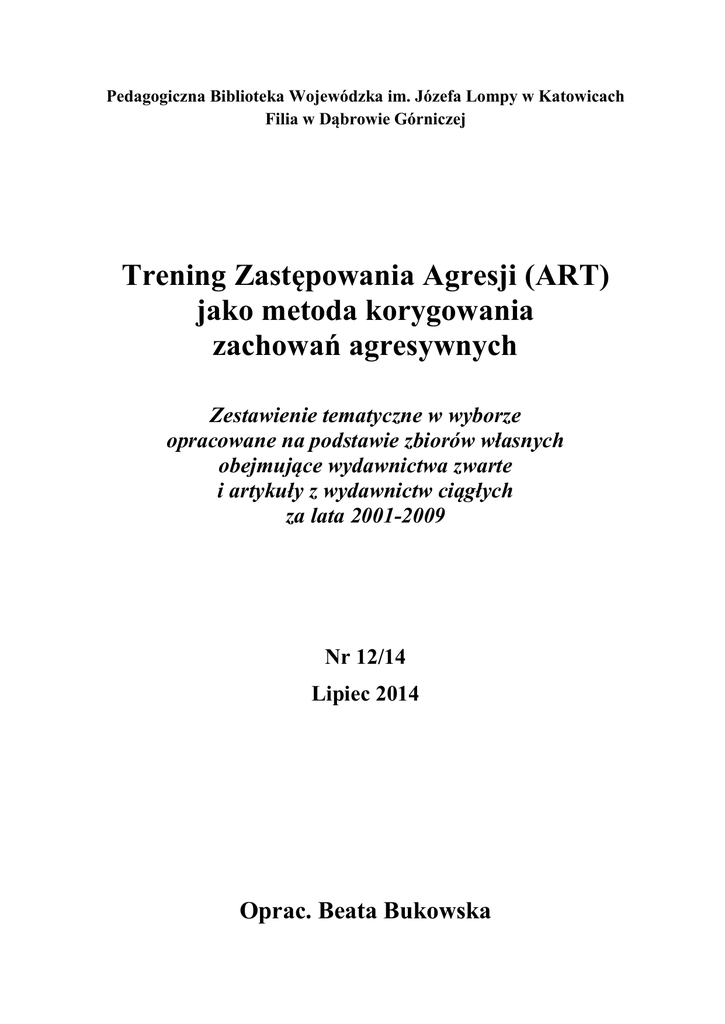 Pedagogiczna Biblioteka Wojewódzka im. Józefa Lompy w Katowicach Filia w Dąbrowie Górniczej Trening Zastępowania Agresji (ART) jako metoda korygowania zachowań agresywnych Zestawienie tematyczne w wyborze opracowane na podstawie zbiorów własnych obejmujące wydawnictwa zwarte i artykuły z wydawnictw ciągłych za lata 2001-2009 Nr 12/14 Lipiec 2014 Oprac. Beata Bukowska Artykuły w wydawnictwach zwartych : 1. AGRESSION Replacement Training (ART) jako przykład zastosowania komponentu behawioralno-poznawczego w resocjalizacji nieletnich / Łukasz Kołomański // W: Terapia w resocjalizacji. Cz. 1: Ujęcie teoretyczne / pod red. Andrzeja Rejznera, Pawła Szczepaniaka. – Warszawa: Żak, 2009. – S. 150-171 [36646/I czyt., 36647/I] 2. METODA ART – Trening Zastępowania Agresji / Zofia W. Stelmaszuk // W: Encyklopedia pedagogiczna XXI wieku. T. 3 / red. nauk. Tadeusz Pilch. – Warszawa: Wydawnictwo Akademickie „Żak”, 2004. – S. 154-155 [33077/III czyt.] 3. PROFILAKTYCZNA pomoc wychowawcza szkole w zapobieganiu agresji: znaczenie kompetencji społecznych / Janusz Surzykiewicz // W: Agresja w szkole: diagnoza i profilaktyka / red. Maria Libiszowska-Żółtkowska, Krystyna Ostrowska. – Warszawa: Centrum Doradztwa i Informacji Difin, 2008. – S. 188-252. – Zawiera: S. 226-232: Wybrane programy [M. in. Trening Zastępowania Agresji] [35898 czyt., 35899, 35900, 36448] Fragment wydawnictwa zwartego : 1. PRZESTĘPCZOŚĆ wśród młodzieży: rozpoznawanie zjawiska, diagnozowanie i profilaktyka / Clive R. Hollin, Deborah Browne, Emma J. Palmer; przekł. Ewa JusewiczKalter. – Gdańsk: Gdańskie Wydawnictwo Psychologiczne, 2004. – S. 71-72: Dodatek 10. Szkolenie Zastępowania Agresji [33647, 33731] Artykuły w wydawnictwach ciągłych: 1. ANTIDOTUM na przemoc / Magdalena Korczak // Matematyka w Szkole: czasopismo dla nauczycieli szkół średnich. – nr 39 (2009), s. 33-35 [Trening Zastępowania Agresji i jego komponenty. Wdrażanie programu] 2. EWALUACJA Treningu Zastępowania Agresji (ART) / Jacek Morawski // Problemy Alkoholizmu. – 2005, nr 2/3, s. 21-25 2 2. IMPLEMENTACJA programu ART w ocenie realizatorów – cz. I / oprac. M[arcin] J. Sochocki // Remedium. – 2009, nr 6, s. 18-19 [Wypowiedzi realizatorów Treningu Zastępowania Agresji (ART)] 3. IMPLEMENTACJA programu ART w ocenie realizatorów – cz. II / oprac. M[arcin] Sochocki // Remedium. – 2009, nr 7/8, s. 36-37 [Wypowiedzi uczestników szkoleń przygotowujących do realizacji Treningu Zastępowania Agresji] 4. SKUTECZNY program / Iwona Miśkiewicz, Stanisław Rysz // Głos Nauczycielski. – 2002, nr 11, s. 10 [Realizacja Treningu Zastępowania Agresji w internacie Zespołu Szkół Ogólnokształcących w Iławie – opis doświadczeń] 5. TRENING Zastępowania Agresji / Jacek Morawski // Problemy Alkoholizmu. – 2001, nr 4, s. 23-28 [Charakterystyka programu, jego komponenty, cele, kwalifikacje trenera, uczestnicy. Praca z rodziną] 6. TRENING Zastępowania Agresji (I) / Jacek Morawski // Profilaktyk. – 2001, nr 3, s. 11-13 7. TRENING Zastępowania Agresji (cz. 1) / Ewa Joanna Morawska, Jacek Morawski // Psychologia w Szkole. – 2006, nr 1, s. 29-36 [Deficyty występujące u przewlekle agresywnych uczniów. Trening Zastępowania Agresji jako procedura uczenia zachowań alternatywnych wobec agresji] 8. TRENING Zastępowania Agresji (cz. 2) / Ewa Joanna Morawska, Jacek Morawski // Psychologia w Szkole. – 2006, nr 2, s. 83-90 [Trening Umiejętności Prospołecznych – komponent Treningu Zastępowania Agresji] 9. TRENING Zastępowania Agresji (cz. 3) / Ewa Morawska, Jacek Morawski // Psychologia w Szkole. – 2006, nr 3, s. 105-109 [Trening Kontroli Złości – komponent Treningu Zastępowania Agresji] 10. TRENING Zastępowania Agresji (cz. 4) / Ewa Morawska, Jacek Morawski // Psychologia w Szkole. – 2006, nr 4, s. 95-104 [Trening Wnioskowania Moralnego – komponent Treningu Zastępowania Agresji. Ewaluacja ART] 11. TRENING Zastępowania Agresji (cz. I) / Elżbieta Potempska, Andrzej Kołodziejczyk // Remedium. – 2001, nr 12, s. 6-7 3 12. TRENING Zastępowania Agresji (cz. II) / Elżbieta Potempska, Andrzej Kołodziejczyk // Remedium. – 2002, nr 1, s. 8-9 13. TRENING Zastępowania Agresji jako forma pracy z wychowankami / Dorota Czarnecka // Problemy Opiekuńczo-Wychowawcze. – 2005, nr 3, s. 26-28 [Spostrzeżenia i uwagi psychologa związane z prowadzeniem grupy treningowej dla młodzieży w Zespole Placówek Opiekuńczo-Wychowawczych w Kielcach] 14. TRENING Zastępowania Agresji (ART) w szkole / Justyna Hałgas // Wszystko dla Szkoły. – 2005, nr 10, s. 1-3 [Scenariusze lekcji: Trening umiejętności społecznych – unikanie bójek; Trening kontroli złości – jak walczyć ze swoją i cudzą złością; Trening wnioskowania moralnego] 15. TRENING Zastępowania Agresji w internacie / Dorota Granica, Walentyna Dernoga // Problemy Opiekuńczo-Wychowawcze. – 2002, nr 3, s. 45-46 16. TZA w pracy z młodzieżą / Beata Ciupińska // Nowa Szkoła. – 2004, nr 8, s. 18-21 [Charakterystyka programu, zastosowanie Treningu Zastępowania Agresji w szkole zawodowej – charakterystyka grupy uczestniczącej w programie, opis realizacji, efekty zastosowania TZA w warunkach szkolnych] 17. TZA – w praktyce / Iwona Stachowiak // Remedium. – 2002, nr 4, s. 24 [Krytyczna ocena Treningu Zastępowania Agresji] 18. UMIEJĘTNOŚCI z kieszeni / Przegląd Oświatowy. – 2004, nr 1, s. 7-8 [Trening Zastępowania Agresji jako metoda pracy z dzieckiem agresywnym – działania profilaktyczne i interwencyjne] 19. ZAPOBIEGANIE zaburzeniom zachowania wśród uczniów (jako element profilaktyki uzależnień) / Katarzyna Borzucka-Sitkiewicz, Monika Noszczyk // Wychowanie na co Dzień. – 2006, nr 1/2, s. 23-27 [Wykorzystanie Treningu Zastępowania Agresji w profilaktyce] 20. ZASTOSOWANIE programu ART w pracy z dziećmi i młodzieżą agresywną / Joanna Godawa, Marta Niemiec // Chowanna. – 2009, nr 1, s. 