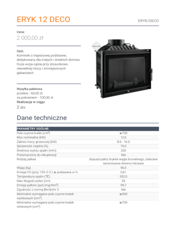 ERYK 12 DECO ERYK/DECO Cena: 2 000,00 zł Opis: Kominek o trapezowej podstawie, dedykowany dla małych i średnich domów. Duża wizja ognia przy stosunkowo niewielkiej mocy i zmniejszonych gabarytach. Wysyłka paletowa przelew - 60,00 zł za pobraniem - 100,00 zł Realizacja w ciągu 2 dni Dane techniczne PARAMETRY OGÓLNE: Pole czynne kratki (cm2) Moc nominalna (kW) Zakres mocy grzewczej (kW) Sprawność cieplna (%) ≥700 12,0 8.0 - 16.0 70,0 Średnica wylotu spalin (mm) Przeznaczony do rekuperacji 200 Nie Rodzaj paliwa Waga (kg) dopuszczalny brykiet węgla brunatnego, zalecane sezonowane drewno liściaste 96,0 Emisja CO (przy 13% O 2 ) ≤ podawana w % Temperatura spalin (℃) Max długość polan (cm) 0,61 352,0 35 Emisja pyłków (pył) (mg/Nm3) Zgodność z normą BlmSchV 2 99,7 Nie Minimalne wymagane pole czynne kratek wylotowych (cm2) Minimalne wymagane pole czynne kratek wlotowych (cm2) ≥900 ≥700 Rodzaj przeszklenia Otwieranie drzwi proste w lewo Materiał wykonania Szerokość (cm) Wysokość (cm) stal, żeliwo 65,20 64,40 Głębokość (cm) Dolot powietrza 38,30 Nie Wyłożenie komory spalania Popielnik Nie Tak Ozdobna szyba typu glass Tak Zalety MAKSYMALNE WYKORZYSTANIE ENERGII Maksymalne wykorzystanie ciepła dzięki gęsto rozmieszczonym radiatorom oraz ściankom paleniska wykonanym z wysokiej jakości żeliwa o grubości 8 mm. Dopalanie cząstek opału dzięki de ektorowi, który wydłuża drogę spalin. Zwiększona wydajność pracy wkładu poprzez manualną regulację ciągu komina przy użyciu wbudowanego szybra. Ręczna kontrola nad procesem spalania realizowana poprzez przesuwkę popielnika. BEZPIECZEŃSTWO NA NAJWYŻSZYM POZIOMIE Front wkładu wyposażony w ceramikę żaroodporną wytrzymująca temperaturę do 800°C. Ozdobny płotek ułatwia utrzymanie czystości użytkowania oraz zabezpiecza przed wypadaniem drewna. WYGODNE UŻYTKOWANIE System zimnej klamki ograniczający ryzyko oparzenia się, dzięki możliwości jej zdjęcia podczas palenia. Szu ada/pojemnik na popiół, w których gromadzą się pozostałości po spalonym drewnie oraz ruchomy ruszt, ułatwiający usunięcie popiołu. Ograniczenie osadzania sadzy dzięki systemowi czystej szyby (kierownica powietrza). Elegancka i wygodna klamka. NOWOCZESNY DESIGN Front wkładu wykonany ze stali przeznaczonej do pracy w podwyższonych temperaturach. Dekoracyjna szyba typu glass wytrzymująca temperaturę do 800oC, która nadaje kominkowi nowoczesny i elegancki wygląd, optycznie powiększa front wkładu. Gwarancja 5 lat. Rysunek techniczny Opcje dodatkowe Dolot zimnego powietrza opcja 183,00 zł Dolot zimnego powietrza to specjalny króciec montowany na życzenie klienta do każdego z naszych wkładów kominkowych, który ma żeliwną podstawę. Ramka stalowa DECO Z/E Nowoczesna stalowa ramka ozdobna do wkładu kominkowego typu DECO Zuzia lub Eryk. Gwarancja 220,00 zł Wszystkie produkty dostępne na www.kratki.com są fabrycznie nowe, wolne od wad zycznych i prawnych oraz zostały legalnie wprowadzone na rynek polski. Producent udziela 5 lat gwarancji od momentu zakupu wkładu na jego sprawne działanie. Ruszt i uszczelnienia kominka objęte są gwarancją na okres 1 roku od momentu zakupu wkładu. Gwarancją nie jest objęta: ceramika żaroodporna. Zastosowanie wkładu kominkowego, sposób podłączenia do komina oraz warunki eksploatacji muszą być zgodne z instrukcją obsługi. Zwrot Klient będący Konsumentem, który zawarł Umowę sprzedaży, może w terminie 14 dni odstąpić od niej bez podawania przyczyny. Bieg terminu na odstąpienie od Umowy sprzedaży rozpoczyna się od chwili objęcia Towaru w posiadanie przez Klienta lub wskazaną przez niego osobę trzecią inną niż przewoźnik. Oświadczenie można złożyć na formularzu, którego wzór został zamieszczony przez Sprzedawcę na Stronie Internetowej Sklepu pod adresem: formularz odstąpienia. Kratki.pl Marek Bal ul. W. Gombrowicza 4 26-660 Wsola/Jedlińsk www.kratki.com tel. 48 340 10 00 Data publikacji: 08.02.2017