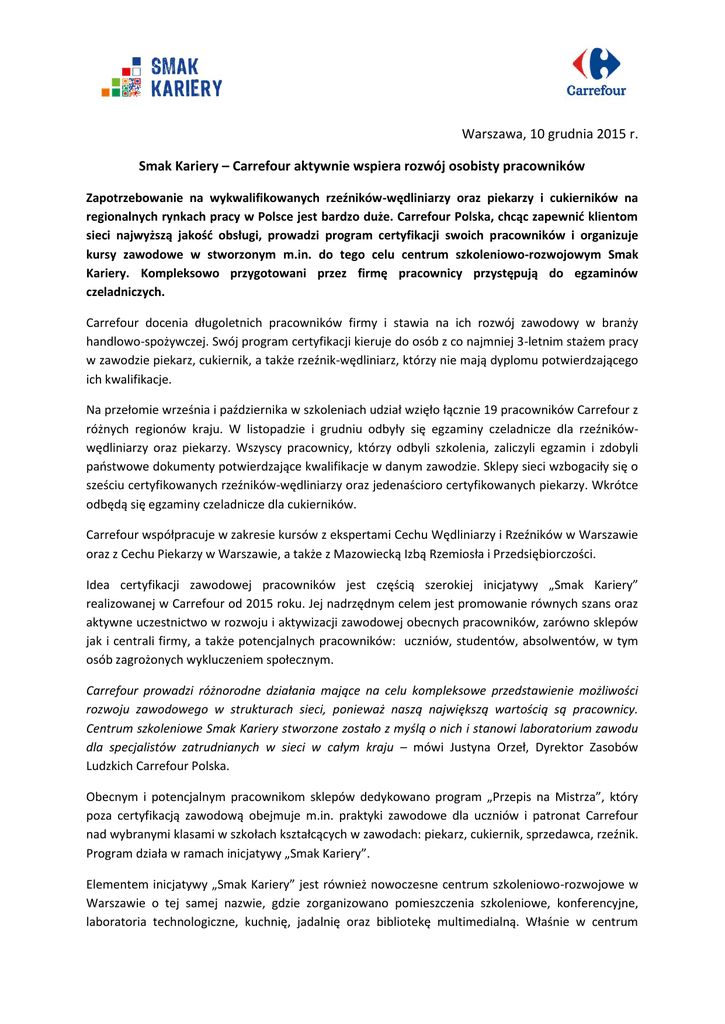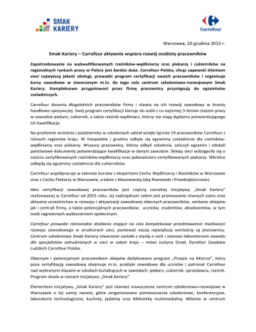 Warszawa, 10 grudnia 2015 r. Smak Kariery – Carrefour aktywnie wspiera rozwój osobisty pracowników Zapotrzebowanie na wykwalifikowanych rzeźników-wędliniarzy oraz piekarzy i cukierników na regionalnych rynkach pracy w Polsce jest bardzo duże. Carrefour Polska, chcąc zapewnić klientom sieci najwyższą jakość obsługi, prowadzi program certyfikacji swoich pracowników i organizuje kursy zawodowe w stworzonym m.in. do tego celu centrum szkoleniowo-rozwojowym Smak Kariery. Kompleksowo przygotowani przez firmę pracownicy przystępują do egzaminów czeladniczych. Carrefour docenia długoletnich pracowników firmy i stawia na ich rozwój zawodowy w branży handlowo-spożywczej. Swój program certyfikacji kieruje do osób z co najmniej 3-letnim stażem pracy w zawodzie piekarz, cukiernik, a także rzeźnik-wędliniarz, którzy nie mają dyplomu potwierdzającego ich kwalifikacje. Na przełomie września i października w szkoleniach udział wzięło łącznie 19 pracowników Carrefour z różnych regionów kraju. W listopadzie i grudniu odbyły się egzaminy czeladnicze dla rzeźnikówwędliniarzy oraz piekarzy. Wszyscy pracownicy, którzy odbyli szkolenia, zaliczyli egzamin i zdobyli państwowe dokumenty potwierdzające kwalifikacje w danym zawodzie. Sklepy sieci wzbogaciły się o sześciu certyfikowanych rzeźników-wędliniarzy oraz jedenaścioro certyfikowanych piekarzy. Wkrótce odbędą się egzaminy czeladnicze dla cukierników. Carrefour współpracuje w zakresie kursów z ekspertami Cechu Wędliniarzy i Rzeźników w Warszawie oraz z Cechu Piekarzy w Warszawie, a także z Mazowiecką Izbą Rzemiosła i Przedsiębiorczości. Idea certyfikacji zawodowej pracowników jest częścią szerokiej inicjatywy „Smak Kariery” realizowanej w Carrefour od 2015 roku. Jej nadrzędnym celem jest promowanie równych szans oraz aktywne uczestnictwo w rozwoju i aktywizacji zawodowej obecnych pracowników, zarówno sklepów jak i centrali firmy, a także potencjalnych pracowników: uczniów, studentów, absolwentów, w tym osób zagrożonych wykluczeniem społecznym. Carrefour prowadzi różnorodne działania mające na celu kompleksowe przedstawienie możliwości rozwoju zawodowego w strukturach sieci, ponieważ naszą największą wartością są pracownicy. Centrum szkoleniowe Smak Kariery stworzone zostało z myślą o nich i stanowi laboratorium zawodu dla specjalistów zatrudnianych w sieci w całym kraju – mówi Justyna Orzeł, Dyrektor Zasobów Ludzkich Carrefour Polska. Obecnym i potencjalnym pracownikom sklepów dedykowano program „Przepis na Mistrza”, który poza certyfikacją zawodową obejmuje m.in. praktyki zawodowe dla uczniów i patronat Carrefour nad wybranymi klasami w szkołach kształcących w zawodach: piekarz, cukiernik, sprzedawca, rzeźnik. Program działa w ramach inicjatywy „Smak Kariery”. Elementem inicjatywy „Smak Kariery” jest również nowoczesne centrum szkoleniowo-rozwojowe w Warszawie o tej samej nazwie, gdzie zorganizowano pomieszczenia szkoleniowe, konferencyjne, laboratoria technologiczne, kuchnię, jadalnię oraz bibliotekę multimedialną. Właśnie w centrum odbywają się szkolenia przygotowujące do zdobycia zawodowego certyfikatu, a także szkolenia menedżerskie i inne. W 2016 roku firma organizować będzie kolejne szkolenia, w tym dla osób, które przystąpią do egzaminów mistrzowskich. O Carrefour Polska Carrefour Polska to multiformatowa sieć handlowa, pod której szyldem działa obecnie ponad 750 sklepów w takich formatach jak: hipermarkety, supermarkety oraz sklepy osiedlowe. Spółka jest również właścicielem i zarządcą sieci centrów handlowych o łącznej powierzchni ponad 230 000 GLA oraz kilkudziesięciu stacji paliw. Kontakt dla mediów: Maria Cieślikowska, Dyrektor Komunikacji Zewnętrznej i PR, Rzecznik Prasowy, e-mail: [email protected] Anna Samul, Account Director MSLGROUP, tel.: 22 437 49 59, e-mail: [email protected]