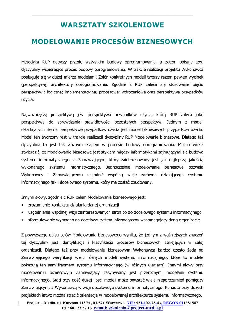 ______________________________________________________________________________________________________________________________________________ WARSZTATY SZKOLENIOWE MODELOWANIE PROCESÓW BIZNESOWYCH Metodyka RUP dotyczy przede wszystkim budowy oprogramowania, a zatem opisuje tzw. dyscypliny wspierające proces budowy oprogramowania. W trakcie realizacji projektu Wykonawca posługuje się w dużej mierze modelami. Zbiór konkretnych modeli tworzy razem pewien wycinek (perspektywę) architektury oprogramowania. Zgodnie z RUP zaleca się stosowanie pięciu perspektyw : logiczna; implementacyjna; procesowa; wdrożeniowa oraz perspektywa przypadków użycia. Najważniejszą perspektywą jest perspektywa przypadków użycia, którą RUP zaleca jako perspektywę do sprawdzania prawidłowości pozostałych perspektyw. Jednym z modeli składających się na perspektywę przypadków użycia jest model biznesowych przypadków użycia. Model ten tworzony jest w trakcie realizacji dyscypliny RUP Modelowanie biznesowe. Dlatego też dyscyplina ta jest tak ważnym etapem w procesie budowy oprogramowania. Można wręcz stwierdzić, że Modelowanie biznesowe jest stykiem między informatykami zajmującymi się budową systemu informatycznego, a Zamawiającym, który zainteresowany jest jak najlepszą jakością wykonanego Wykonawcy systemu i informatycznego. Zamawiającemu uzgodnić Jednocześnie wspólną modelowanie wizję zarówno biznesowe pozwala działającego systemu informacyjnego jak i docelowego systemu, który ma zostać zbudowany. Innymi słowy, zgodnie z RUP celem Modelowania biznesowego jest: • zrozumienie kontekstu działania danej organizacji • uzgodnienie wspólnej wizji zainteresowanych stron co do docelowego systemu informacyjnego • sformułowanie wymagań na docelowy system informatyczny wspomagający daną organizację. Z powyższego opisu celów Modelowania biznesowego wynika, że jednym z ważniejszych znaczeń tej dyscypliny jest identyfikacja i klasyfikacja procesów biznesowych istniejących w całej organizacji. Dlatego też przy modelowaniu biznesowym Wykonawca bardzo często żąda od Zamawiającego weryfikacji wielu różnych modeli systemu informacyjnego, które to modele pokazują ten sam fragment systemu informacyjnego (w różnych ujęciach). Innymi słowy przy modelowaniu biznesowym Zamawiający zasypywany jest przeróżnymi modelami systemu informacyjnego. Stąd przy dość dużej ilości modeli może powstać wiele nieporozumień pomiędzy Zamawiającym, a Wykonawcą w wizji docelowego systemu informatycznego. Ponadto przy dużych projektach łatwo można stracić orientację w modelowanej architekturze systemu informatycznego. Project – Media, ul. Korzona 113/91, 03-571 Warszawa, NIP: 521-102-78-43, REGON 011981587 tel.: 601 33 57 13 e-mail: [email protected] Warsztaty szkoleniowe - Modelowanie Procesów Biznesowych ______________________________________________________________________________________________________________________________________________ Na Warsztatach Szkoleniowych Modelowania Procesów Biznesowych omówione zostaną następujące zagadnienia: RUP – struktura i dynamika Modele i architektura Modelowanie biznesowe rola w procesie wytwarzania oprogramowania opracowanie wymagań na system informatyczny najlepsze praktyki najczęstsze błędy Diagramy UML używane do Modelowania biznesowego Diagram biznesowych i systemowych przypadków użycia Diagram procesów i obiektów biznesowych Diagram klas i stanów obiektów Diagram aktywności, sekwencji Diagram komponentów Modelowanie biznesowe – praktyczne opracowywanie wymagań dla przykładowego projektu systemu informatycznego Modelowanie organizacji i kontekstu biznesowego. Rejestrowanie i identyfikacja interesariuszy systemu oraz określanie ich potrzeb – ról w systemie. Wiązanie wymagań z rolami i aktorami systemu. Modelowanie procesów. Modelowanie procesu głównego, dekompozycja procesu głównego, budowanie modelu procesów w postaci biznesowych przypadków użycia oraz diagramów opisu procesów w UML. Wiązanie wymagań z poszczególnymi procesami biznesowymi. Modelowanie biznesowych obiektów w biznesowych. Identyfikacja modelowania procesów trakcie obiektów biznesowych. Określanie atrybutów i metod obiektów biznesowych. Wiązanie wymagań z poszczególnymi obiektami biznesowymi. Perspektywy i widoki dla kompleksowego modelu kontrahenta. Modelowanie projektowanie systemowych systemowych przypadków przypadków użycia. użycia Identyfikacja na i podstawie diagramów opisu procesów biznesowych. Wiązanie wymagań z przypadkami użycia. 2010 Project - Media Warsztaty szkoleniowe - Modelowanie Procesów Biznesowych ______________________________________________________________________________________________________________________________________________ Nasze Warsztaty Szkoleniowe to gwarancja zdobycia gruntownej wiedzy i umiejętności niezbędnych do tworzenia wymagań, analizy, projektowania i przeglądu projektów informatycznych budowanych dla dowolnej organizacji. WARSZTATY SZKOLENIOWE MODELOWANIE PROCESÓW BIZNESOWYCH AGENDA Dzień pierwszy – laboratorium komputerowe EL07, przy ul. Sienkiewicza 22 Modelowanie biznesowe – zastosowania 9.00 – 10.30 10.30 – 10.45 Modele Architektura Model 4 + 1 Przerwa na kawę Modelowanie biznesowe – metodyka RUP 10.45 – 13.00 Modelowanie biznesowe – dyscyplina RUP 13.00 – 13.45 Cel stosowania metodyki RUP Struktura statyczna Struktura dynamiczna Rola w procesie wytwarzania oprogramowania Opracowanie wymagań na system informatyczny Najlepsze praktyki Najczęstsze błędy Przerwa obiadowa Modelowe biznesowe – zastosowanie UML - Warsztat 13.45 – 17.00 Diagramy Diagramy Diagramy Diagramy Diagramy biznesowych i systemowych przypadków użycia procesów i obiektów biznesowych klas i stanów obiektów aktywności, sekwencji komponentów 2010 Project - Media Warsztaty szkoleniowe - Modelowanie Procesów Biznesowych ___