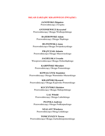 SKŁAD ZARZĄDU KRAJOWEGO ZWIĄZKU: JANOWSKI Zbigniew Przewodniczący Związku ANTONIEWICZ Krzysztof Przewodniczący Okręgu Wielkopolskiego BAJEROWSKI Adam Przewodniczący Okręgu Śląskiego BUJNOWSKA Anna Przewodnicząca Okręgu Świętokrzyskiego FRĄTCZAK Jolanta Przewodnicząca Okręgu Mazowieckiego JAGIELSKA Urszula Wiceprzewodnicząca Okręgu Dolnośląskiego KARPIŃSKI Mirosław Przewodniczący Okręgu Pomorskiego KOWALCZYK Stanisław Przewodniczący Okręgu Warmińsko-Mazurskiego KRASIŃSKI Ryszard Przewodniczący Okręgu Kujawsko-Pomorskiego KUCZYŃSKI Zdzisław Przewodniczący Okręgu Małopolskiego LAL Witold Przewodniczący Okręgu Lubelskiego PŁONKA Andrzej Przewodniczący Okręgu Podkarpackiego SZALAST Wiesława Przewodnicząca Okręg Łódzkiego TOMCZYSZYN Teresa Przewodnicząca Okręgu Zachodniopomorskiego