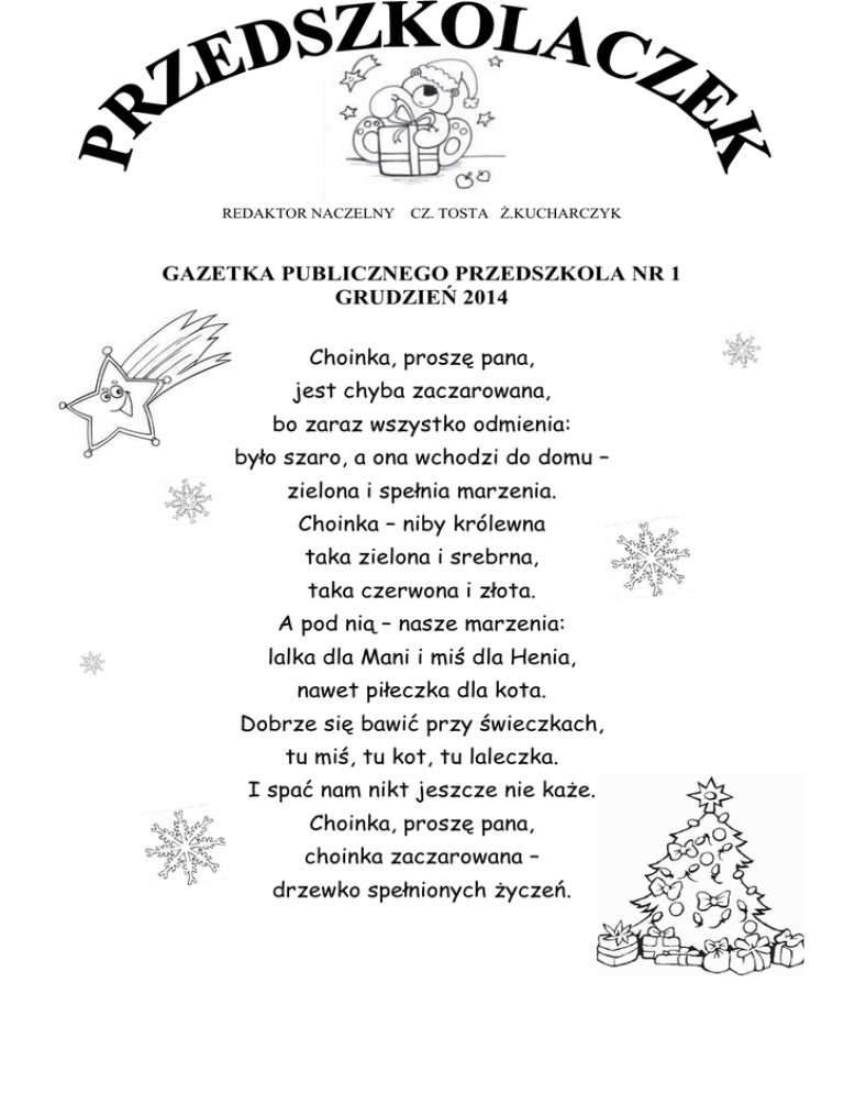 REDAKTOR NACZELNY CZ. TOSTA Ż.KUCHARCZYK GAZETKA PUBLICZNEGO PRZEDSZKOLA NR 1 GRUDZIEŃ 2014 Choinka, proszę pana, jest chyba zaczarowana, bo zaraz wszystko odmienia: było szaro, a ona wchodzi do domu – zielona i spełnia marzenia. Choinka – niby królewna taka zielona i srebrna, taka czerwona i złota. A pod nią – nasze marzenia: lalka dla Mani i miś dla Henia, nawet piłeczka dla kota. Dobrze się bawić przy świeczkach, tu miś, tu kot, tu laleczka. I spać nam nikt jeszcze nie każe. Choinka, proszę pana, choinka zaczarowana – drzewko spełnionych życzeń. To kolejny już numer „Przedszkolaczka”, niech przyczyni się do dobrej zabawy. Gazetka zawiera zadania konkursowe dla dzieci. Prace konkursowe z gazetki prosimy wrzucać do skrzynek w przedsionkach. Najlepsze będą uhonorowane nagrodami. AKTUALNOŚCI Z ŻYCIA PRZEDSZKOLA W okresie przerwy świątecznej tj. od 22.12.2014r. do 31.12.2014r. oraz 02.01. i 05.01.2015r. przedszkole zapewnia opiekę dla dzieci obydwojga rodziców pracujących w tym czasie. Ponownie zapraszamy wszystkie dzieci do przedszkola od 7 stycznia 2015r. Bal przebierańców Balik dla dzieci odbędzie się 07.01.2015r. Grupa popołudniowa w tym dniu przychodzi na 9:15 odbiór od godziny 13:45 do 14:00. UWAGA!!! Szkoła dla rodziców Już 8 stycznia rusza szkoła dla rodziców, cykl obejmuje cztery spotkania raz w tygodniu. W trakcie spotkań z psychologiem rodzice będą mogli zapoznać się z skutecznymi metodami wychowania. Osoby chętne proszone są o zapisanie się na zajęcia w kancelarii przedszkola. Zabawa karnawałowa Serdecznie zapraszamy rodziców (i nie tylko) na zabawę karnawałową, organizowaną przez nasze Przedszkole, która odbędzie się w dniu 10.01.2015r. w Sali OSP Pszów. Koszt imprezy: 120 zł. od pary. Zapisy chętnych przyjmujemy w kancelarii przedszkola do 5 stycznia w godzinach od 6oo do 17oo, telefon 32-455-79-66. Uwaga: konieczna wpłata zaliczki 50,00 zł. (bez zwrotu w razie rezygnacji). Organizatorzy zastrzegają sobie prawo odwołania imprezy za zwrotem zaliczki (ze względu na małą grupę zainteresowanych). Bardzo liczymy na pomoc rodziców przy organizacji zabawy: pieczenie ciast, pomoc w sprzątaniu sali. Liczymy również na fanty rzeczowe lub gotówkę na zakup fantów. Dziękujmy za każdą okazaną pomoc. Serdecznie zapraszamy. ٭Sugerując się pomysłami zgłaszanymi przez rodziców po raz trzeci zorganizowaliśmy kiermasz ubrań dziecięcych. W tym półroczu był w sezonie jesień - zima, kolejny odbędzie się w sezonie wiosna - lato. Serdecznie zachęcamy do udziału. ٭Organizowaliśmy po raz kolejny Mikołaja dla środowiska lokalnego. Aby dzieci nie uczęszczające do przedszkola mogły spotkać się także z tym świętym i otrzymać zasłużony prezent. ٭Nawiązaliśmy współpracę z Urzędem Miasta w Pszowie. Pracownicy urzędu przychodzą do naszego przedszkola aby czytać dzieciom książki, przez co dzieci rozwijają swoją wyobraźnię, koncentrację uwagi, a także uczą się obycia i szacunku do osób publicznych. Pierwszą osobą, która poświęciła swój czas był Marek Hawel. Kolejne spotkania będą odbywały się w każdej grupie raz w miesiącu do końca roku szkolnego. ٭Zorganizowaliśmy konkurs pt.: "Miś Uszatek w Pszowie", do którego zaprosiliśmy wszystkie przedszkola w Pszowie oraz mieszkańców naszego miasta. Główne założenia pracy naszego przedszkola to: MISJA PUBLICZNEGO PRZEDSZKOLA NR 1 W PSZOWIE 1. W przedszkolu pracuje kadra wykwalifikowanych specjalistów 2. Przedszkole zapewnia troskliwą opiekę, poczucie bezpieczeństwa, zapewnia radosne dzieciństwo swoim wychowankom 3. Przedszkole wspomaga rozwój dzieci i rozwija ich zainteresowania dbając o dobre przygotowanie dzieci do podjęcia nauki w szkole 4. Placówka oferuje dużo atrakcji dla dzieci i rodziców 5. W przedszkolu obecna jest ciągła troska o miłą rodzinną atmosferę 6. Wszystkich pracowników cechuje indywidualne podejście do dzieci 7. Przedszkole wspomaga rodziców w wychowaniu dziecka 8. Rodzice wychowanków są dla nauczycieli partnerami WIZJA PUBLICZNEGO PRZEDSZKOLA NR 1 W PSZOWIE Jesteśmy po to, aby w atmosferze bezpieczeństwa, radości i szczęśliwego dzieciństwa tworzyć warunki wychowawcze i edukacyjne zapewniające wspomaganie oraz wszechstronny rozwój dzieci zgodnie z ich wrodzonym potencjałem, możliwościami rozwojowymi i zainteresowaniami. Skutecznie przygotowujemy dzieci do podjęcia nauki na dalszych etapach edukacji. Rozwiązanie konkursu dokończ zdanie: Lubię przedszkole za to, że: ... tu bawię, uczę się i zawsze dobrze czuję się!!! Igor Kida ... bardzo dobrze w nim czuję się, nasza pani uczy mnie, z koleżankami bawię się i podwieczorek pyszny jem. Sandra Swacha ... są fajne Panie, a najfajniejsza jest p. Żaneta. Emilia Legutko ... Pani Żaneta wymyśla nam dużo ciekawych zabaw i zadań. Fabian Pytlik ... mam tam dużo koleżanek, jest w nim dużo zabawek, są w nim niespodzianki, każdego dnia, jest w nim ogródek, nauczycielki są sympatyczne i uśmiechnięte, jest w nim j. angielski, bawimy się codziennie na świeżym powietrzu, mamy zdrowe jedzenie, wychodzimy na spacery i lodowisko, mamy teatrzyki, mamy wycieczki do różnych urzędów i instytucji, mamy kurs pierwszej pomocy, jest balik i Mikołaj, możemy występować podczas festynu. Olimpia Ratajska Bardzo dziękujemy za wszystkie zdania które otrzymaliśmy :) Zapraszamy do uzupełnienia kolejnego zdania: Kiedy jestem z mamą i tatą... Warto czytać dziecku – o zaletach czytania Czy są jeszcze rodzice, których trzeba przekonywać jak znamienny wpływ na rozwój dziecka ma literatura? Wiele mówi się o pozytywnym wpływie wspólnego czytania. Liczne kampanie społeczne nawołujące do takiego spędzania czasu sprawiły, że słowa „warto czytać dziecku” stały się truizmem. Kiedy coś jest oczywiste, staje się mniej zauważalne, dlatego należy wciąż przypominać i jak mant