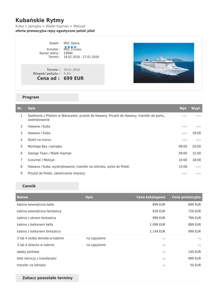 Kubańskie Rytmy Kuba > Jamajka > Wielki Kajman > Meksyk oferta promocyjna rejsy egzotyczne polski pilot Statek : Armator : Numer oferty : Termin : Termin : Długość pobytu : MSC Opera MSC Cruises 33990 19.01.2016 - 27.01.2016 19.01.2016 9 dni Cena od : 699 EUR Program Nr. Opis Wpł. Wypł. 1 Spotkanie z Pilotem w Warszawie, przelot do Hawany. Przylot do Hawany, transfer do portu, zaokrętowanie --:-- --:-- 2 Hawana / Kuba --:-- --:-- 3 Hawana / Kuba --:-- 18:00 4 Dzień na morzu --:-- --:-- 5 Montego Bay / Jamajka 09:00 20:00 6 George Town / Wielki Kajman 09:00 15:00 7 Cozumel / Meksyk 10:00 18:00 8 Hawana / Kuba, wyokrętowanie, transfer na lotnisko, wylot do Polski 15:00 --:-- 9 Przylot do Polski, zakończenie imprezy --:-- --:-- Cennik Nazwa Opis Cena katalogowa Cena promocyjna kabina wewnętrzna bella 899 EUR 699 EUR kabina wewnętrzna fantastica 929 EUR 729 EUR kabina z oknem fantastica 999 EUR 799 EUR kabina z balkonem bella 1.099 EUR 899 EUR kabina z balkonem fantastica 1.149 EUR 999 EUR 3 lub 4 osoba dorosła w kabinie na zapytanie --; --; 3 lub 4 dziecko w kabinie na zapytanie --; --; opłaty portowe --; 140 EUR bilet lotniczy z transferami --; 999 EUR transfer na lotnisko --; 50 EUR Zobacz pozostałe terminy 19.01.2016 09.02.2016 Informacje dodatkowe cena obejmuje: rejs statkiem MSC Opera ****; zakwaterowanie w kabinie wybranej kategorii (7 noclegów); ubezpieczenie: KL 30 000€, KR 6 000€, NWI 16 000€, BP 1800 PLN + choroby przewlekłe, serwis bagażowy i kabinowy; wyżywienie – 3 główne posiłki, przekąski między posiłkami, bufet lub przekąski o północy; korzystanie z basenu i innych urządzeń sportowo-rekreacyjnych; udział we wszystkich imprezach organizowanych na statku, opiekę polskiego pilota. cena nie obejmuje: opłat portowych i podatków (140 €/os.); przelotu na trasie Warszawa – Hawana – Warszawa wraz z transferami lotnisko-port-lotnisko (ok. 999 €/os.); ewentualnych noclegów w hotelu przed/po rejsie i transferów (na zapytanie); wycieczek fakultatywnych; korzystania z punktów usługowych (pralnia, fotograf, salon piękności i odnowy biologicznej, Internet); napojów do obiadów i kolacji, drinków oraz napiwków obowiązkowych dla obsługi statku (ok. 8,5 €/dzień/osobę od 14 roku życia; 4,25 €/dzień/osobę 4-14 lat). uwagi: kabiny 3/4 osobowe nie są dostępne we wszystkich kategoriach, a ich liczba jest ograniczona – sprzedaż tylko po potwierdzeniu. Grupa realizowana przy min. 14 osobach, wymagana karta turysty. Na pokładzie statku obowiązuje bezgotówkowy system opłat. Należność reguluje się ostatniego dnia rejsu gotówką (wpłata depozytu ok. 250€/kabina pierwszego dnia rejsu) lub kartą kredytową (VISA, Mastercard, American Express) na podstawie zbiorczego rachunku. Karty kredytowe należy zarejestrować zaraz po zaokrętowaniu. MSC Cruises oferuje następujące rodzaje kabin: kabiny wewnętrzne – Bella, Fantastica kabiny z oknem – Bella, Fantastica kabiny z balkonem – Bella, Fantastica Podstawowe różnice: Kategoria Bella - kabiny usytuowane na niższych pokładach. Kabiny z oknem i z balkonem mogą mieć ograniczoną widoczność. Możliwość zamówienia do kabiny śniadania za dopłatą. Kategoria Fantastica - kabiny usytuowane na wyższych pokładach. Śniadanie serwowane do kabiny w cenie rejsu, 50% zniżki na zajęcia fitness, joga lub treningi na siłowni z indywidualnym trenerem, możliwość wyboru tury kolacji. ALL INCLUSIVE (opcja): istnieje możliwość wykupienia pakietu ALL INCLUSIVE obejmującego wybrane napoje alkoholowe i bezalkoholowe dostępne bez ograniczeń we wszystkich barach. Cena pakietu 26€/dzień/osoba dorosła i 12€/dzień/dziecko. Warunkiem skorzystania z pakietu all inclusive jest wykupienie pakietu przez wszystkich pasażerów podróżujących w jednej kabinie na czas całego rejsu. TRANSFERY: Transfer na lotnisko w Warszawie (opcjonalnie) - cena 50€/os. w dwie strony * * miejsca wsiadania: Kraków, Katowice, Żory, Rybnik, Częstochowa. Możliwy transfer z Wrocławia przy minimum 6 osobach.