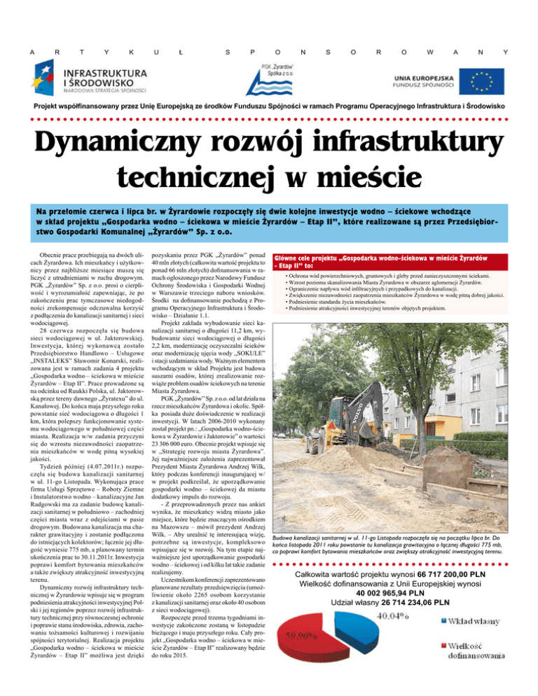 a r t y k u ł s p o n s o r o w a n y Projekt współfinansowany przez Unię Europejską ze środków Funduszu Spójności w ramach Programu Operacyjnego Infrastruktura i Środowisko Na przełomie czerwca i lipca br. w Żyrardowie rozpoczęły się dwie kolejne inwestycje wodno – ściekowe wchodzące w skład projektu „Gospodarka wodno – ściekowa w mieście Żyrardów – Etap II”, które realizowane są przez Przedsiębiorstwo Gospodarki Komunalnej „Żyrardów” Sp. z o.o. Obecnie prace przebiegają na dwóch ulicach Żyrardowa. Ich mieszkańcy i użytkownicy przez najbliższe miesiące muszą się liczyć z utrudnieniami w ruchu drogowym. PGK „Żyrardów” Sp. z o.o. prosi o cierpliwość i wyrozumiałość zapewniając, że po zakończeniu prac tymczasowe niedogodności zrekompensuje odczuwalna korzyść z podłączenia do kanalizacji sanitarnej i sieci wodociągowej. 28 czerwca rozpoczęła się budowa sieci wodociągowej w ul. Jaktorowskiej. Inwestycja, której wykonawcą zostało Przedsiębiorstwo Handlowo – Usługowe „INSTALEKS” Sławomir Konarski, realizowana jest w ramach zadania 4 projektu „Gospodarka wodno – ściekowa w mieście Żyrardów – Etap II”. Prace prowadzone są na odcinku od Ruukki Polska, ul. Jaktorowską przez tereny dawnego „Żyratexu” do ul. Kanałowej. Do końca maja przyszłego roku powstanie sieć wodociągowa o długości 1 km, która polepszy funkcjonowanie systemu wodociągowego w południowej części miasta. Realizacja w/w zadania przyczyni się do wzrostu niezawodności zaopatrzenia mieszkańców w wodę pitną wysokiej jakości. Tydzień później (4.07.2011r.) rozpoczęła się budowa kanalizacji sanitarnej w ul. 11-go Listopada. Wykonująca prace firma Usługi Sprzętowe – Roboty Ziemne i Instalatorstwo wodno – kanalizacyjne Jan Radgowski ma za zadanie budowę kanalizacji sanitarnej w południowo – zachodniej części miasta wraz z odejściami w pasie drogowym. Budowana kanalizacja ma charakter grawitacyjny i zostanie podłączona do istniejących kolektorów; łącznie jej długość wyniesie 775 mb, a planowany termin ukończenia prac to 30.11.2011r. Inwestycja poprawi komfort bytowania mieszkańców a także zwiększy atrakcyjność inwestycyjną terenu. Dynamiczny rozwój infrastruktury technicznej w Żyrardowie wpisuje się w program podniesienia atrakcyjności inwestycyjnej Polski i jej regionów poprzez rozwój infrastruktury technicznej przy równoczesnej ochronie i poprawie stanu środowiska, zdrowia, zachowaniu tożsamości kulturowej i rozwijaniu spójności terytorialnej. Realizacja projektu „Gospodarka wodno – ściekowa w mieście Żyrardów – Etap II” możliwa jest dzięki pozyskaniu przez PGK „Żyrardów” ponad 40 mln złotych (całkowita wartość projektu to ponad 66 mln złotych) dofinansowania w ramach ogłoszonego przez Narodowy Fundusz Ochrony Środowiska i Gospodarki Wodnej w Warszawie trzeciego naboru wniosków. Środki na dofinansowanie pochodzą z Programu Operacyjnego Infrastruktura i Środowisko – Działanie 1.1. Projekt zakłada wybudowanie sieci kanalizacji sanitarnej o długości 11,2 km, wybudowanie sieci wodociągowej o długości 2,2 km, modernizację oczyszczalni ścieków oraz modernizację ujęcia wody „SOKULE” i stacji uzdatniania wody. Ważnym elementem wchodzącym w skład Projektu jest budowa suszarni osadów, której zrealizowanie rozwiąże problem osadów ściekowych na terenie Miasta Żyrardowa. PGK „Żyrardów” Sp. z o.o. od lat działa na rzecz mieszkańców Żyrardowa i okolic. Spółka posiada duże doświadczenie w realizacji inwestycji. W latach 2006-2010 wykonany został projekt pn.: „Gospodarka wodno-ściekowa w Żyrardowie i Jaktorowie” o wartości 23 306 000 euro. Obecnie projekt wpisuje się w „Strategię rozwoju miasta Żyrardowa”. Jej najważniejsze założenia zaprezentował Prezydent Miasta Żyrardowa Andrzej Wilk, który podczas konferencji inaugurującej w/ w projekt podkreślał, że uporządkowanie gospodarki wodno – ściekowej da miastu dodatkowy impuls do rozwoju. - Z przeprowadzonych przez nas ankiet wynika, że mieszkańcy widzą miasto jako miejsce, które będzie znaczącym ośrodkiem na Mazowszu – mówił prezydent Andrzej Wilk. – Aby urealnić tę interesującą wizję, potrzebne są inwestycje, kompleksowo wpisujące się w rozwój. Na tym etapie najważniejsze jest uporządkowanie gospodarki wodno – ściekowej i od kilku lat takie zadanie realizujemy. Uczestnikom konferencji zaprezentowano planowane rezultaty przedsięwzięcia (umożliwienie około 2265 osobom korzystanie z kanalizacji sanitarnej oraz około 40 osobom z sieci wodociągowej). Rozpoczęte przed trzema tygodniami inwestycje zakończone zostaną w listopadzie bieżącego i maju przyszłego roku. Cały projekt „Gospodarka wodno – ściekowa w mieście Żyrardów – Etap II” realizowany będzie do roku 2015. Główne cele projektu „Gospodarka wodno-ściekowa w mieście Żyrardów - Etap II” to: • Ochrona wód powierzchniowych, gruntowych i gleby przed zanieczyszczonymi ściekami. • Wzrost poziomu skanalizowania Miasta Żyrardowa w obszarze aglomeracji Żyrardów. • Ograniczenie napływu wód infiltracyjnych i przypadkowych do kanalizacji. • Zwiększenie niezawodności zaopatrzenia mieszkańców Żyrardowa w wodę pitną dobrej jakości. • Podniesienie standardu życia mieszkańców. • Podniesienie atrakcyjności inwestycyjnej terenów objętych projektem. Budowa kanalizacji sanitarnej w ul. 11-go Listopada rozpoczęła się na początku lipca br. Do końca listopada 2011 roku powstanie tu kanalizacja grawitacyjna o łącznej długości 775 mb, co poprawi komfort bytowania mieszkańców oraz zwiększy atrakcyjność inwestycyjną terenu. Całkowita wartość projektu wynosi 66 717 200,00 PLN Wielkość dofinansowania z Unii Europejskiej wynosi 40 002 965,94 PLN Udział własny 26 714 234,06 PLN