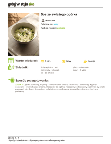 Sos ze swieżego ogórka dorota20w Polecane na: sosy Kuchnia (region): arabska Warto wiedzieć: Składniki: 0 min. duży ogórek - 1 szt. listki mięty - kilka szt. sól - do smaku łatwy 1 porcja pieprz - do smaku jogurt - 5 łyżka Sposób przygotowania: KROK 1: Ogórka obieramy, myjemy i kroimy w dość drobną kosteczkę. Liście mięty myjemy osuszamy i kroimy bardzo drobno. Dodajemy do ogórka, mieszamy i odstawiamy na 20 min by smaki przegryzły się. Jogurt doprawiamy solą i pieprzem,zalewamy nim ogórka, mieszamy i od razu podajemy. strona 1 / 1 http://gotujwstylueko.pl/przepisy/sos-ze-swiezego-ogorkaPowered by TCPDF (www.tcpdf.org)