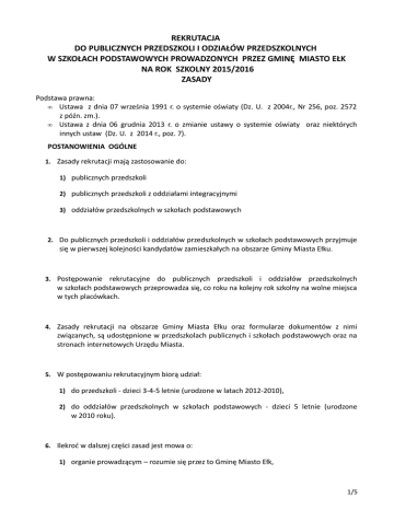 REKRUTACJA DO PUBLICZNYCH PRZEDSZKOLI I ODZIAŁÓW PRZEDSZKOLNYCH W SZKOŁACH PODSTAWOWYCH PROWADZONYCH PRZEZ GMINĘ MIASTO EŁK NA ROK SZKOLNY 2015/2016 ZASADY Podstawa prawna: • Ustawa z dnia 07 września 1991 r. o systemie oświaty (Dz. U. z 2004r., Nr 256, poz. 2572 z późn. zm.). • Ustawa z dnia 06 grudnia 2013 r. o zmianie ustawy o systemie oświaty oraz niektórych innych ustaw (Dz. U. z 2014 r., poz. 7). POSTANOWIENIA OGÓLNE 1. Zasady rekrutacji mają zastosowanie do: 1) publicznych przedszkoli 2) publicznych przedszkoli z oddziałami integracyjnymi 3) oddziałów przedszkolnych w szkołach podstawowych 2. Do publicznych przedszkoli i oddziałów przedszkolnych w szkołach podstawowych przyjmuje się w pierwszej kolejności kandydatów zamieszkałych na obszarze Gminy Miasta Ełku. 3. Postępowanie rekrutacyjne do publicznych przedszkoli i oddziałów przedszkolnych w szkołach podstawowych przeprowadza się, co roku na kolejny rok szkolny na wolne miejsca w tych placówkach. 4. Zasady rekrutacji na obszarze Gminy Miasta Ełku oraz formularze dokumentów z nimi związanych, są udostępnione w przedszkolach publicznych i szkołach podstawowych oraz na stronach internetowych Urzędu Miasta. 5. W postępowaniu rekrutacyjnym biorą udział: 1) do przedszkoli - dzieci 3-4-5 letnie (urodzone w latach 2012-2010), 2) do oddziałów przedszkolnych w szkołach podstawowych - dzieci 5 letnie (urodzone w 2010 roku). 6. Ilekroć w dalszej części zasad jest mowa o: 1) organie prowadzącym – rozumie się przez to Gminę Miasto Ełk, 1/5 2) przedszkolu – rozumie się przez to przedszkole publiczne prowadzone przez Gminę Miasto Ełk, 3) oddziale przedszkolnym – rozumie się przez to oddział przedszkolny zorganizowany w szkole podstawowej, 4) dyrektorze – rozumie się przez to dyrektora danego publicznego przedszkola lub danej szkoły podstawowej, 5) rodzicu – rozumie się przez to rodziców lub opiekunów prawnych, 6) podstawie programowej – rozumie się przez to bezpłatną , pięciogodzinną podstawę programową realizowaną w przedszkolach w Ełku od godz. 8:00 do godz. 13:00. 7. W ramach postępowania rekrutacyjnego Prezydent Miasta określa: 1) kryteria, w drugim etapie postępowania rekrutacyjnego; 2) liczbę punktów każdemu z kryteriów, 3) dokumenty niezbędnych do potwierdzenia kryteriów. 8. W ramach postępowania rekrutacyjnego Dyrektor: a) w porozumieniu z organem prowadzącym ustala terminy postępowania rekrutacyjnego, terminy składania dokumentów i terminy postępowania uzupełniającego. b) powołuje komisję rekrutacyjną i wyznacza jej przewodniczącego, c) rozpatruje odwołania od rozstrzygnięć komisji rekrutacyjnej., d) informuje Prezydenta Miasta Ełku o nieprzyjęciu do przedszkola/oddziału przedszkolnego dziecka zamieszkałego na obszarze Gminy Miasta Ełku. 9. Jeżeli po zakończeniu postępowania rekrutacyjnego przedszkole/szkoła nadal dysponuje wolnymi miejscami, dyrektor przeprowadza postępowanie uzupełniające, które powinno zakończyć się do końca sierpnia. KONTYNUACJA EDUKACJI PRZEDSZKOLNEJ DZIECI W KOLEJNYCH LATACH SZKOLNYCH 1. Rodzice dzieci obecnie uczęszczających do przedszkoli składają deklaracje o kontynuacji wychowania przedszkolnego na rok szkolny 2015/2016 w przedszkolach, do których uczęszczają ich dzieci w terminie wskazanym w harmonogramie. 2. Dzieci, których rodzice złożyli deklaracje w terminie określonym w harmonogramie, mają zagwarantowane miejsca w przedszkolach, do których uczęszczają. PROCEDURA REKRUTACJI DO PRZEDSZKOLA / ODDZIAŁU PRZEDSZKOLNEGO 1. Postępowanie rekrutacyjne jest prowadzone na wniosek rodzica kandydata, złożony do dyrektora wybranego przedszkola / szkoły podstawowej. 2. Wniosek o przyjęcie do przedszkola/oddziału więcej, niż trzech wybranych placówek. przedszkolnego, może być złożony do nie 3. We wszystkich wnioskach składanych do wybranych przedszkoli/szkół należy podawać taką samą kolejność placówek, tzn. w porządku od najbardziej do najmniej preferowanego 2 przedszkola/szkoły. 4. W przypadku większej liczby kandydatów zamieszkałych na obszarze Gminy Miasta Ełku, niż liczba wolnych miejsc, zostanie przeprowadzone postępowanie rekrutacyjne. 5. Postępowanie rekrutacyjne może być prowadzone etapami i zakończone przyjęciem kandydatów: 1) I etap postępowania – wg kryteriów określonych w ustawie o systemie oświaty, 2) II etap postępowania – wg kryteriów określonych przez dyrektora w porozumieniu z organem prowadzącym, 3) III etap - postępowanie uzupełniające rekrutację do przedszkoli/oddziałów przedszkolnych. 6. W przypadku równorzędnych wyników uzyskanych na pierwszym etapie postępowania rekrutacyjnego lub jeżeli po zakończeniu tego etapu dane przedszkole/szkoła podstawowa nadal dysponuje wolnymi miejscami, przeprowadza się kolejne etapy postępowania rekrutacyjnego. 7. Postępowanie uzupełniające powinno zakończyć się do końca sierpnia roku szkolnego poprzedzającego rok szkolny, na który jest przeprowadzone postępowanie rekrutacyjne. Do postępowania uzupełniającego przepisy o rekrutacji stosuje się odpowiednio. 8. Jeżeli po zakończeniu postępowania rekrutacyjnego, tj. w dniu 01 września 2015 roku przedszkole/szkoła podstawowa nadal dysponuje wolnymi miejscami, na miejsca te mogą być przyjęci kandydaci zamieszkali poza obszarem Gminy Miasta Ełku. W przypadku większej liczby kandydatów zamieszkałych poza obszarem danej gminy przeprowadza się postępowanie rekrutacyjne. 9. W przypadku większej liczby kandydatów zamieszkałych poza obszarem danej gminy przeprowadza się postępowanie rekrutacyjne. 10. W celu zapewnienia dziecku odpowiedniej opieki, odżywiania oraz metod opiekuńczo- wychowawczych, rodzic dziecka może przekazać dyrektorowi uznane przez niego za istotne dane o stanie zdrowia, diecie i rozwoju dziecka. KRYTERIA NABORU 1. W pierwszej kolejności będą przyjmowane dzieci, które p