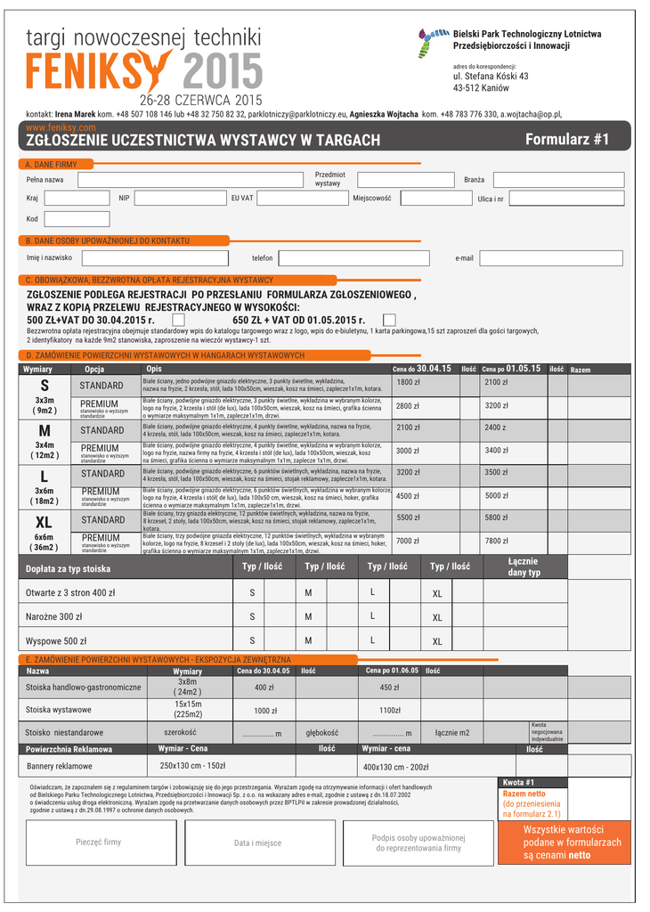 Bielski Park Technologiczny Lotnictwa Przedsiêbiorczoœci i Innowacji adres do korespondencji: ul. Stefana Kóski 43 43-512 Kaniów kontakt: Irena Marek kom. +48 507 108 146 lub +48 32 750 82 32, [email protected], Agnieszka Wojtacha kom. +48 783 776 330, [email protected], www.feniksy.com Formularz #1 ZG£OSZENIE UCZESTNICTWA WYSTAWCY W TARGACH A. DANE FIRMY Przedmiot wystawy Pe³na nazwa Kraj NIP EU VAT Bran¿a Miejscowoœæ Ulica i nr Kod B. DANE OSOBY UPOWA¯NIONEJ DO KONTAKTU Imiê i nazwisko telefon e-mail C. OBOWI¥ZKOWA, BEZZWROTNA OP£ATA REJESTRACYJNA WYSTAWCY ZG£OSZENIE PODLEGA REJESTRACJI PO PRZES£ANIU FORMULARZA ZG£OSZENIOWEGO , WRAZ Z KOPI¥ PRZELEWU REJESTRACYJNEGO W WYSOKOŒCI: 500 Z£+VAT DO 30.04.2015 r. 650 Z£ + VAT OD 01.05.2015 r. Bezzwrotna op³ata rejestracyjna obejmuje standardowy wpis do katalogu targowego wraz z logo, wpis do e-biuletynu, 1 karta parkingowa,15 szt zaproszeñ dla goœci targowych, 2 identyfikatory na ka¿de 9m2 stanowiska, zaproszenie na wieczór wystawcy-1 szt. D. ZAMÓWIENIE POWIERZCHNI WYSTAWOWYCH W HANGARACH WYSTAWOWYCH Wymiary Opcja Cena do 30.04.15 Opis Iloœæ Cena po 01.05.15 Bia³e œciany, jedno podwójne gniazdo elektryczne, 3 punkty œwietlne, wyk³adzina, nazwa na fryzie, 2 krzes³a, stó³, lada 100x50cm, wieszak, kosz na œmieci, zaplecze1x1m, kotara. 1800 z³ 2100 z³ S STANDARD 3x3m ( 9m2 ) PREMIUM stanowisko o wy¿szym standardzie Bia³e œciany, podwójne gniazdo elektryczne, 3 punkty œwietlne, wyk³adzina w wybranym kolorze, logo na fryzie, 2 krzes³a i stó³ (de lux), lada 100x50cm, wieszak, kosz na œmieci, grafika œcienna o wymiarze maksymalnym 1x1m, zaplecze1x1m, drzwi. 2800 z³ 3200 z³ M STANDARD Bia³e œciany, podwójne gniazdo elektryczne, 4 punkty œwietlne, wyk³adzina, nazwa na fryzie, 4 krzes³a, stó³, lada 100x50cm, wieszak, kosz na œmieci, zaplecze1x1m, kotara. 2100 z³ 2400 z 3x4m ( 12m2 ) PREMIUM Bia³e œciany, podwójne gniazdo elektryczne, 4 punkty œwietlne, wyk³adzina w wybranym kolorze, logo na fryzie, nazwa firmy na fryzie, 4 krzes³a i stó³ (de lux), lada 100x50cm, wieszak, kosz na œmieci, grafika œcienna o wymiarze maksymalnym 1x1m, zaplecze 1x1m, drzwi. 3000 z³ 3400 z³ L STANDARD Bia³e œciany, podwójne gniazdo elektryczne, 6 punktów œwietlnych, wyk³adzina, nazwa na fryzie, 4 krzes³a, stó³, lada 100x50cm, wieszak, kosz na œmieci, stojak reklamowy, zaplecze1x1m, kotara. 3200 z³ 3500 z³ 3x6m ( 18m2 ) PREMIUM Bia³e œciany, podwójne gniazdo elektryczne, 6 punktów œwietlnych, wyk³adzina w wybranym kolorze, logo na fryzie, 4 krzes³a i stó³( de lux), lada 100x50 cm, wieszak, kosz na œmieci, hoker, grafika œcienna o wymiarze maksymalnym 1x1m, zaplecze1x1m, drzwi. Bia³e œciany, trzy gniazda elektryczne, 12 punktów œwietlnych, wyk³adzina, nazwa na fryzie, 8 krzese³, 2 sto³y, lada 100x50cm, wieszak, kosz na œmieci, stojak reklamowy, zaplecze1x1m, kotara. Bia³e œciany, trzy podwójne gniazda elektryczne, 12 punktów œwietlnych, wyk³adzina w wybranym kolorze, logo na fryzie, 8 krzese³ i 2 sto³y (de lux), lada 100x50cm, wieszak, kosz na œmieci, hoker, grafika œcienna o wymiarze maksymalnym 1x1m, zaplecze1x1m, drzwi. 4500 z³ 5000 z³ 5500 z³ 5800 z³ 7000 z³ 7800 z³ stanowisko o wy¿szym standardzie stanowisko o wy¿szym standardzie XL STANDARD 6x6m ( 36m2 ) PREMIUM stanowisko o wy¿szym standardzie Typ / Iloœæ Dop³ata za typ stoiska Typ / Iloœæ Typ / Iloœæ Typ / Iloœæ Otwarte z 3 stron 400 z³ S M L XL Naro¿ne 300 z³ S M L XL Wyspowe 500 z³ S M L XL E. ZAMÓWIENIE POWIERZCHNI WYSTAWOWYCH - EKSPOZYCJA ZEWNÊTRZNA Cena do 30.04.05 Nazwa Wymiary 3x8m 400 z³ Stoiska handlowo-gastronomiczne ( 24m2 ) 15x15m Stoiska wystawowe 1000 z³ (225m2) Stoisko niestandarowe szerokoœæ Powierzchnia Reklamowa Wymiar - Cena Bannery reklamowe 250x130 cm - 150z³ ............... m £¹cznie dany typ Cena po 01.06.05 Iloœæ Iloœæ 450 z³ 1100z³ g³êbokoœæ Iloœæ ............... m ³¹cznie m2 Wymiar - cena Kwota negocjowana indywidualnie Iloœæ 400x130 cm - 200z³ Oœwiadczam, ¿e zapozna³em siê z regulaminem targów i zobowi¹zujê siê do jego przestrzegania. Wyra¿am zgodê na otrzymywanie informacji i ofert handlowych od Bielskiego Parku Technologicznego Lotnictwa, Przedsiêbiorczoœci i Innowacji Sp. z o.o. na wskazany adres e-mail, zgodnie z ustaw¹ z dn.18.07.2002 o œwiadczeniu us³ug droga elektroniczn¹. Wyra¿am zgodê na przetwarzanie danych osobowych przez BPTLPiI w zakresie prowadzonej dzia³alnoœci, zgodnie z ustaw¹ z dn.29.08.1997 o ochronie danych osobowych. Pieczêæ firmy iloœæ Razem Data i miejsce Podpis osoby upowa¿nionej do reprezentowania firmy Kwota #1 Razem netto (do przeniesienia na formularz 2.1) Wszystkie wartoœci podane w formularzach s¹ cenami netto