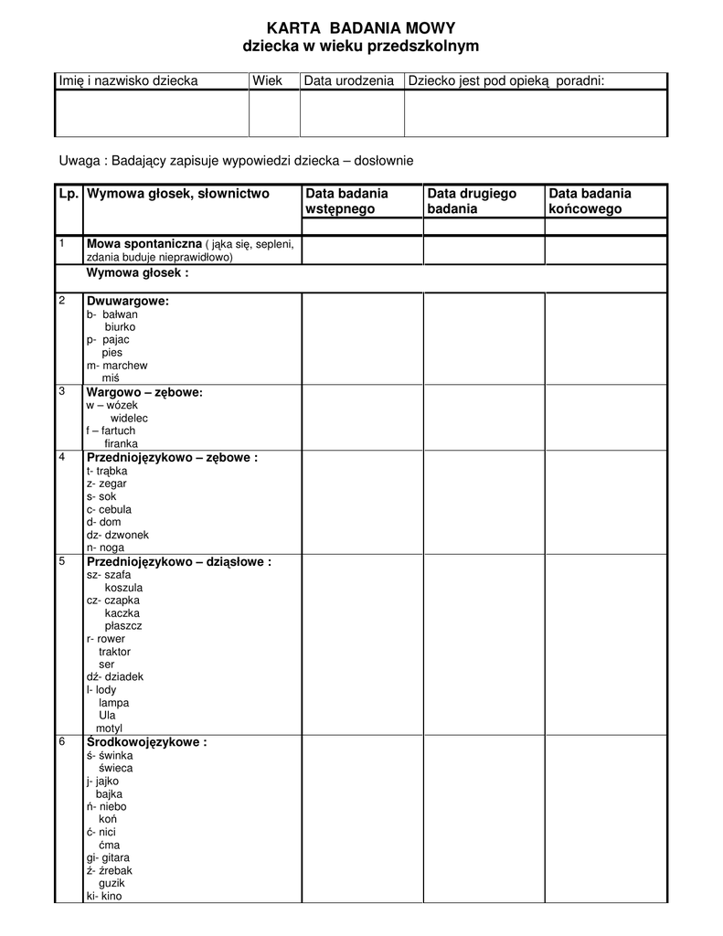KARTA BADANIA MOWY dziecka w wieku przedszkolnym