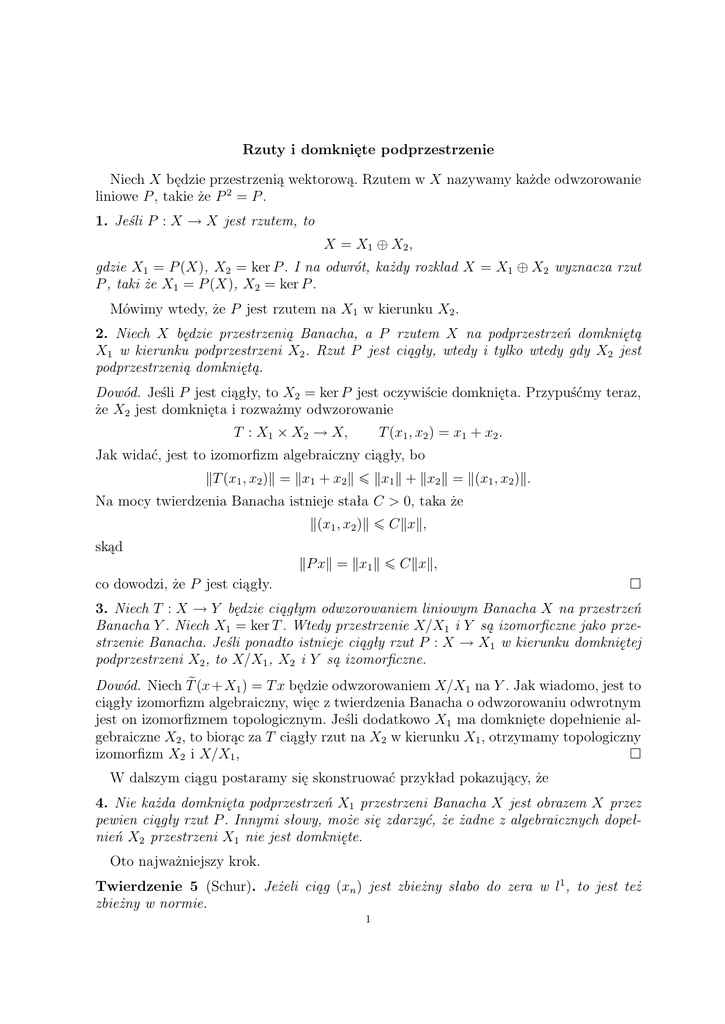 Rzuty i domknięte podprzestrzenie Niech X będzie