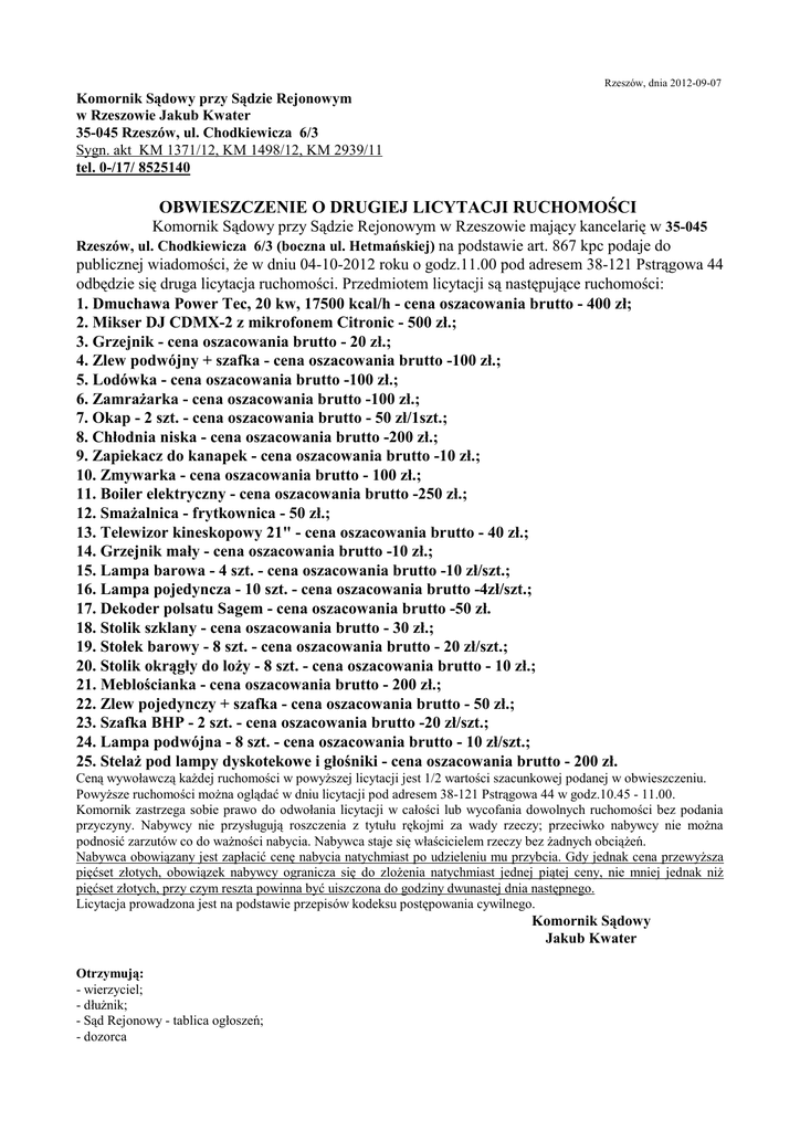 Rzeszów, dnia 2012-09-07 Komornik Sądowy przy Sądzie Rejonowym w Rzeszowie Jakub Kwater 35-045 Rzeszów, ul. Chodkiewicza 6/3 Sygn. akt KM 1371/12, KM 1498/12, KM 2939/11 tel. 0-/17/ 8525140 OBWIESZCZENIE O DRUGIEJ LICYTACJI RUCHOMOŚCI Komornik Sądowy przy Sądzie Rejonowym w Rzeszowie mający kancelarię w 35-045 Rzeszów, ul. Chodkiewicza 6/3 (boczna ul. Hetmańskiej) na podstawie art. 867 kpc podaje do publicznej wiadomości, że w dniu 04-10-2012 roku o godz.11.00 pod adresem 38-121 Pstrągowa 44 odbędzie się druga licytacja ruchomości. Przedmiotem licytacji są następujące ruchomości: 1. Dmuchawa Power Tec, 20 kw, 17500 kcal/h - cena oszacowania brutto - 400 zł; 2. Mikser DJ CDMX-2 z mikrofonem Citronic - 500 zł.; 3. Grzejnik - cena oszacowania brutto - 20 zł.; 4. Zlew podwójny + szafka - cena oszacowania brutto -100 zł.; 5. Lodówka - cena oszacowania brutto -100 zł.; 6. Zamrażarka - cena oszacowania brutto -100 zł.; 7. Okap - 2 szt. - cena oszacowania brutto - 50 zł/1szt.; 8. Chłodnia niska - cena oszacowania brutto -200 zł.; 9. Zapiekacz do kanapek - cena oszacowania brutto -10 zł.; 10. Zmywarka - cena oszacowania brutto - 100 zł.; 11. Boiler elektryczny - cena oszacowania brutto -250 zł.; 12. Smażalnica - frytkownica - 50 zł.; 13. Telewizor kineskopowy 21" - cena oszacowania brutto - 40 zł.; 14. Grzejnik mały - cena oszacowania brutto -10 zł.; 15. Lampa barowa - 4 szt. - cena oszacowania brutto -10 zł/szt.; 16. Lampa pojedyncza - 10 szt. - cena oszacowania brutto -4zł/szt.; 17. Dekoder polsatu Sagem - cena oszacowania brutto -50 zł. 18. Stolik szklany - cena oszacowania brutto - 30 zł.; 19. Stołek barowy - 8 szt. - cena oszacowania brutto - 20 zł/szt.; 20. Stolik okrągły do loży - 8 szt. - cena oszacowania brutto - 10 zł.; 21. Meblościanka - cena oszacowania brutto - 200 zł.; 22. Zlew pojedynczy + szafka - cena oszacowania brutto - 50 zł.; 23. Szafka BHP - 2 szt. - cena oszacowania brutto -20 zł/szt.; 24. Lampa podwójna - 8 szt. - cena oszacowania brutto - 10 zł/szt.; 25. Stelaż pod lampy dyskotekowe i głośniki - cena oszacowania brutto - 200 zł. Ceną wywoławczą każdej ruchomości w powyższej licytacji jest 1/2 wartości szacunkowej podanej w obwieszczeniu. Powyższe ruchomości można oglądać w dniu licytacji pod adresem 38-121 Pstrągowa 44 w godz.10.45 - 11.00. Komornik zastrzega sobie prawo do odwołania licytacji w całości lub wycofania dowolnych ruchomości bez podania przyczyny. Nabywcy nie przysługują roszczenia z tytułu rękojmi za wady rzeczy; przeciwko nabywcy nie można podnosić zarzutów co do ważności nabycia. Nabywca staje się właścicielem rzeczy bez żadnych obciążeń. Nabywca obowiązany jest zapłacić cenę nabycia natychmiast po udzieleniu mu przybcia. Gdy jednak cena przewyższa pięćset złotych, obowiązek nabywcy ogranicza się do zlożenia natychmiast jednej piątej ceny, nie mniej jednak niż pięćset złotych, przy czym reszta powinna być uiszczona do godziny dwunastej dnia następnego. Licytacja prowadzona jest na podstawie przepisów kodeksu postępowania cywilnego. Komornik Sądowy Jakub Kwater Otrzymują: - wierzyciel; - dłużnik; - Sąd Rejonowy - tablica ogłoszeń; - dozorca