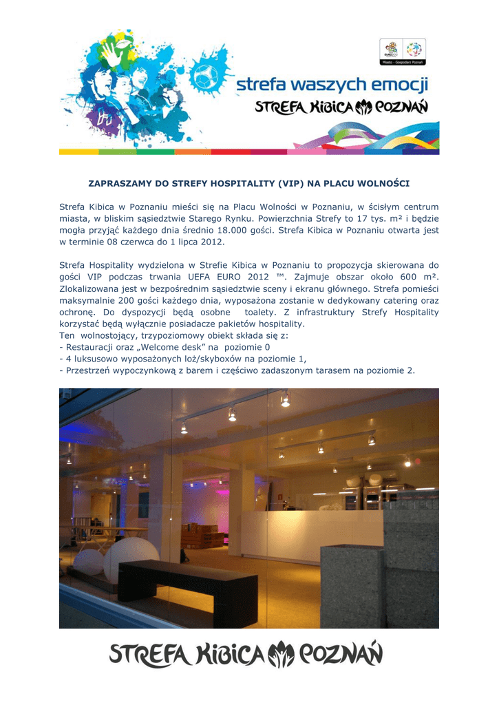 ZAPRASZAMY DO STREFY HOSPITALITY (VIP) NA PLACU WOLNOŚCI Strefa Kibica w Poznaniu mieści się na Placu Wolności w Poznaniu, w ścisłym centrum miasta, w bliskim sąsiedztwie Starego Rynku. Powierzchnia Strefy to 17 tys. m² i będzie mogła przyjąć każdego dnia średnio 18.000 gości. Strefa Kibica w Poznaniu otwarta jest w terminie 08 czerwca do 1 lipca 2012. Strefa Hospitality wydzielona w Strefie Kibica w Poznaniu to propozycja skierowana do gości VIP podczas trwania UEFA EURO 2012 ™. Zajmuje obszar około 600 m². Zlokalizowana jest w bezpośrednim sąsiedztwie sceny i ekranu głównego. Strefa pomieści maksymalnie 200 gości każdego dnia, wyposażona zostanie w dedykowany catering oraz ochronę. Do dyspozycji będą osobne toalety. Z infrastruktury Strefy Hospitality korzystać będą wyłącznie posiadacze pakietów hospitality. Ten wolnostojący, trzypoziomowy obiekt składa się z: - Restauracji oraz „Welcome desk” na poziomie 0 - 4 luksusowo wyposażonych loż/skyboxów na poziomie 1, - Przestrzeń wypoczynkową z barem i częściwo zadaszonym tarasem na poziomie 2. Cała strefa zostanie wykonana z dbałością o szczegóły oraz ekologię i design, która przyświeca koncepcji stworzenia Strefy Hospitality. Wnętrza wyposażone będą w nowoczesny sprzęt mulitmedialny. Niezwykle ważnym elementem będzie także najwyższej klasy obsługa oraz dbałość o bezpieczeństwo gości. W dni meczowe goście będą mogli oglądać transmisję meczów oraz korzystać z dodatkowych atrakcji w godzinach od 15.00 – 02.00, w pozostałe dni w godzinach od 15.00 do 24.00 Istotnym elementem funkcjonowania Strefy VIP jest również dbałość o środowisko naturalne. Operator wprowadzi na terenie całej Strefy, w tym również w strefie VIP specjalną segregację odpadów. Oferta - PAKIETY Pakiety zostały przygotowane w oparciu o analizę atrakcyjności meczów oraz innych wydarzeń odbywających się na strefie. Wzięte zostały także pod uwagę uwarunkowania meczów odbywających się w Poznaniu oraz meczów Polaków, a także półfinałów i finałów. W oparciu o dokładną analizę wyróżniono poszczególne pakiety. Założono także dodanie dodatkowych pakietów, stworzonych z troską o zaproszenie gości do strefy także w dni mniej atrakcyjne pod względem piłkarskim , a interesujące pod kątem programu aktywizacji. 1. Pakiet PLATINUM DAY Pakiet ten oferuje własną, dedykowaną lożę na okres jednego wybranego dnia, bez możliwości jej adaptacji. Loża posiada wysoki standard wykończenia i wyposażenia. Każda z lóż ma przypisaną sobie, dedykowaną obsługę w zakresie cateringu. Posiadacz pakietu otrzyma określoną liczbę biletów (odpowiadającą ilości miejsc w loży) na dany dzień oraz jednodniowy pakiet miejsc parkingowych. 3. Pakiet PLATINUM DAY - cała strefa VIP Pakiet umożliwia ekspozycję materiałów reklamowych w całej strefie VIP, w konkretnym, uzgodnionym wcześniej dniu. Tego dnia klient ma możliwość ekspozycji i prowadzenia działań promocyjnych w obszarze strefy VIP. Takie rozwiązanie pozwala klientom zaistnieć bądź ugruntować swoją pozycję wśród gości VIP, którzy bardzo często są obecnymi bądź potencjalnymi klientami czy kontrahentami. Ekspozycja materiałów reklamowych czy katalogów produktowych pozwala na nawiązanie niezwykle cennych kontaktów biznesowych, których efekty będzie można konsumować również po zakończeniu mistrzostw. W pakiecie PLATINUM DAY - cała strefa VIP klient otrzymuje bilety do swojej loży, jak również określoną pulę biletów do strefy VIP. W skład pakietu wchodzi również jednodniowy pakiet miejsc parkingowych. 4. Pakiet GOLD ALL Jednoosobowe, nieimienne zaproszenie umożliwiające przebywanie w strefie VIP, z wyłączeniem loży, w trakcie całych Mistrzostw. Posiadacz pakietu GOLD DAY ma dostęp do wszystkich atrakcji strefy VIP z wyłączeniem poziomu 1. Obecność w strefie VIP, czyli przynależność do niezwykle elitarnej grupy gości, daje posiadaczowi takiego pakietu nieograniczone możliwości nawiązania kontaktów biznesowych. 5. Pakiet GOLD DAY Jednoosobowe zaproszenie umożliwiające przebywanie w strefie VIP, z wyłączeniem loży, w trakcie jednego dnia. 6. Pakiet GOLD EXTENDED Jednoosobowe czterodniowe zaproszenie umożliwiające przebywanie w strefie VIP, z wyłączeniem loży, w trakcie jednego dnia. Dodatkowym atutem pakietu jest możliwość kibicowania na stadionie oraz w sterfie Kibica. Właściciel pakietu otrzymuje bilet na jeden z meczy UEFA EURO 2012TM na stadionie przy ul. Bułgarskiej w Poznaniu. W zależności od wybranego biletu na mecz pakiet GOLD EXTENDED jest dostępny w następujących opcjach: • 1 opcja - Pakiet GOLD DAY w dniach 8,9,10,11 czerwca - bilet na mecz Irlandia–Chorwacja dnia 10 czerwca o godz. 20.45 • 2 opcja - Pakiet GOLD DAY w dniach 14,15,16,17 czerwca - bilet na mecz Włochy – Chorwacja dnia 14 czerwca o godz. 18.00 • 3 opcja - Pakiet GOLD DAY w dniach 15,16,17,18 czerwca - bilet na mecz Włochy – Irlandia dnia 18 czerwca o godz.20.45 Pakiet oprócz atrakcji sportowych proponuje spędzenie w Poznaniu na przykład weekendu, który obejmuje nie tylko atrakcyjne mecze, ale także dodatkowe wyjątkowe wydarzenia, jak koncerty czy inne formy aktywizacji. Z poważaniem, Anna Majchrzycka Koordynator ds. Hospitality Strefy Kibica w Poznaniu Rezerwacje miejsc w Strefie Hospitality: +48 665 230 845 e-mail: [email protected] szczegóły: www.poznan.pl/uefaeuro2012/strefakibica