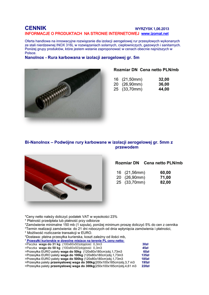 CENNIK WYRZYSK 1,06.2013 INFORMACJE O PRODUKTACH NA STRONIE INTERNETOWEJ www.izomat.net Oferta handlowa na innowacyjne rozwiązanie dla izolacji aerogelowej rur przesyłowych wykonanych ze stali nierdzewnej INOX 316L w rozwiązaniach solarnych, ciepłowniczych, gazowych i sanitarnych. Poniżej grupy produktów, które jestem wstanie zaproponować w cenach obecnie najniższych w Polsce. NanoInox - Rura karbowana w izolacji aerogelowej gr. 5m Rozmiar DN Cena netto PLN/mb 16 (21,50mm) 20 (26,90mm) 25 (33,70mm) 32,00 36,00 44,00 Bi-NanoInox – Podwójne rury karbowane w izolacji aerogelowej gr. 5mm z przewodem Rozmiar DN Cena netto PLN/mb 16 (21,56mm) 20 (26,90mm) 25 (33,70mm) 60,00 71,00 82,00 *Ceny netto należy doliczyć podatek VAT w wysokości 23% * Płatność przedpłata lub płatność przy odbiorze *Zamówienie minimalne 150 mb (1 szpula), poniżej minimum proszę doliczyć 5% do cen z cennika *Termin realizacji zamówienia: do 21 dni roboczych od dnia wpłynięcia zamówienia i płatności, * Możliwość rozliczanie transakcji w EURO. *Dostawa: płatna przesyłka kurierska, koszt zależny od ilości mb, * Przesyłki kurierskie w dowolne miejsce na terenie PL ceny netto: >Paczka waga do 31 kg (100x60x50)objętość 0,3m3 >Paczka waga do 50 kg (100x60x50)objętość 0,3m3 >Przesyłka EURO palety waga do 50kg (120x80x180cm)obj.1,73m3 >Przesyłka EURO palety waga do 100kg (120x80x180cm)obj.1,73m3 >Przesyłka EURO palety waga do 500kg (120x80x180cm)obj.1,73m3 >Przesyłka palety przemysłowej waga do 300kg(200x100x185cm)obj.3,7 m3 >Przesyłka palety przemysłowej waga do 300kg(250x100x185cm)obj.4,61 m3 30zł 45zł 60zł 135zł 185zł 195zł 220zł >Przesyłka palety przemysłowej waga do 300kg(300x100x185cm)obj.5,55 m3 >Przesyłka palety przemysłowej waga do 300kg(200x120x185cm)obj.4,44 m3 >Przesyłka palety przemysłowej waga do 300kg(250x120x185cm)obj.5,55 m3 >Przesyłka palety przemysłowej waga do 300kg(300x120x185cm)obj.6,66 m3 >Za każde 100kg powyżej 300kg dopłata >Przygotowanie przesyłki + karton (1 szt. )100x50x60cm = 0,3m3 >Przygotowanie przesyłki paletowej opakowanie +paleta >Płatność pobranie przez kuriera COD >Przesyłka zagraniczna do 10 kg, 0,30m3 od >Przesyłka zagraniczna do 31,50 kg, 0,30m3 od >Ważność oferty: 30 dni 260zł 225zł 250zł 290zł 20zł 25zł 85zł 10zł 28EUR 35EUR Zapraszamy do współpracy: IZOMAT Andrzej Mickiewicz POLSKA, 89-300 Wyrzysk, ul. Staszica 14 (biuro handlowe) ul. Przemysłowa 5 (produkcja, magazyn) NIP: PL 7641742638, REGON: 570106620 Tel.: 67 2862789, mob: 695643483, Fax: 67 2867274 E-mail: [email protected], E-mail: [email protected], http://www.izomat.net