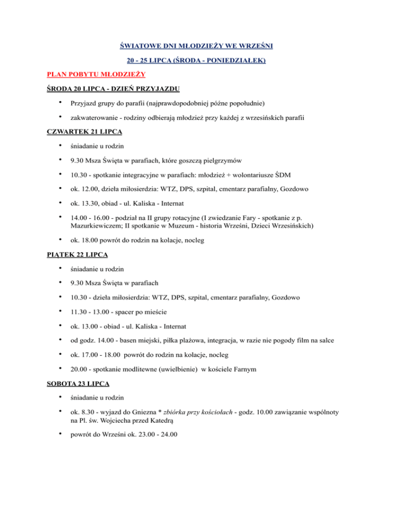ŚWIATOWE DNI MŁODZIEŻY WE WRZEŚNI 20 - 25 LIPCA (ŚRODA - PONIEDZIAŁEK) PLAN POBYTU MŁODZIEŻY ŚRODA 20 LIPCA - DZIEŃ PRZYJAZDU • Przyjazd grupy do parafii (najprawdopodobniej późne popołudnie) • zakwaterowanie - rodziny odbierają młodzież przy każdej z wrzesińskich parafii CZWARTEK 21 LIPCA • śniadanie u rodzin • 9.30 Msza Święta w parafiach, które goszczą pielgrzymów • 10.30 - spotkanie integracyjne w parafiach: młodzież + wolontariusze ŚDM • ok. 12.00, dzieła miłosierdzia: WTZ, DPS, szpital, cmentarz parafialny, Gozdowo • ok. 13.30, obiad - ul. Kaliska - Internat • 14.00 - 16.00 - podział na II grupy rotacyjne (I zwiedzanie Fary - spotkanie z p. Mazurkiewiczem; II spotkanie w Muzeum - historia Wrześni, Dzieci Wrzesińskich) • ok. 18.00 powrót do rodzin na kolacje, nocleg PIĄTEK 22 LIPCA • śniadanie u rodzin • 9.30 Msza Święta w parafiach • 10.30 - dzieła miłosierdzia: WTZ, DPS, szpital, cmentarz parafialny, Gozdowo • 11.30 - 13.00 - spacer po mieście • ok. 13.00 - obiad - ul. Kaliska - Internat • od godz. 14.00 - basen miejski, piłka plażowa, integracja, w razie nie pogody film na salce • ok. 17.00 - 18.00 powrót do rodzin na kolacje, nocleg • 20.00 - spotkanie modlitewne (uwielbienie) w kościele Farnym SOBOTA 23 LIPCA • śniadanie u rodzin • ok. 8.30 - wyjazd do Gniezna * zbiórka przy kościołach - godz. 10.00 zawiązanie wspólnoty na Pl. św. Wojciecha przed Katedrą • powrót do Wrześni ok. 23.00 - 24.00 NIEDZIELA 24 LIPCA • śniadanie u rodzin • w godzinach południowych Uroczyste Msze Święte w parafiach, które goszczą pielgrzymów • uroczysty obiad u rodzin • 16.00 - 19.00 wspólne spotkanie dla gości, wolontariuszy oraz rodzin ich przyjmujących na Nowym Folwarku wraz z władzami samorządowymi (część artystyczna przygotowana na 2h występu, grill, ognisko itp. ) PONIEDZIAŁEK 25 LIPCA - DZIEŃ WYJAZDU: • śniadanie u rodzin • 9.30 - Msza Święta w parafiach • wydanie prowiantu w parafiach • 11.00 - wyjazd do Krakowa
