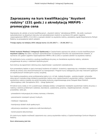 Polski Instytut Mediacji i Integracji Społecznej Zapraszamy na kurs kwalifikacyjny "Asystent rodziny" (231 godz.) z akredytacją MRPiPS promocyjna cena Zapraszamy do udziału w kursie kwalifikacyjnym ,,Asystent rodziny" (akredytacja MPiPS) - dla osób z wyższym wykształceniem na dowolnym kierunku lub wykształceniem średnim w wymiarze 231 godzin (zgodnie rozporządzeniem MPiPS z 9.12.2011 w sprawie szkoleń na asystenta rodziny, posiadamy zgodę Departamentu Polityki Rodziny na prowadzenie takich szkoleń). Trwają zapisy na kolejną (XIV) edycję kursu (11.03.2017 r. – 25.06.2017 r.). Polski Instytut Mediacji i Integracji Społecznej w Częstochowie zaprasza do udziału w kursie kwalifikacyjnym Asystent rodziny dla osób z wyższym wykształceniem na dowolnym kierunku lub wykształceniem średnim, w wymiarze 231 godzin (zgodnie rozporządzeniem MPiPS z 09.12.2011 w sprawie szkoleń na asystenta rodziny). Po ukończeniu kursu uczestnicy uzyskują kwalifikacje do pracy w charakterze asystenta rodziny, szkolenie przygotowuje do pracy z rodzinami dysfunkcyjnymi. Kurs kończy się egzaminem (obroną pracy dyplomowej) i uzyskaniem zaświadczenia. Kurs prowadzony będzie w ujęciu koncepcji budzenia sił ludzkich. Uczestnicy zapoznają się z metodami motywującymi klienta do zmiany oraz skoncentrowanymi na rozwiązaniach. Program kursu wzbogacony jest więc treściami zgodnymi ze współczesnymi tendencjami w pracy socjalnej. Kurs będzie prowadzony przez profesjonalną kadrę m.in. dr hab. Izabelą Krasiejko - autorkę książek i artykułów dotyczących metodycznego działania asystentów rodziny oraz częstochowskich asystentów rodziny. Częstochowska asystentura rodziny znalazła się wśród laureatów konkursu organizowanego przez Związek Miast Polskich „Samorządowy Lider Zarządzania 2011 – Usługi Społeczne“. W trakcie kursu osoby w nim uczestniczące zdobędą wiedzę i umiejętności niezbędne asystentowi rodziny do pracy z rodziną z wieloma problemami (ubóstwo, bezrobocie, uzależnienia, przemoc, niepełnosprawność, choroba przewlekła), takie jak.: - prowadzenie motywującej do zmiany rozmowy z klientem, - poszukiwanie rozwiązań sytuacji trudnych, - mediacje i negocjacje, - koordynacja działań służb społecznych, - aktywizacja zawodowa i społeczna osób bezrobotnych, - konstruowanie dokumentacji. W czasie kursu będzie możliwość zapoznania się z pracą asystentów rodziny z Częstochowskiego Centrum Wsparcia Rodziny. Kurs skierowany jest do: 1 Polski Instytut Mediacji i Integracji Społecznej Osób przygotowujących się do roli zawodowej asystenta rodziny, posiadających wykształcenie średnie lub wykształcenie wyższe na kierunkach innych niż wymienione w art. 12 ust.1 p. pkt a ustawy z dnia 9 czerwca 2011 r. o wspieraniu rodziny i systemie pieczy zastępczej (Dz.U. Nr 149, poz.887) tj.: praca socjalna, socjologia, pedagogika. Zajęcia będą prowadzone przez wyspecjalizowaną kadrę: dr hab. Izabela Krasiejko - adiunkt w Zakładzie Pracy Socjalnej Akademii im. J. Długosza, konsultant metodyczny i asystent rodziny w Miejskim Ośrodku Pomocy Społecznej w Częstochowie, konsultant Podejścia Skoncentrowanego na Rozwiązaniach (szkolenie zaawansowane), autorka książki Metodyka działania asystenta rodziny (www.slaskwn.com.pl), książki Praca socjalna w praktyce asystenta rodziny (www.slaskwn.com.pl), Zawód asystenta rodziny w procesie profesjonalizacji. Wstęp do teorii i praktyki nowej profesji społecznej (www.weakapit.pl). dr Edyta Widawska - adiunkt w Zakładzie Teorii Wychowania Uniwersytetu Śląskiego w Katowicach, animatorka społeczna, trenerka umiejętności miękkich, mediator, konsultant Podejścia Skoncentrowanego na Rozwiązaniach (szkolenie zaawansowane). dr Zbigniew Wieczorek - adiunkt w Zakładzie Pedagogiki Społecznej i Terapii Pedagogicznej Akademii im. J. Długosza, posiada ukończone szkolenia dotyczące terapii w ujęciu różnych szkół terapeutycznych m.in. Podejścia Skoncentrowanego na Rozwiązaniach (szkolenie zaawansowane), NLP, terapii komunikacyjnej, poznawczo – behawioralnej. dr Agnieszka Miklewska – adiunkt w Zespole Badawczym Psychologii Stosowanej Akademii im. J.Długosza, psychoterapeuta, konsultant PSR (szkolenie zaawansowane), pełniła funkcję eksperta ds. wsparcia psychologicznego i oceny predyspozycji zawodowych przy Programie Aktywizacji Zawodowej Osób Niepełnosprawnych „Kroki ku pracy”. dr Sylwia Kita – adiunkt w Zakładzie Pedagogiki Społecznej i Terapii Pedagogicznej Akademii im. J. Długosza, mgr Monika Podgórska – psychoterapeuta, mediator, coach mgr Alina Kula - Kurator Okręgowy Sądu Okręgowego w Częstochowie mgr Lidia Zeller - mgr pedagogiki, Prezes Stowarzyszenie na rzecz pomocy dziecku i rodzinie ,,DLA RODZINY”, Kierownik Częstochowskiego Centrum Wsparcia Rodziny, w latach 2002 – 2011 Zastępca Dyrektora ds. Świadczeń Pomocy Społecznej w MOPS w Częstochowie. mgr Anna Imielińska – asystent rodziny mgr Beata Wawrzyńczak – specjalista terapii uzależnień. Informacje organizacyjne: Miejsce zajęć – Częstochowa Czas trwania kursu - 231 godzin (w tym 30 godzin praktyk) Termin kursu – 11.03.2017 r. – 25.06.2017 r. Terminy zjazdów: I zjazd: 11-12.03.2017 r. II zjazd: 24-26.03.2017 r. III zjazd: 08-09.04.2017 r. IV zjazd: 21-23.04.2017 r. 2 Polski Instytut Mediacji i Integracji Społecznej V zjazd: 06-07.05.2017 r. VI zjazd: 19-21.05.2017 r. VII zjazd: 10-11.06.2017 r. VIII zjazd (zakończony obroną pracy dyplomowej): 23-25.06.2017 r. Zajęcia praktyczne: termin do ustalenia Promocyjne ceny kursu! - dla uczestników indywidualnych (osób fizycznych) – 1845,00 zł brutto (1500 zł netto + 23%VAT ) - dla uczestników, których udział finansowany jest ze środków publicznych cena wynosi 1845,00 zł netto (VAT zwolniony - zgodnie z art. 43 ust. 1 pkt. 29c ustawy o VAT). Cena obejmuje - zajęcia, materiały szkoleniowe, przerwę kawową. Uczestnik sam p