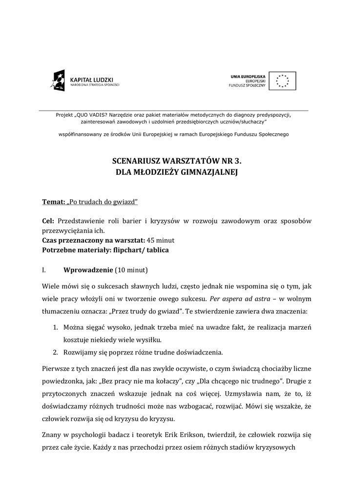 Projekt „QUO VADIS? Narzędzie oraz pakiet materiałów metodycznych do diagnozy predyspozycji, zainteresowań zawodowych i uzdolnień przedsiębiorczych uczniów/słuchaczy” współfinansowany ze środków Unii Europejskiej w ramach Europejskiego Funduszu Społecznego SCENARIUSZ WARSZTATÓW NR 3. DLA MŁODZIEŻY GIMNAZJALNEJ Temat: „Po trudach do gwiazd” Cel: Przedstawienie roli barier i kryzysów w rozwoju zawodowym oraz sposobów przezwyciężania ich. Czas przeznaczony na warsztat: 45 minut Potrzebne materiały: flipchart/ tablica I. Wprowadzenie (10 minut) Wiele mówi się o sukcesach sławnych ludzi, często jednak nie wspomina się o tym, jak wiele pracy włożyli oni w tworzenie owego sukcesu. Per aspera ad astra – w wolnym tłumaczeniu oznacza: „Przez trudy do gwiazd”. Te stwierdzenie zawiera dwa znaczenia: 1. Można sięgać wysoko, jednak trzeba mieć na uwadze fakt, że realizacja marzeń kosztuje niekiedy wiele wysiłku. 2. Rozwijamy się poprzez różne trudne doświadczenia. Pierwsze z tych znaczeń jest dla nas zwykle oczywiste, o czym świadczą chociażby liczne powiedzonka, jak: „Bez pracy nie ma kołaczy”, czy „Dla chcącego nic trudnego”. Drugie z przytoczonych znaczeń wskazuje jednak na coś więcej. Uzmysławia nam, że to, iż doświadczamy różnych trudności może nas wzbogacać, rozwijać. Mówi się wszakże, że człowiek rozwija się od kryzysu do kryzysu. Znany w psychologii badacz i teoretyk Erik Erikson, twierdził, że człowiek rozwija się przez całe życie. Każdy z nas przechodzi przez osiem różnych stadiów kryzysowych Projekt „QUO VADIS? Narzędzie oraz pakiet materiałów metodycznych do diagnozy predyspozycji, zainteresowań zawodowych i uzdolnień przedsiębiorczych uczniów/słuchaczy” współfinansowany ze środków Unii Europejskiej w ramach Europejskiego Funduszu Społecznego począwszy od narodzin (Tabela 1). Na każdym z tych etapów pojawia się konflikt, jakaś dominująca w życiu trudność, którą należy pokonać, aby się rozwijać i przejść „do następnego etapu”. Tabela 1. Kolejne etapy rozwoju psychospołecznego wg E.H. Eriksona (opacowane na podstawie: Brzezińska, A., 2004).1 Etap i wiek Cel rozwoju Okres niemowlęcy (0-1 rok) Rodzaj kryzysu Bazowa ufność a brak bazowej ufności Wczesne dzieciństwo (2-3 lata) Autonomia a wstyd i wątpliwości Wiek zabawy (4-5 lat) Wiek szkolny (6-12 lat) 11 Główna cnota Nadzieja Główny proces Wzajemność i wymiana Źródła zagrożeń Rodzice, jeśli niedostateczni e dbają o potrzeby dziecka Osiągnięcie samokontroli i poczucie własnej odrębności Wola Imitacja, naśladowanie i uczenie się Program/ działania podejmowane w żłobku i przedszkolu Inicjatywa a poczucie winy Zorientowanie na cel oraz inicjatywa w działaniu Przedsiębiorczość Identyfikacja – rozpoznawanie siebie „w oczach” innych Mass media (telewizja, komputer) Produktyw ność a poczucie niższości Osiągnięcie poczucia własnej kompetencji Kompetencja Edukacja Szkoła/ wychowanie seksualne Osiągnięcie zaufania do opiekuna Brzezińska, A. (2007). Społeczna psychologia rozwoju. Warszawa: Wydawnictwo Scholar. Wczesna adolescencja (13-17 lat) późna adolescencja (18-22 lata) Wczesna dorosłość (23-34 lata) Tożsamość grupowa a alienacja Tożsamość indywidualna a dyfuzja ról Intymność a izolacja Odnalezienie odpowiedzi na pytania: kim jestem? i kim mogę być? Wierność sobie Osiągniecie zdolności do miłości bez utraty własnej tożsamości Wierność Nacisk rówieśników Alkoholizm, narkomania Miłość Wzajemność między rówieśnikami Rozwód Średnia dorosłość (35-60 lat) Generatyw ność a stagnacja Potrzeba opiekowania się i troska o los młodszych generacji Troska Dopasowanie osoba – środowisko i twórczość Starzejący się rodzice Późna dorosłość (powyżej 61 lat) Integralność vs desperacja i rozpacz Osiągniecie mądrości życiowej w wyniku pozytywnego bilansu życia Mądrość Introspekcja, zwrócenie ku wartościom (uwewnętrznio nym) „Krucha” starość a opieka otoczenia Na początku życia człowiek zdobywa poczucie zaufania do otoczenia, matki, ojca, osób najbliższych, od których jest zależny. Inaczej by nie przetrwał. Kolejno stawia pierwsze kroki, uczy się mówić i to już jest podstawą do tego, żeby móc kontaktować się z innymi. Początkowo jest to zabawa, która jest dla formą pracy dla dziecka. W ramach tych zabaw - w sklep, lekarza czy ogrodnika, dziecko przejawia już pierwsze zainteresowania określonymi czynnościami, zadaniami. To może być zalążek preferencji zawodowych w życiu dorosłych. Chociaż kto z nas nie chciał zostać w wieku przedszkolnym strażakiem, policjantem albo pielęgniarką?! Nie oznacza to, że w wieku dorosłym będziemy pracować dokładnie w tych zawodach, jednak może jakieś elementy środowiska naszej pracy, bądź naszych preferencji będą odnosić się do tych pierwszych zabaw? Przykładowo, ktoś, kto w dzieciństwie chciał zostać policjantem dzisiaj może chcieć studiować prawo i zostać prokuratorem. Przedszkolna pielęgniarka dzisiaj może zamienić się w psychoterapeutę, a ogrodnik w architekta zieleni miejskiej… Projekt „QUO VADIS? Narzędzie oraz pakiet materiałów metodycznych do diagnozy predyspozycji, zainteresowań zawodowych i uzdolnień przedsiębiorczych uczniów/słuchaczy” współfinansowany ze środków Unii Europejskiej w ramach Europejskiego Funduszu Społecznego Zadanie 1. (15 minut) „KIEDY ZNÓW BĘDĘ DZIECKIEM…” KROK 1: Poproszenie o dobranie się Uczestników w pary lub 3-4-osobowe grupki. KROK 2: Przekazanie poniżej instrukcji Proszę, abyście na chwilę spróbowali się cofnąć waszą pamięcią do okresu przedszkolnego i wczesnoszkolnego. Czy pamiętacie, kim wówczas chcieliście zostać? W co bawiliście się przede wszystkim? Jakie zabawy wam odpowiadały najbardziej? Kiedy już sobie przypomnicie, postarajcie