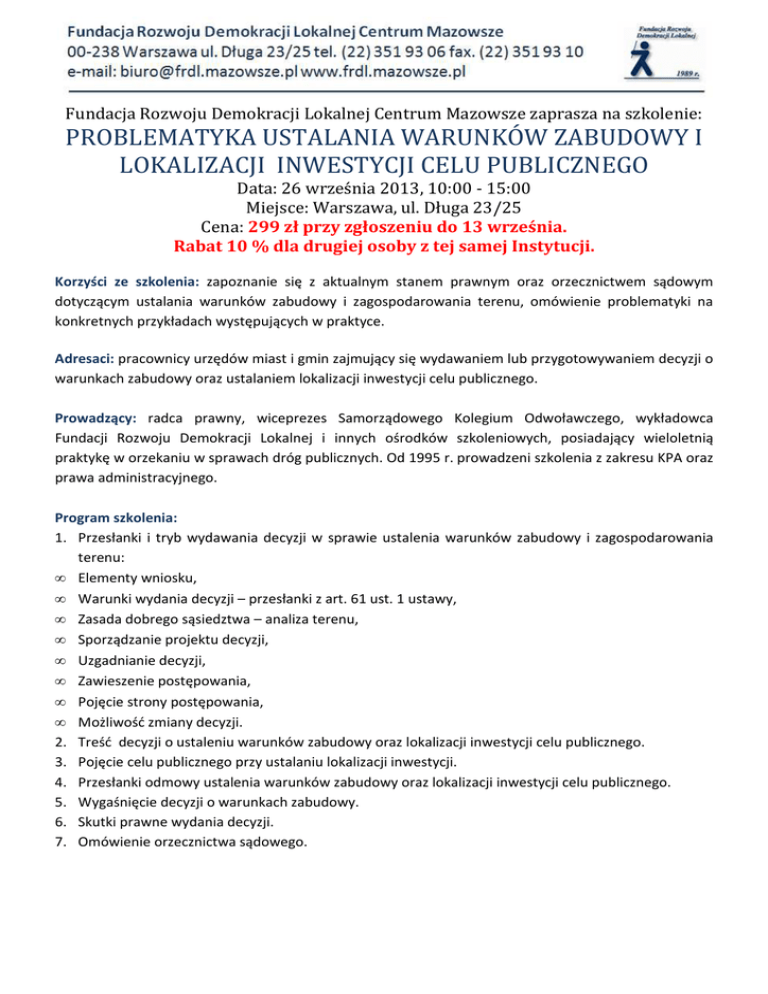 Fundacja Rozwoju Demokracji Lokalnej Centrum Mazowsze zaprasza na szkolenie: PROBLEMATYKA USTALANIA WARUNKÓW ZABUDOWY I LOKALIZACJI INWESTYCJI CELU PUBLICZNEGO Data: 26 września 2013, 10:00 - 15:00 Miejsce: Warszawa, ul. Długa 23/25 Cena: 299 zł przy zgłoszeniu do 13 września. Rabat 10 % dla drugiej osoby z tej samej Instytucji. Korzyści ze szkolenia: zapoznanie się z aktualnym stanem prawnym oraz orzecznictwem sądowym dotyczącym ustalania warunków zabudowy i zagospodarowania terenu, omówienie problematyki na konkretnych przykładach występujących w praktyce. Adresaci: pracownicy urzędów miast i gmin zajmujący się wydawaniem lub przygotowywaniem decyzji o warunkach zabudowy oraz ustalaniem lokalizacji inwestycji celu publicznego. Prowadzący: radca prawny, wiceprezes Samorządowego Kolegium Odwoławczego, wykładowca Fundacji Rozwoju Demokracji Lokalnej i innych ośrodków szkoleniowych, posiadający wieloletnią praktykę w orzekaniu w sprawach dróg publicznych. Od 1995 r. prowadzeni szkolenia z zakresu KPA oraz prawa administracyjnego. Program szkolenia: 1. Przesłanki i tryb wydawania decyzji w sprawie ustalenia warunków zabudowy i zagospodarowania terenu: • Elementy wniosku, • Warunki wydania decyzji – przesłanki z art. 61 ust. 1 ustawy, • Zasada dobrego sąsiedztwa – analiza terenu, • Sporządzanie projektu decyzji, • Uzgadnianie decyzji, • Zawieszenie postępowania, • Pojęcie strony postępowania, • Możliwość zmiany decyzji. 2. Treść decyzji o ustaleniu warunków zabudowy oraz lokalizacji inwestycji celu publicznego. 3. Pojęcie celu publicznego przy ustalaniu lokalizacji inwestycji. 4. Przesłanki odmowy ustalenia warunków zabudowy oraz lokalizacji inwestycji celu publicznego. 5. Wygaśnięcie decyzji o warunkach zabudowy. 6. Skutki prawne wydania decyzji. 7. Omówienie orzecznictwa sądowego. ZGŁOSZENIE PROBLEMATYKA USTALANIA WARUNKÓW ZABUDOWY I LOKALIZACJI INWESTYCJI CELU PUBLICZNEGO Data: 26 września 2013, 10:00 - 15:00 Miejsce: Warszawa, ul. Długa 23/25 Cena: 299 zł przy zgłoszeniu do 13 września. Rabat 10 % dla drugiej osoby z tej samej Instytucji. Instytucja: ........................................................................................................................... Adres: ................................................................................................................................. NIP: ..................................................................................................................................... L.p. Imię i nazwisko Wydział tel. e-mail 1.......................................................................................................................................... 2.......................................................................................................................................... 3.......................................................................................................................................... ........................................................... podpis i pieczątka osoby delegującej Zgłoszenie na szkolenie Zgłoszenia prosimy przesyłać do 19 września 2013 r. fax: (22) 351 93 10, e-mail: [email protected] lub wybrać opcje zapisu przez stronę www.frdl.mazowsze.pl Przy zgłoszeniu w ramach Forów prosimy o wpisanie w uwagach: „Zgłoszenie w ramach Forum (nazwa odpowiedniego Forum)”. Ewentualną rezygnację ze szkolenia można zgłosić najpóźniej na dwa dni przed szkoleniem. W przypadku niewykorzystania zgłoszonego uczestnictwa - Urząd będzie zobowiązany do sfinansowania 60% odpłatności za uczestnictwo i materiały. FRDL zastrzega sobie prawo odwołania szkolenia. Miejsce szkolenia: Warszawa, ul. Długa 23/25, Sala Konferencyjna FRDL, III piętro. Dojazd: Metrem do stacji Ratusz Arsenał lub autobusami 116, 178, 180, 222, 503 do przystanku Plac Krasińskich. Cena: 299 zł netto przy zgłoszeniu do 13 września. Cena po 13 września to 350 zł. Rabat 10 % dla drugiej osoby z tej samej Instytucji. Zwolnienie z VAT w przypadku finansowania ze środków publicznych. W cenie materiały szkoleniowe, zaświadczenie, lunch oraz przerwy kawowe. Płatność przelewem, na podstawie faktury wystawionej w dniu szkolenia.