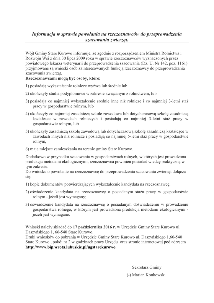 Informacja w sprawie powołania na rzeczoznawców do przeprowadzenia szacowania zwierząt. Wójt Gminy Stare Kurowo informuje, że zgodnie z rozporządzeniem Ministra Rolnictwa i Rozwoju Wsi z dnia 30 lipca 2009 roku w sprawie rzeczoznawców wyznaczonych przez powiatowego lekarza weterynarii do przeprowadzenia szacowania (Dz. U. Nr 142, poz. 1161) przyjmowane są wnioski osób zainteresowanych funkcją rzeczoznawcy do przeprowadzania szacowania zwierząt. Rzeczoznawcami mogą być osoby, które: 1) posiadają wykształcenie rolnicze wyższe lub średnie lub 2) ukończyły studia podyplomowe w zakresie związanym z rolnictwem, lub 3) posiadają co najmniej wykształcenie średnie inne niż rolnicze i co najmniej 3-letni staż pracy w gospodarstwie rolnym, lub 4) ukończyły co najmniej zasadniczą szkołę zawodową lub dotychczasową szkołę zasadniczą kształcące w zawodach rolniczych i posiadają co najmniej 3-letni staż pracy w gospodarstwie rolnym, lub 5) ukończyły zasadniczą szkołę zawodową lub dotychczasową szkołę zasadniczą kształcące w zawodach innych niż rolnicze i posiadają co najmniej 5-letni staż pracy w gospodarstwie rolnym, 6) mają miejsce zamieszkania na terenie gminy Stare Kurowo. Dodatkowo w przypadku szacowania w gospodarstwach rolnych, w których jest prowadzona produkcja metodami ekologicznymi, rzeczoznawca powinien posiadać wiedzę praktyczną w tym zakresie. Do wniosku o powołanie na rzeczoznawcę do przeprowadzenia szacowania zwierząt dołącza się: 1) kopie dokumentów potwierdzających wykształcenie kandydata na rzeczoznawcę; 2) oświadczenie kandydata na rzeczoznawcę o posiadanym stażu pracy w gospodarstwie rolnym - jeżeli jest wymagany; 3) oświadczenie kandydata na rzeczoznawcę o posiadanym doświadczeniu w prowadzeniu gospodarstwa rolnego, w którym jest prowadzona produkcja metodami ekologicznymi jeżeli jest wymagane. . Wnioski należy składać do 17 października 2016 r. w Urzędzie Gminy Stare Kurowo ul. Daszyńskiego 1, 66-540 Stare Kurowo. Druki wniosków do pobrania w Urzędzie Gminy Stare Kurowo ul. Daszyńskiego 1,66-540 Stare Kurowo , pokój nr 2 w godzinach pracy Urzędu oraz stronie internetowej pod adresem http://www.bip.wrota.lubuskie.pl/ugstarekurowo. Sekretarz Gminy (-) Marian Konkowski OŚWIADCZENIE Ja, niżej podpisany/a ………………………………………………………………………………………………… zamieszkały/a ………………………………………………………………………………………………… gmina ……………………………………województwo………………………..…………… legitymujący/a się dowodem osobistym seria………………………numer…………………… wydanym przez………………………………………………………………………………… oświadczam że: - jestem właścicielem gospodarstwa rolnego położonego w ………………………………… o powierzchni………………………….ha użytków rolnych, - osobiście prowadzę gospodarstwo rolne od dnia ……………………..do dnia……………… - pracowałem/am w gospodarstwie rolnym w okresie od…………………………do………………………… ……………………………… ……………………………… (miejscowość i data) (podpis składającego oświadczenia) Stare Kurowo, dnia ……………………... ……………………………………………… ……………………………………………… ……………………………………………… ……………………………………………… (imię i nazwisko, adres zamieszkania, tel. kontaktowy) WÓJT GMINY STARE KUROWO Zwracam się z wnioskiem o powołanie mnie na rzeczoznawcę w celu szacowania zwierząt, produktów pochodzenia zwierzęcego i sprzętu, zgodnie z wymaganiami zawartymi w Rozporządzeniu Ministra Rolnictwa i Rozwoju Wsi z dnia 30 lipca 2009r. w sprawie rzeczoznawców wyznaczonych przez Powiatowego Lekarza Weterynarii do przeprowadzenia szacowania (Dz. U. z 2009r. Nr 142, poz. 1161). Oświadczam, że spełniam wymagania zawarte w §2. ust.1 w/w rozporządzenia tj. posiadam wykształcenie ……………………………….……… i jestem mieszkańcem gm. Stare Kurowo. ………………………………………….. (podpis) Załączniki : - kopia dokumentu potwierdzającego wykształcenie - oświadczenie o posiadaniu gospodarstw rolnego i stażu pracy w gospodarstwie rolnym